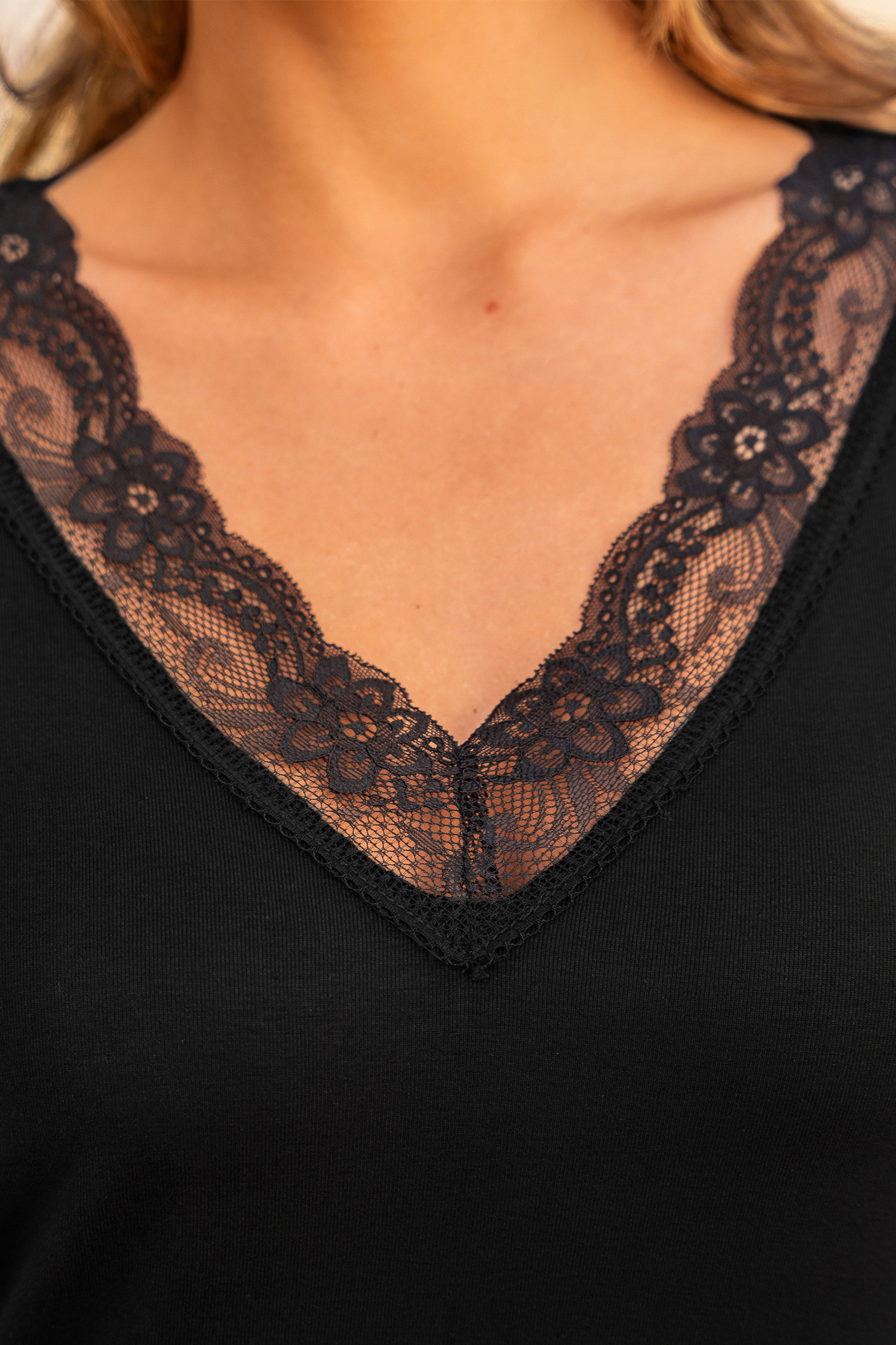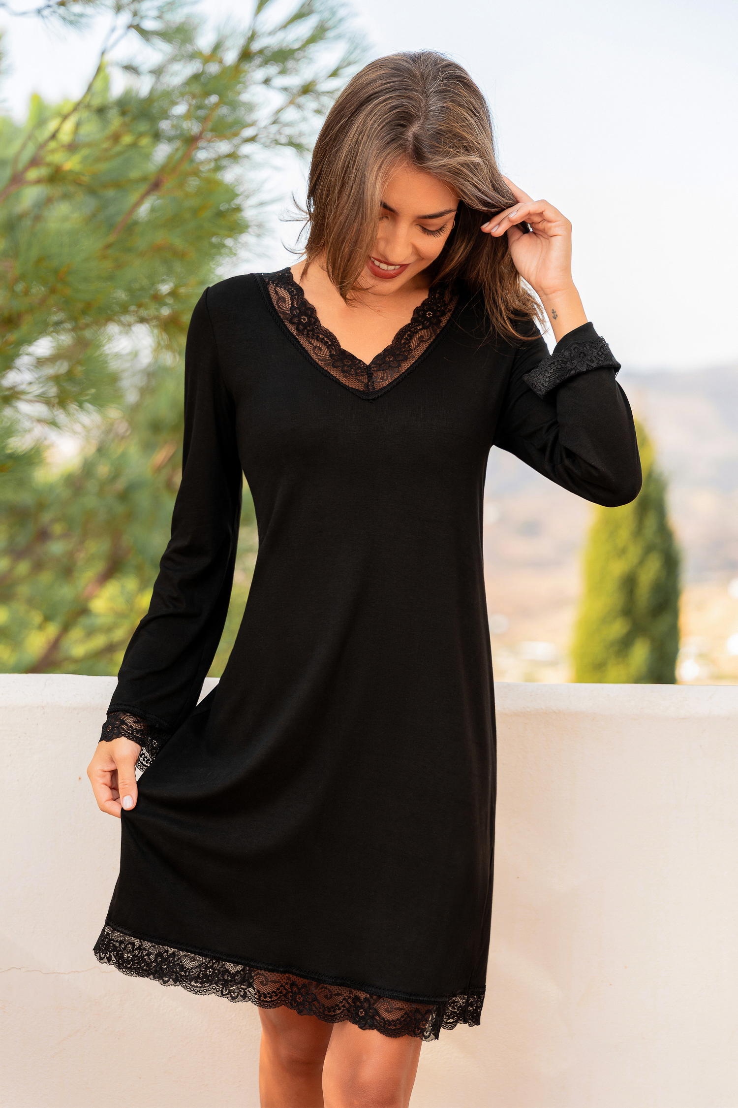 Das schwarze Nachthemd verleiht Ihrer Auszeit einen Hauch von Charme. Mit V-Ausschnitt, zartem Spitzenbesatz und langen Ärmeln verbindet dieses Minikleid Komfort mit einem Hauch Romantik für entspannte, verträumte Nächte.