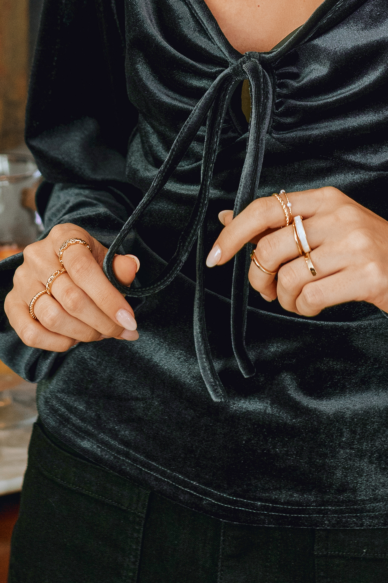 Das goldfarbene Ring-Set verleiht jedem Look einen eleganten, femininen Charme! Dieses Set bietet verschiedene Formen und Details zum Stapeln oder einzeln tragen für ein vielseitiges Finish.