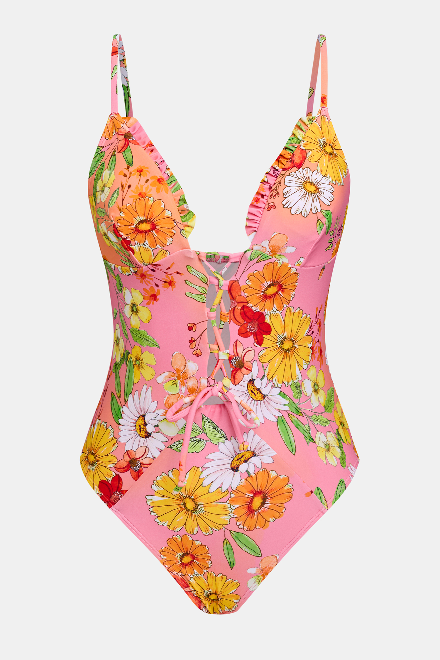 Bringen Sie lebendige Insel-Energie mit dem Badeanzug in Ihren Alltag! Der tiefe Ausschnitt mit verstellbaren Trägern bietet Halt für mittlere Oberweite, während der normale Beinausschnitt den Look kokett, zeitlos und lässig macht.