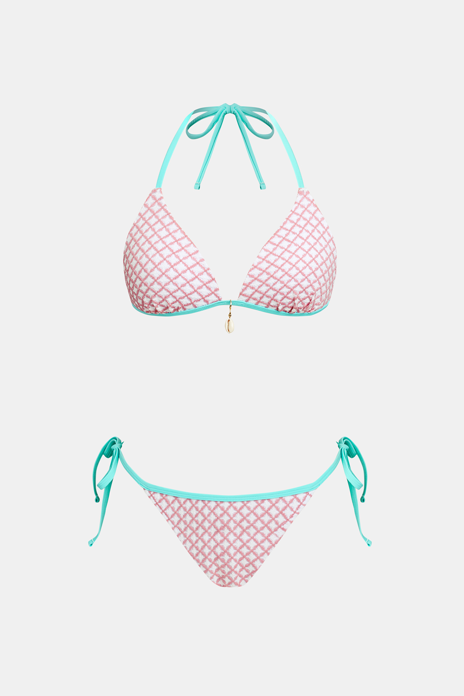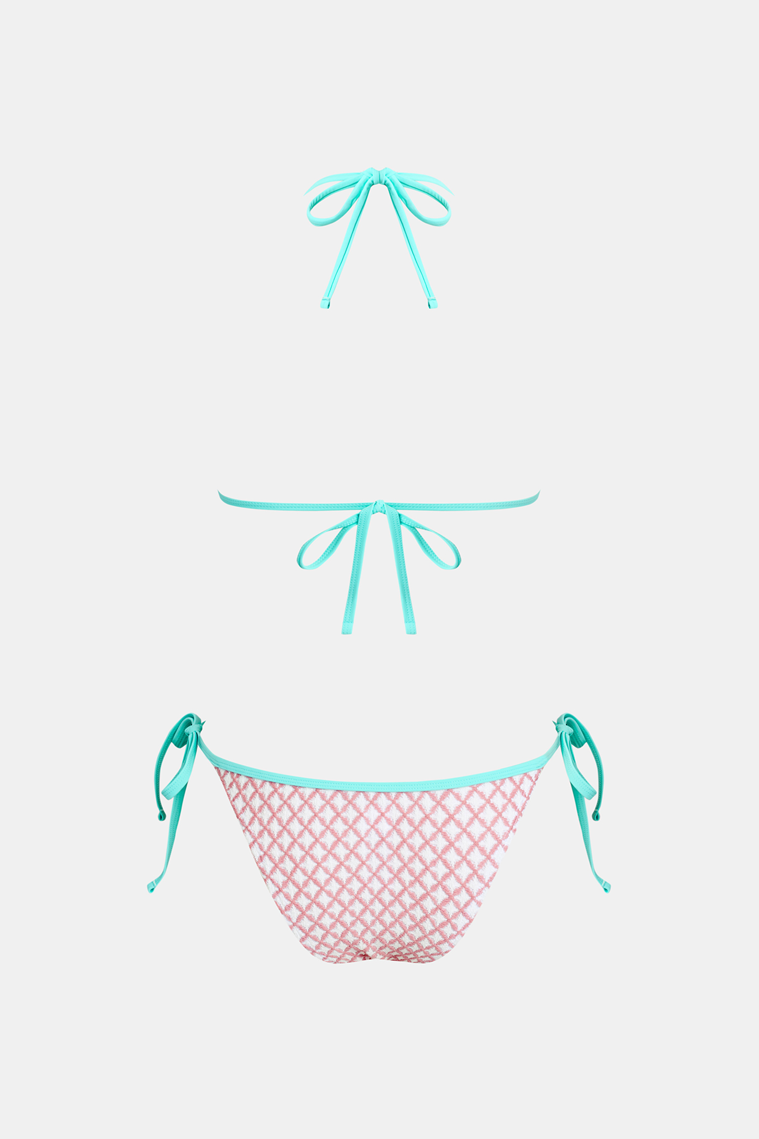 Das Bikini-Set bringt lässigen Inselcharme in Ihre Badegarderobe! Der Diamantausschnitt mit Neckholder-Trägern bietet stützenden Halt für die Brust, während der tiefe Bund und der hohe Beinausschnitt eine schmeichelhafte Silhouette mit modernem, frechem Po-Schnitt zaubern.