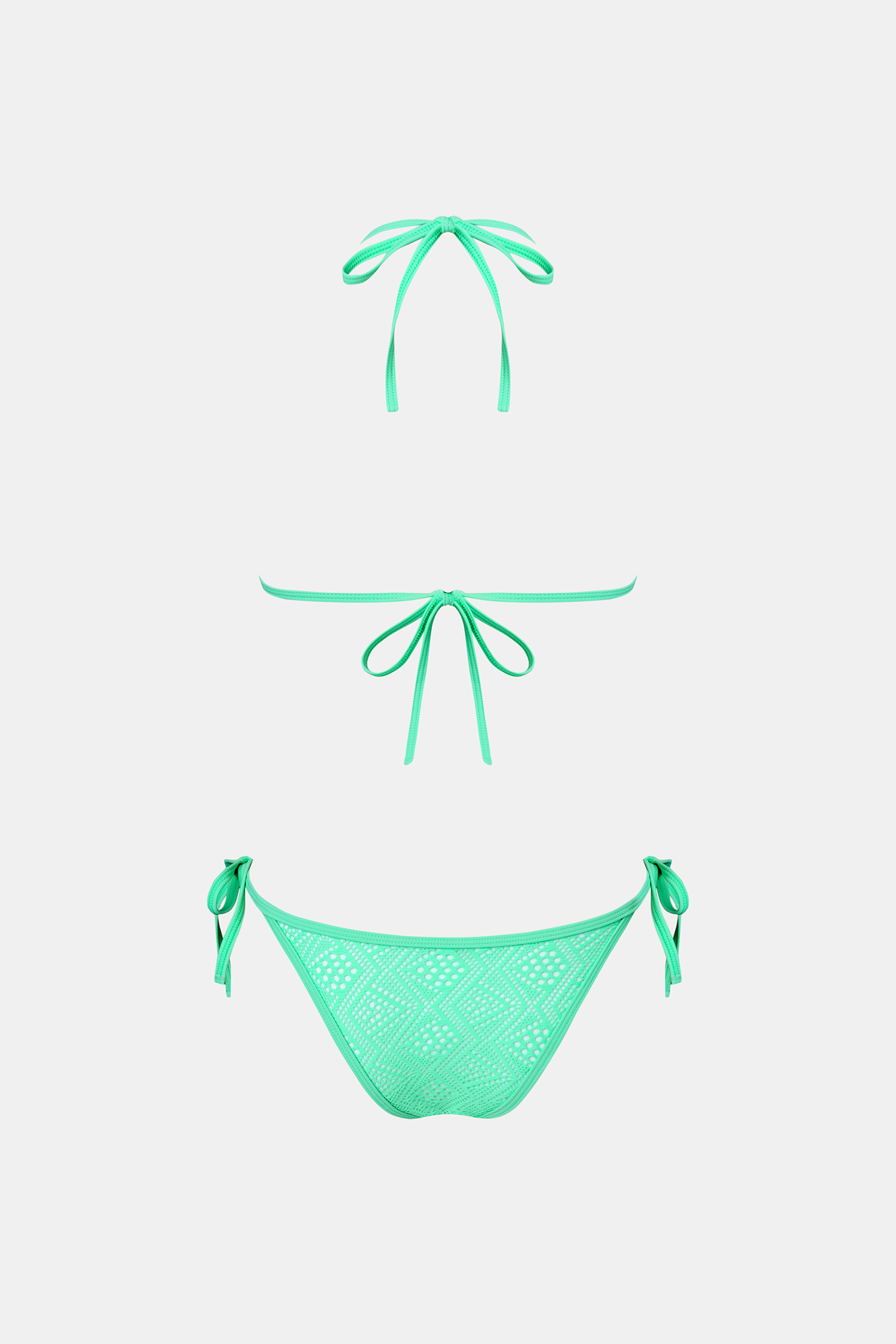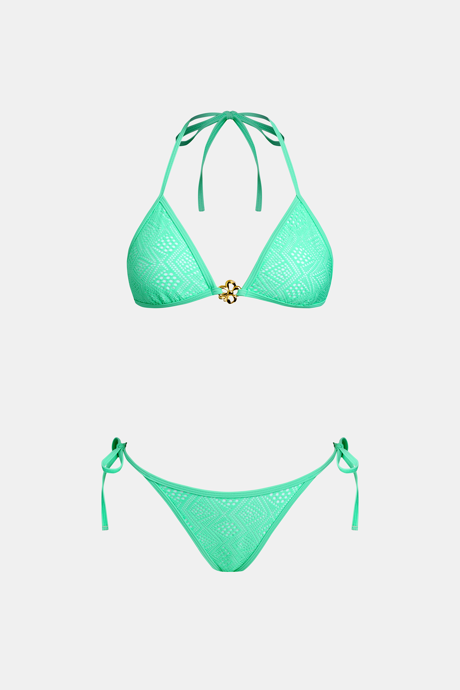 Tauchen Sie ein in Inselabenteuer mit dem Bikini-Set! Der Diamantausschnitt mit Neckholder-Trägern bietet leichten Halt für die Brust, während der tiefe Bund und der hohe Beinausschnitt für einen koketten, unkomplizierten Look sorgen – perfekt zum Erkunden der Unterwasserwelt.