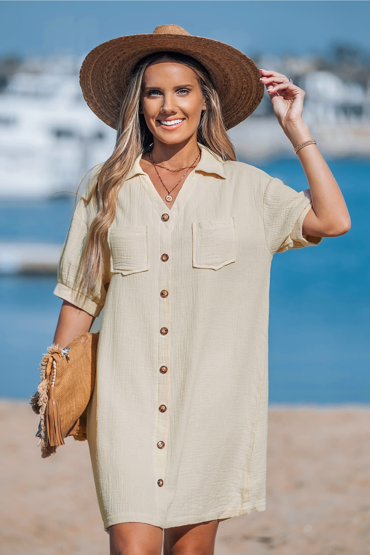 Texturiertes Minikleid mit gekerbtem Kragen in Beige