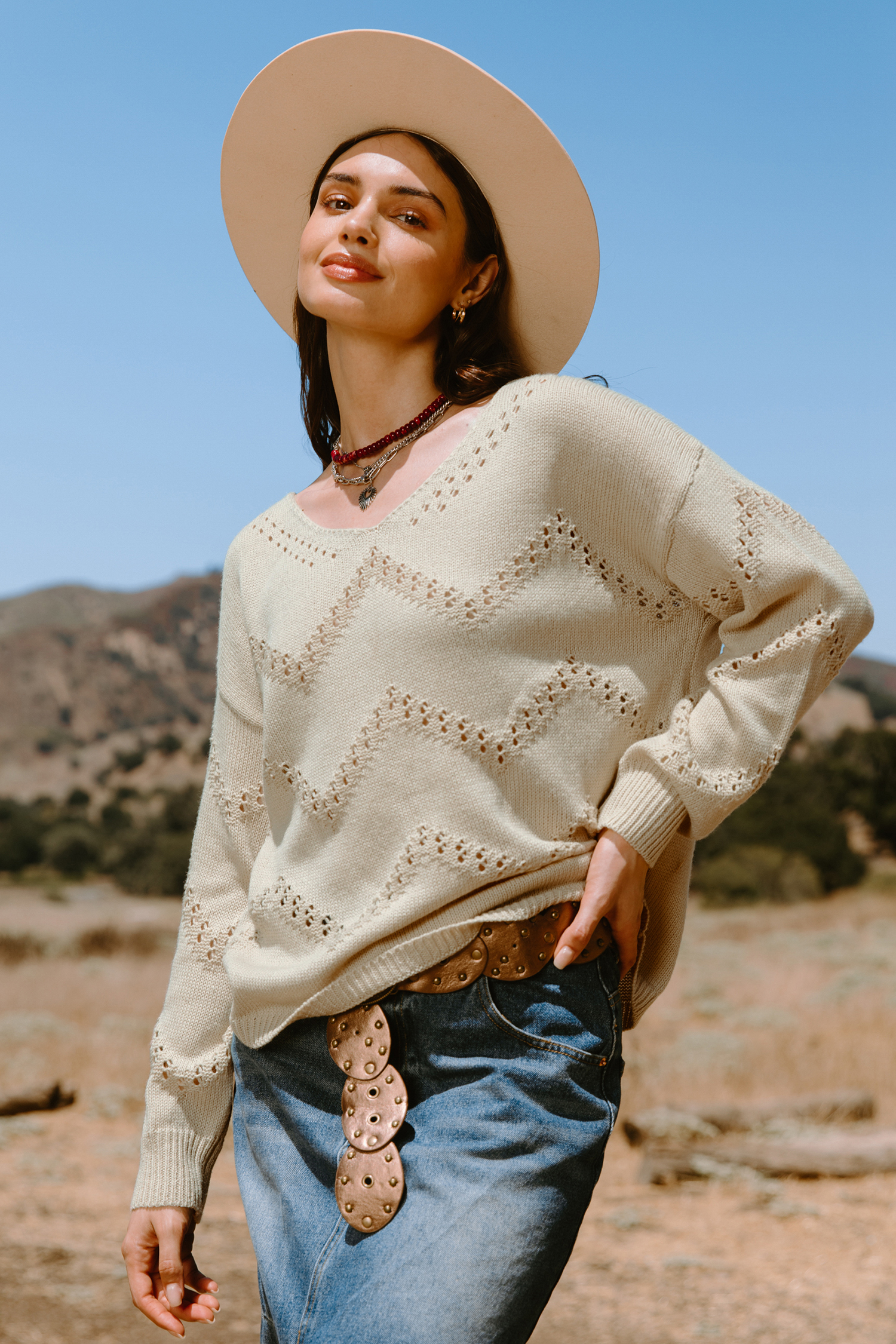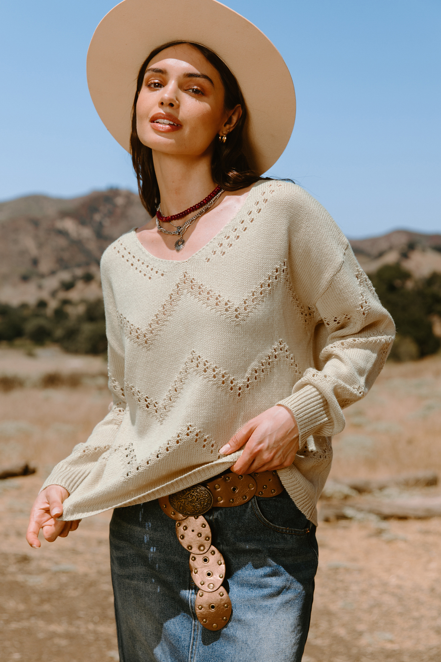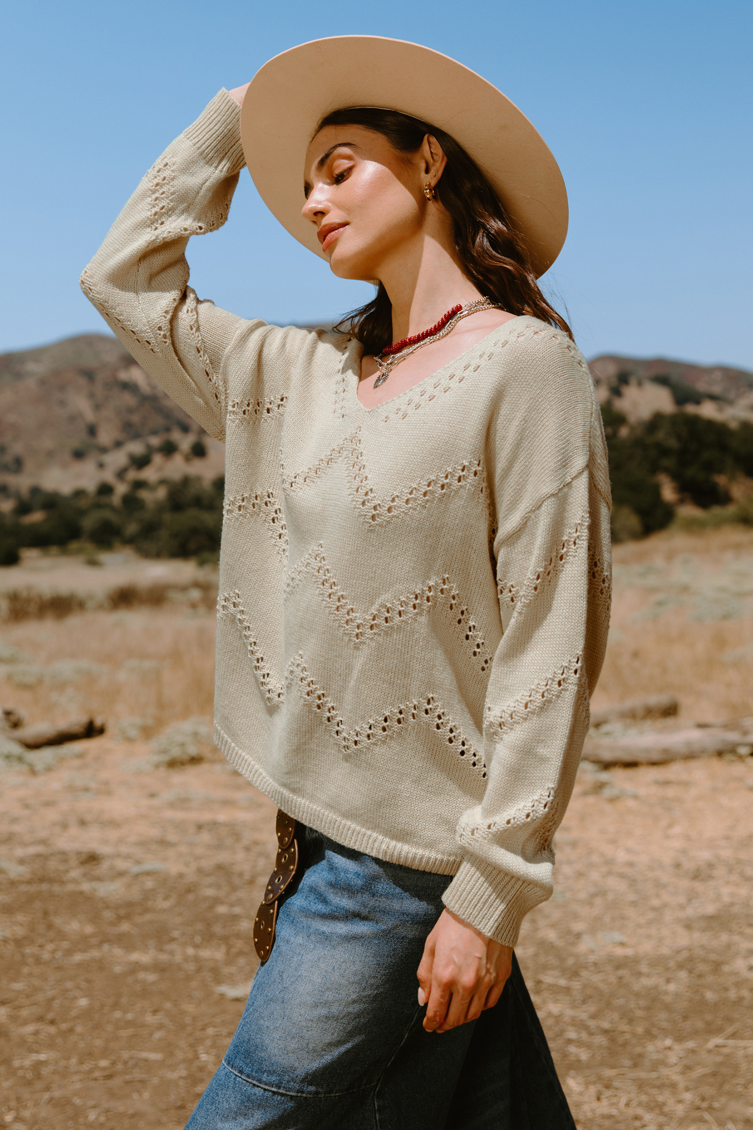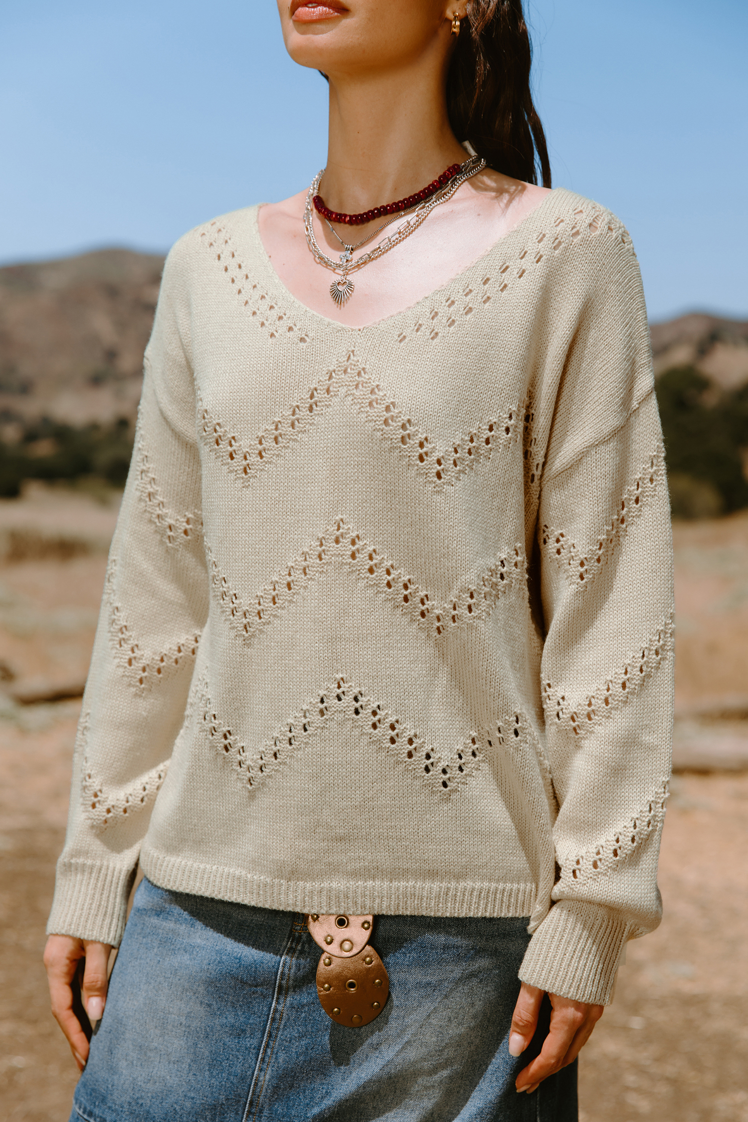HomeBeige Langarm-Strickoberteil mit V-Ausschnitt