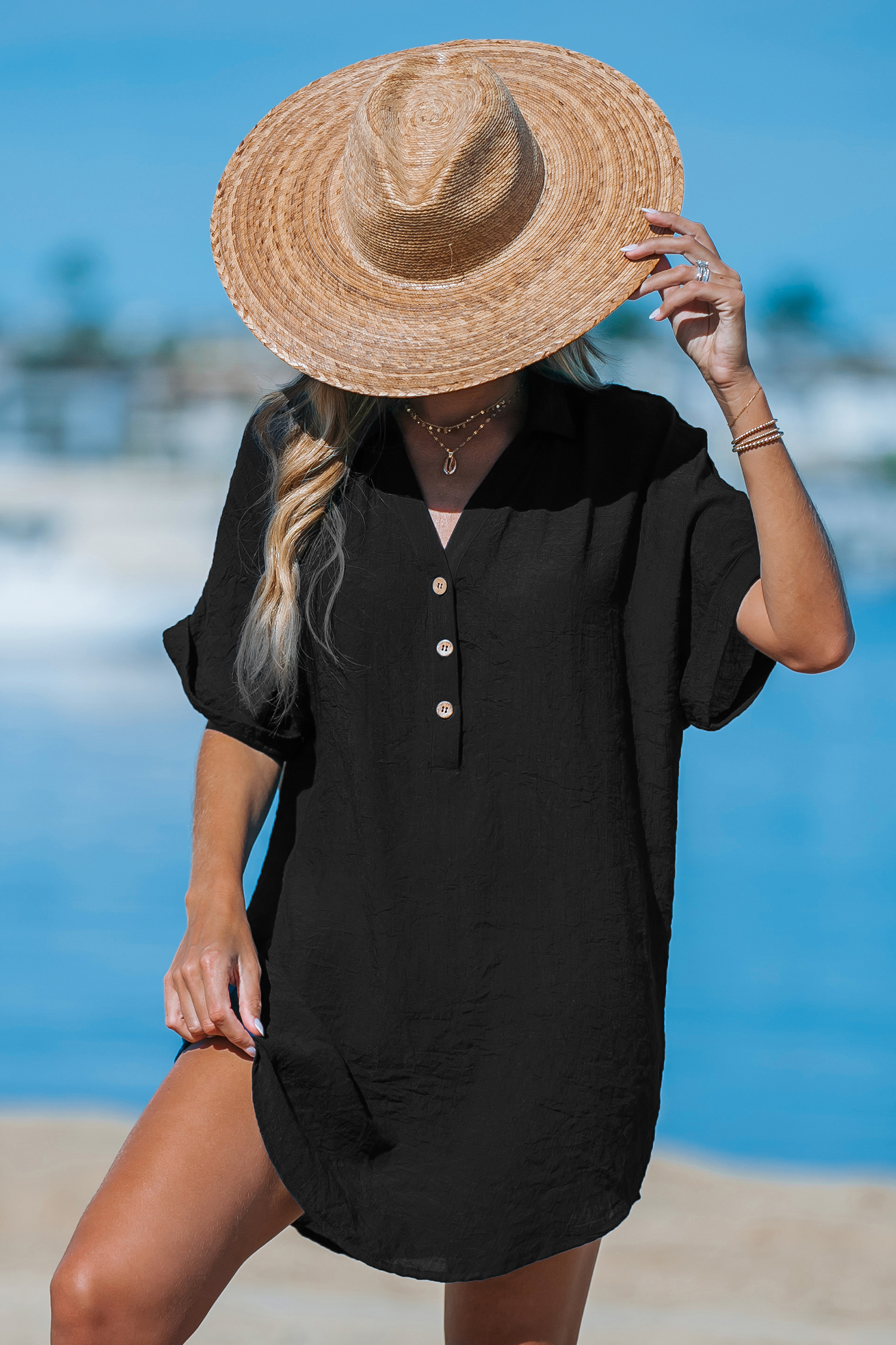 Schwarzes Cover-Up-Minikleid mit Kragen und V-Ausschnitt