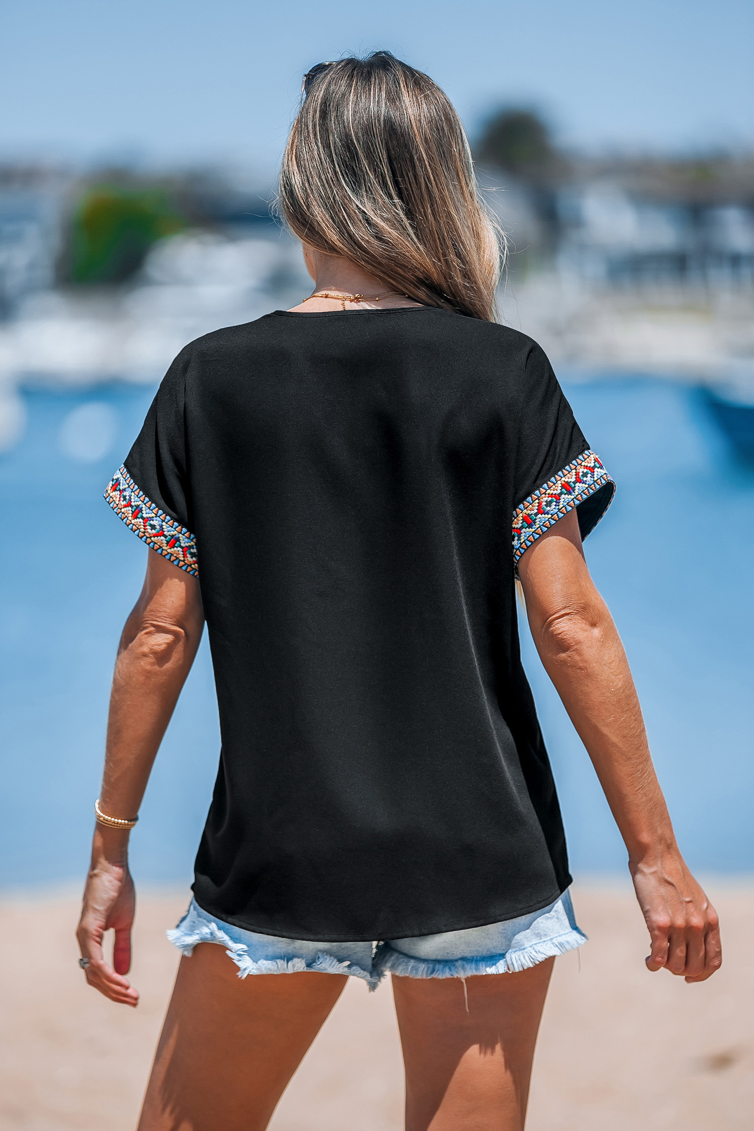Schwarzes Jersey-Top mit V-Ausschnitt und Zierbesatz