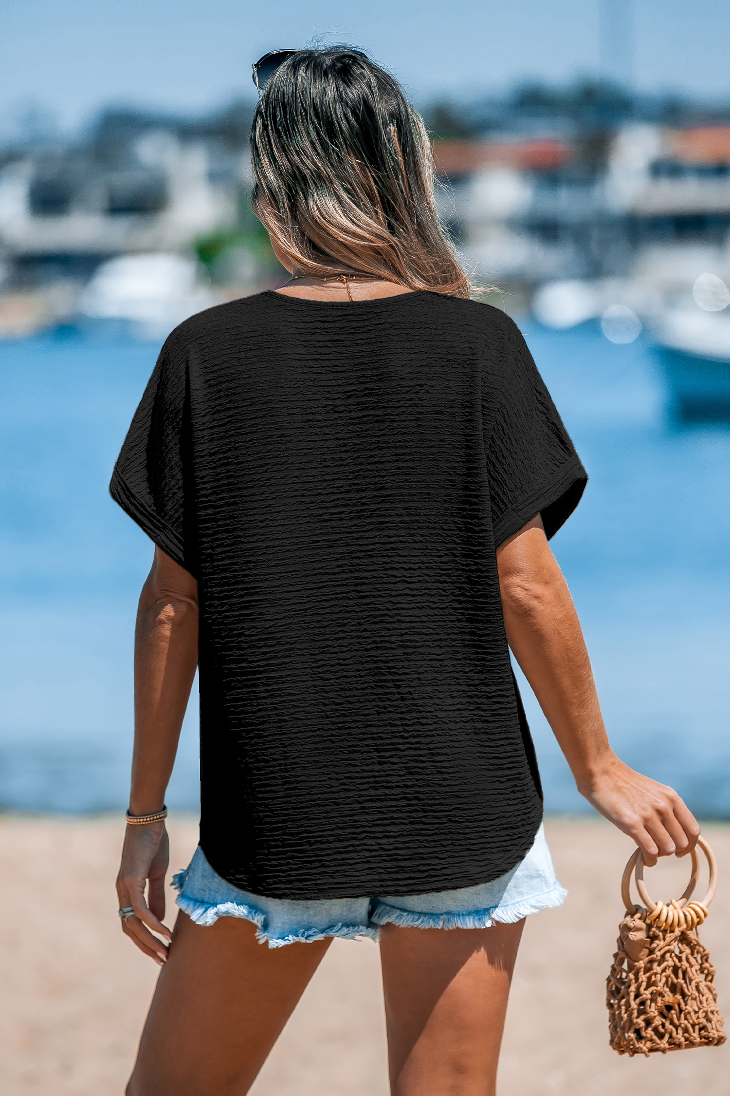 Schwarzes Strick-Top mit V-Ausschnitt und Dolman-Ärmeln