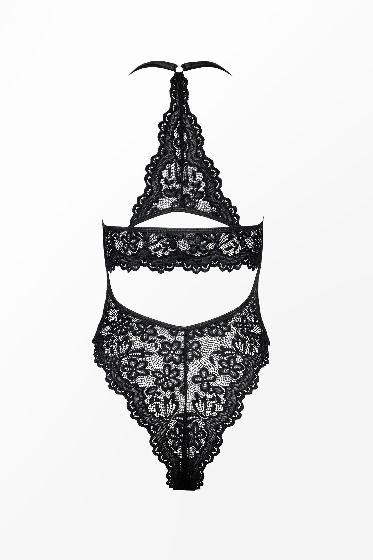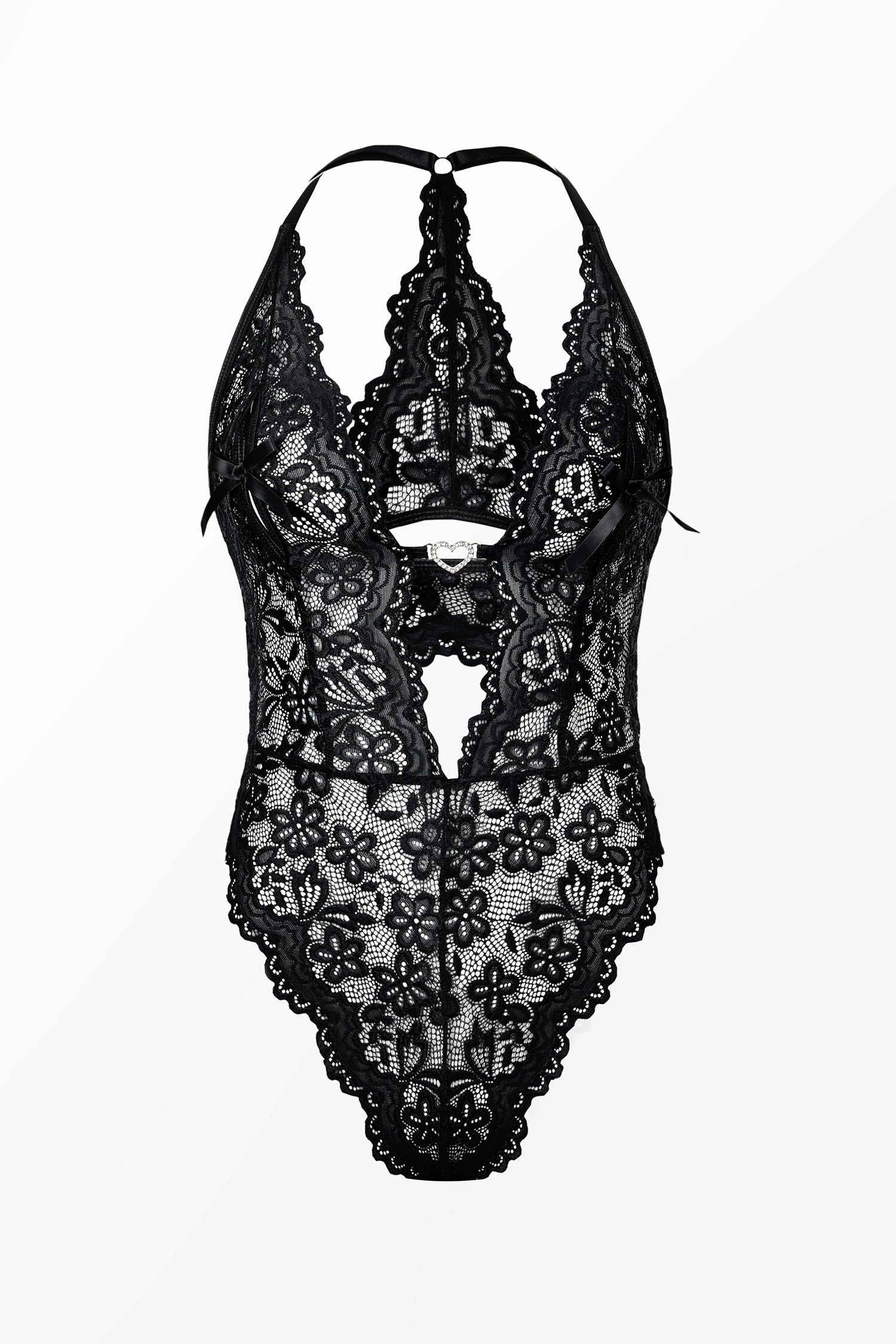Schwarzer Spitze-Dessous-Bodysuit mit Herz und Schleife