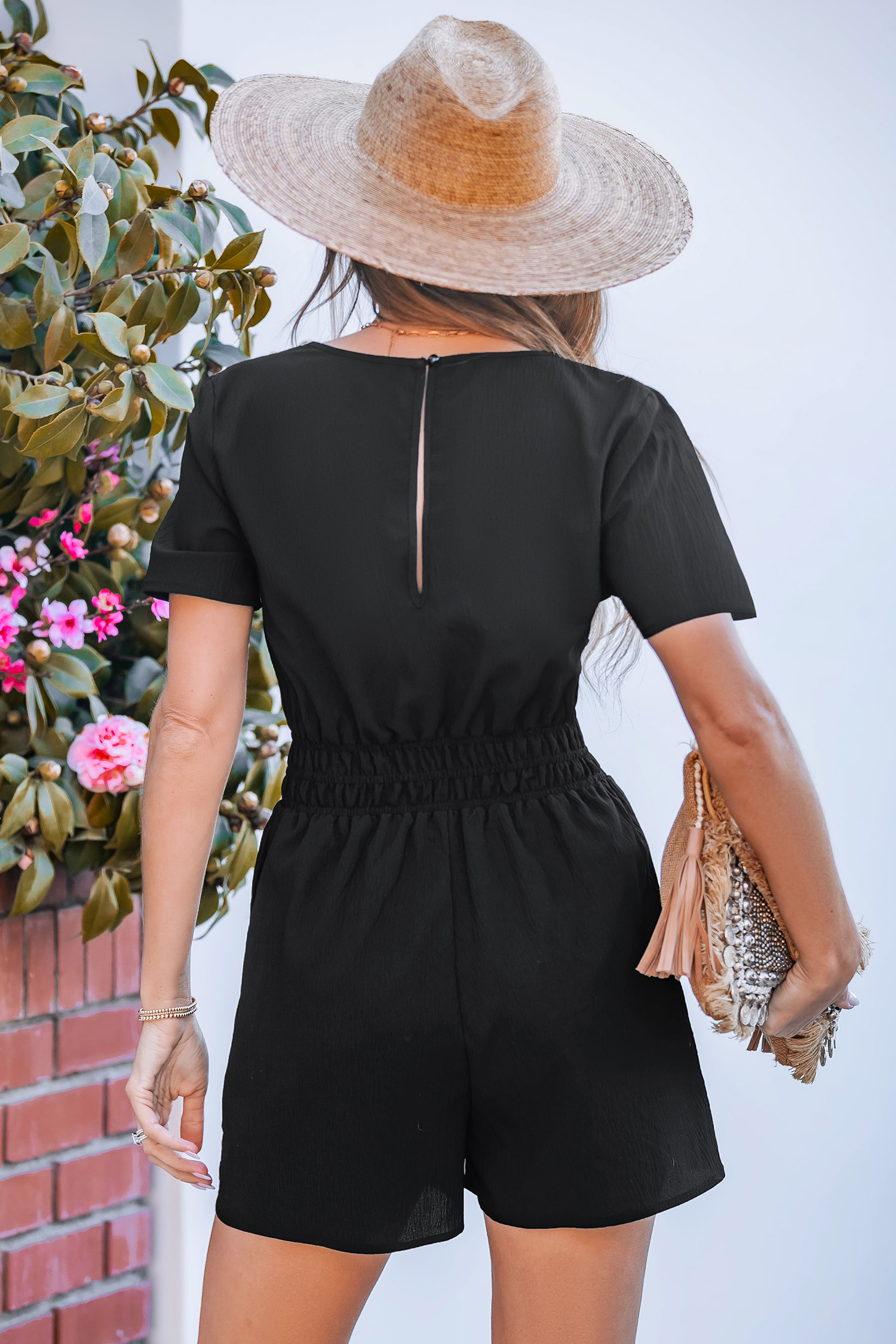 Schwarzer Romper mit weitem Bein und gekerbtem Ausschnitt