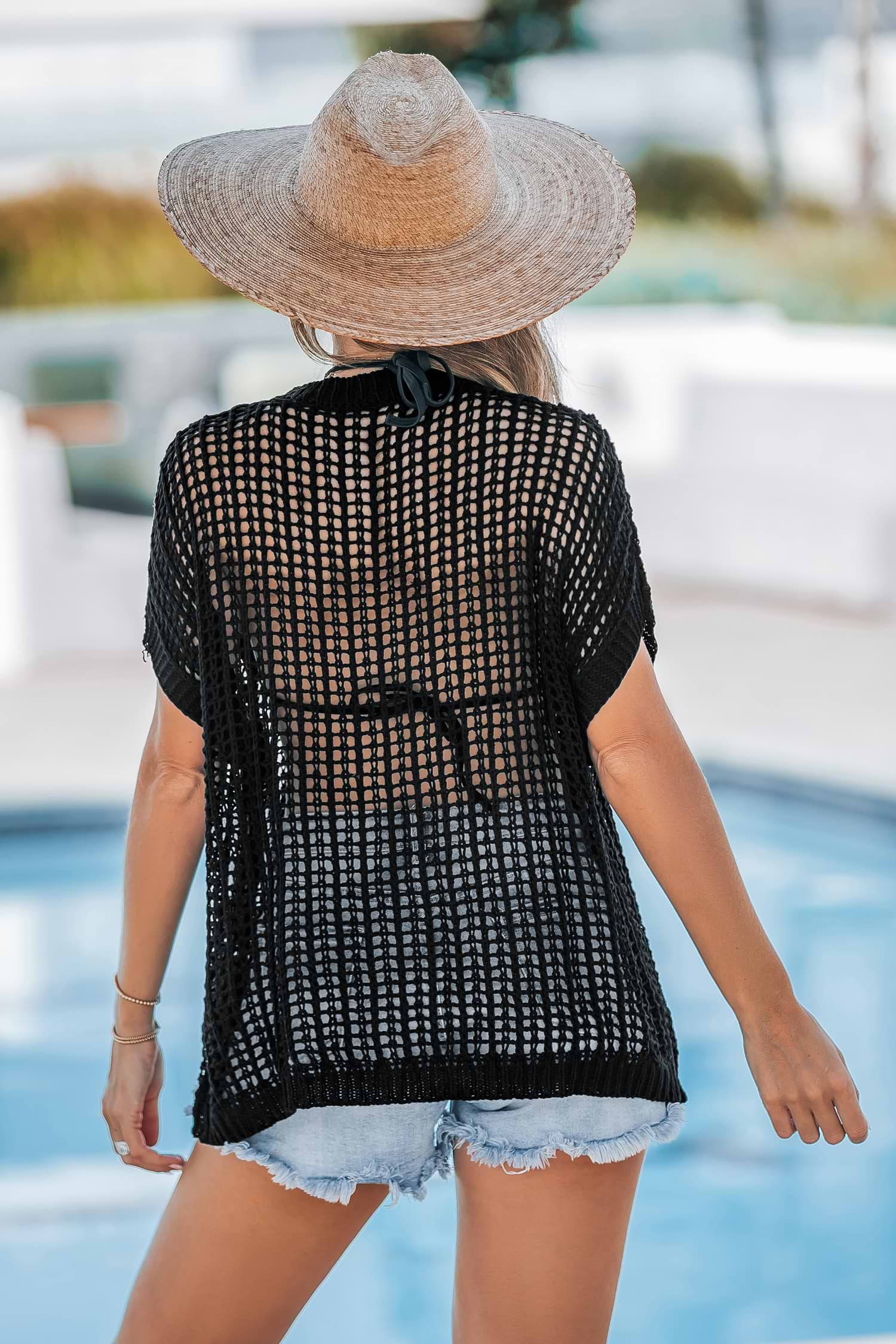 Schwarzes Gestricktes Cover-Up-Top mit kurzen Ärmeln