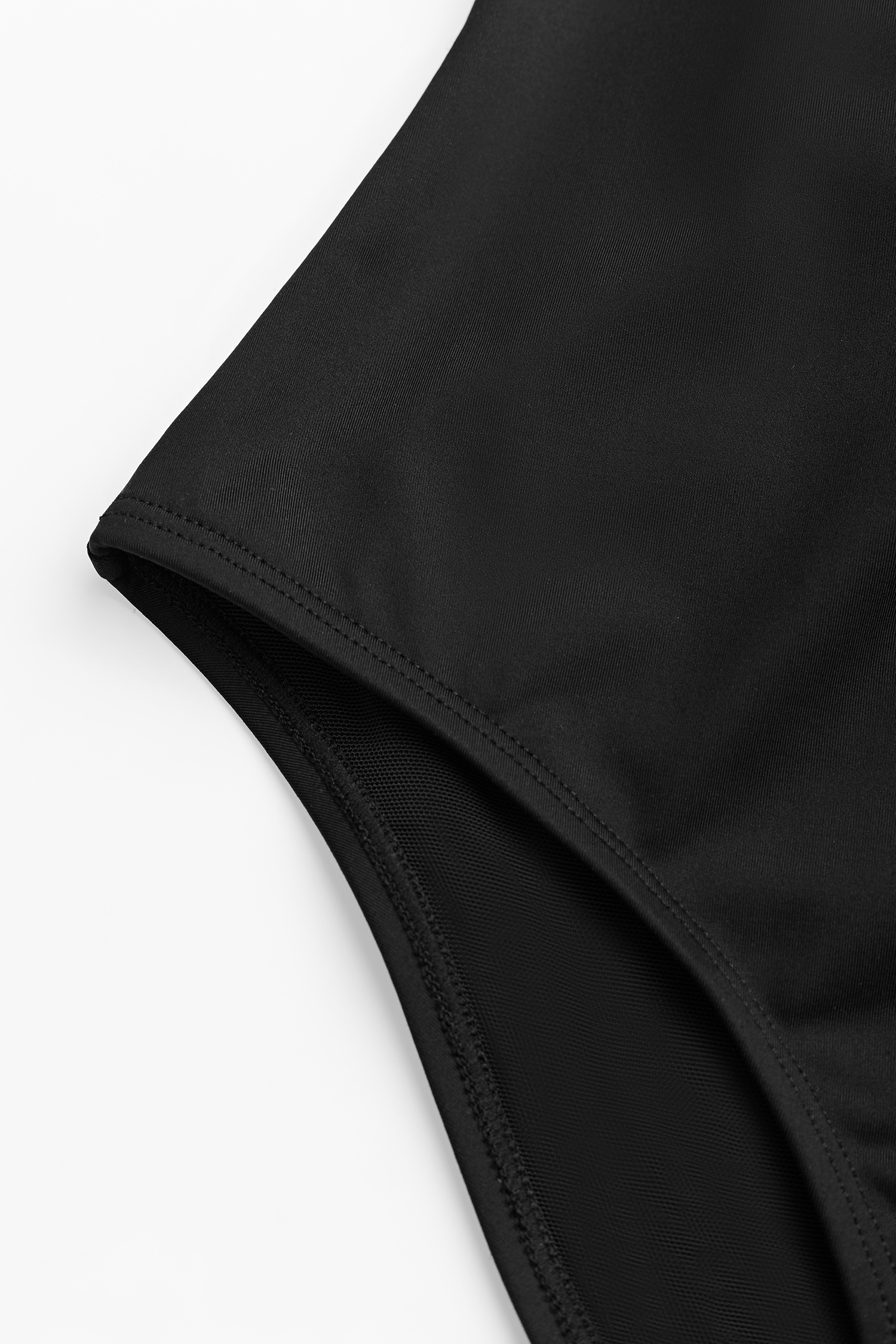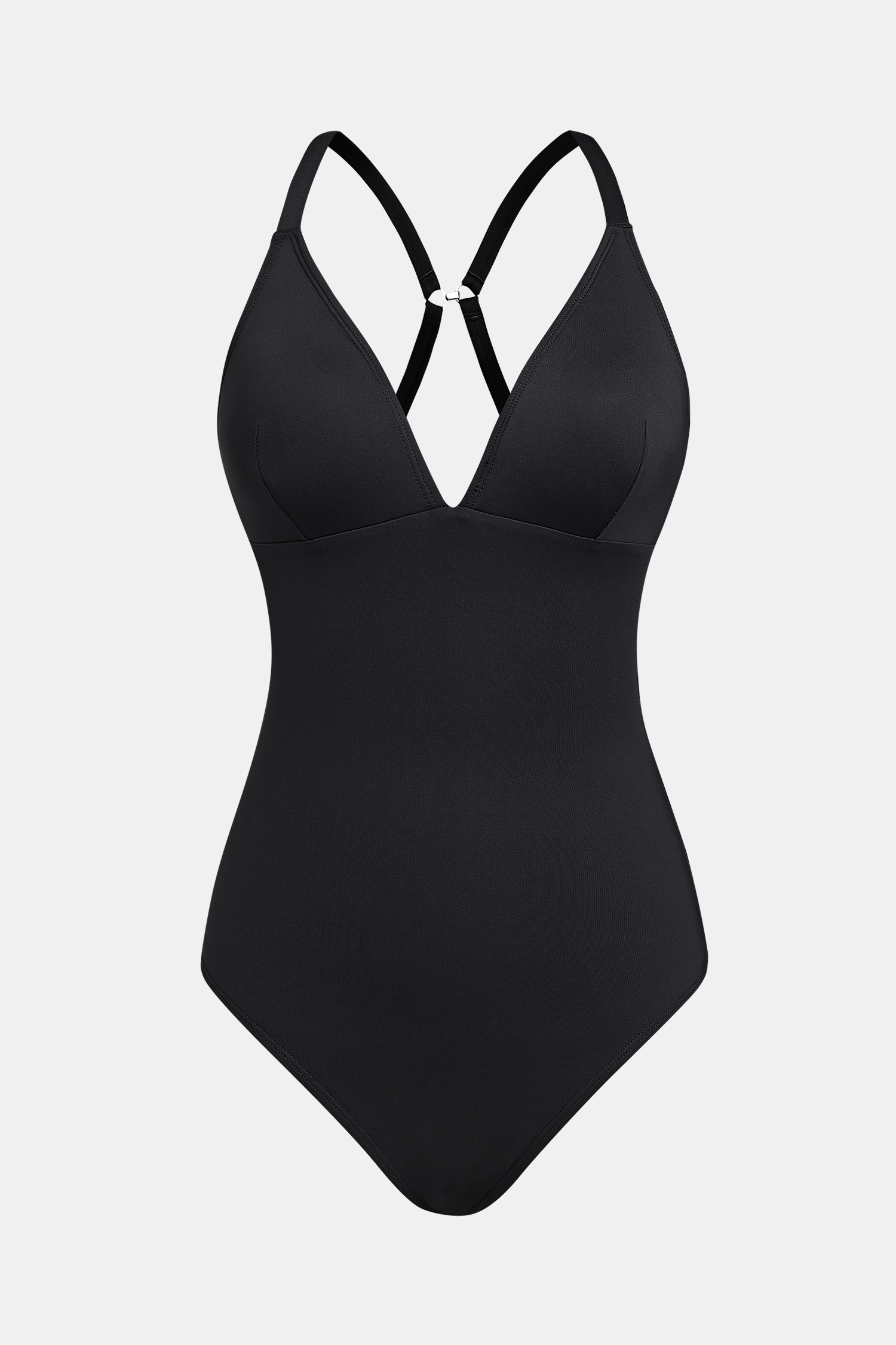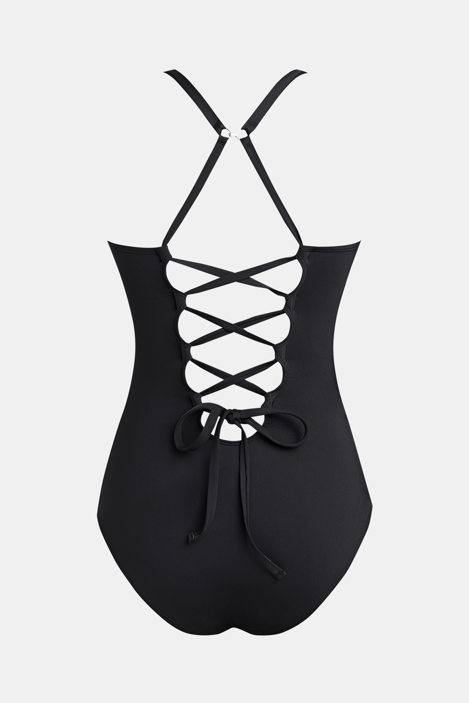 Der schwarze Slim & Sculpt Einteiler mit tiefem Plunge-Ausschnitt und Schnürung am Rücken bietet einen gewagten Look und eine figurbetonte Passform, die jede Kurve schmeichelt. Die Schnürung am Rücken verleiht eine raffinierte Note und sorgt für eine individuelle Passform sowie selbstbewusstes Auftreten.