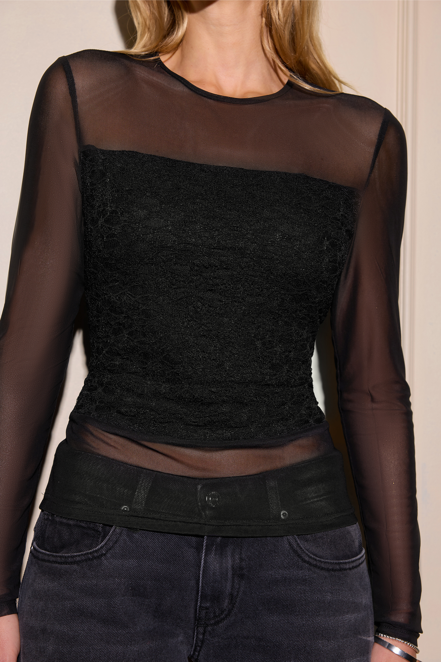 Dieses schwarze Langarm-Top aus durchsichtiger Spitze verbindet Eleganz mit einem Hauch von Verführungskunst. Das Mieder aus Spitze bildet einen schönen Kontrast zu den durchsichtigen Netzärmeln und ist somit die perfekte Wahl für einen Abend im Freien oder für einen schicken Lagenlook!