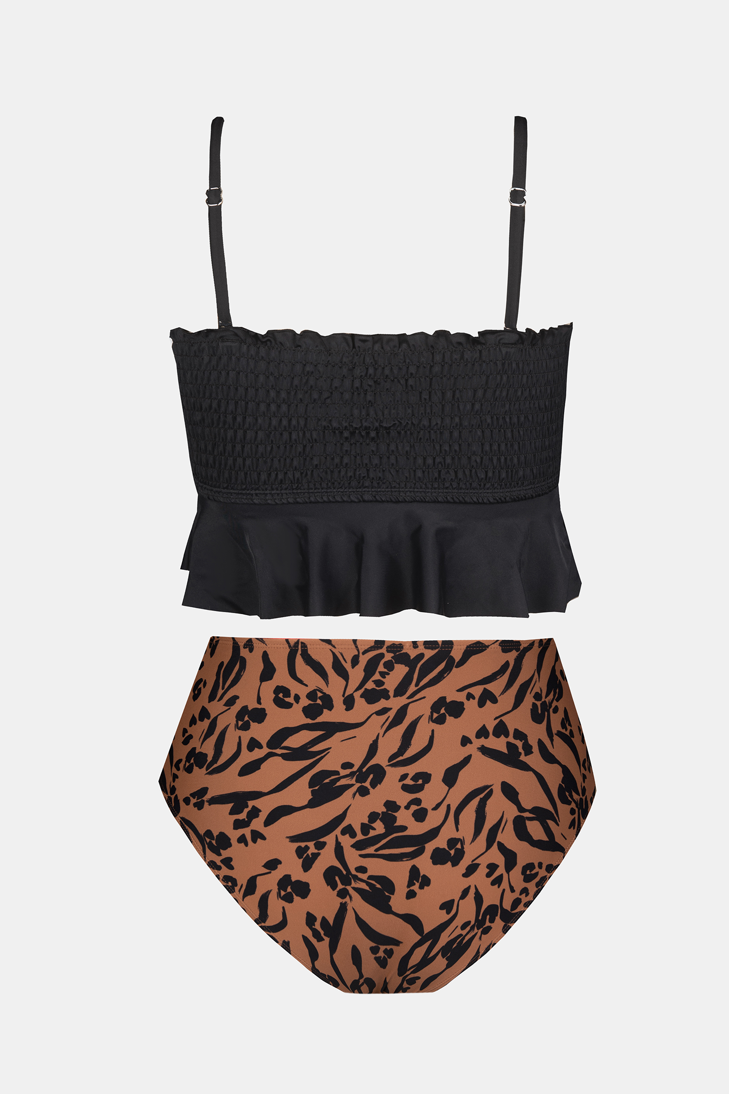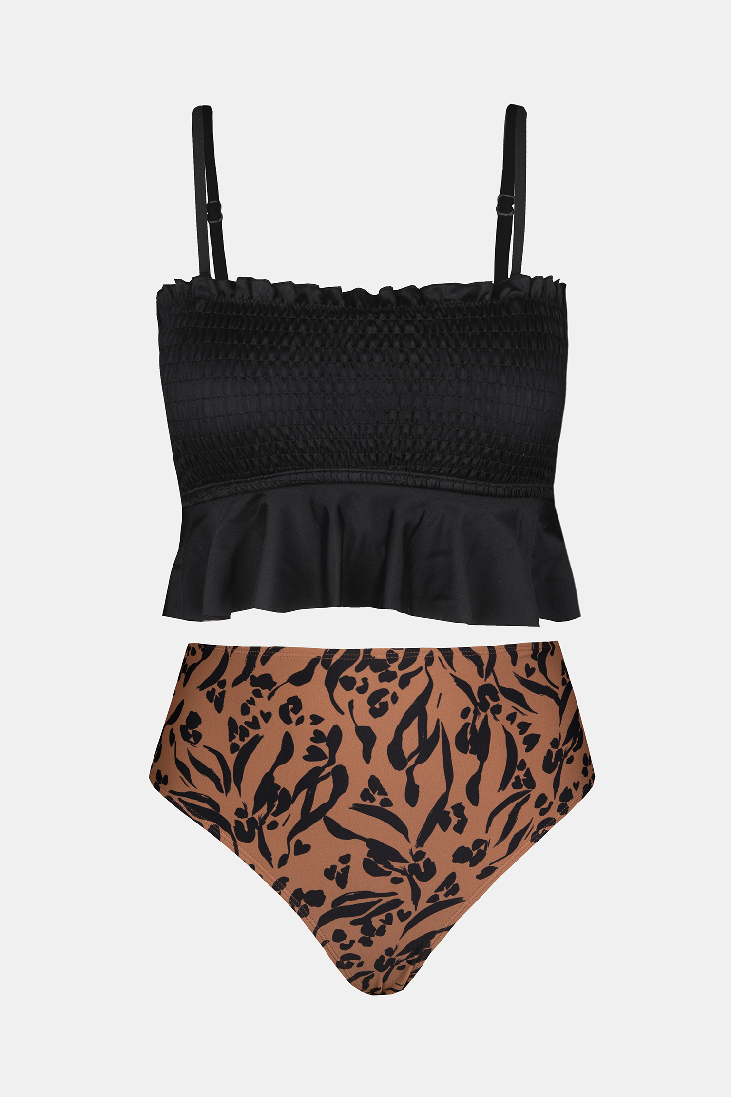 Schwarzes gesmoktes Tankini-Oberteil & High Waist Bikini-Hose