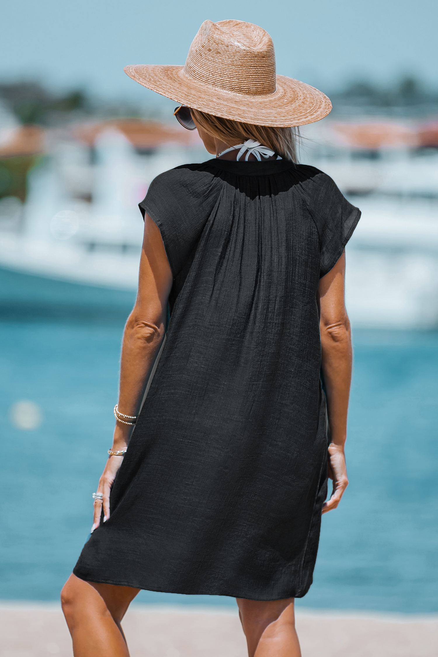 Schwarzes kurzärmeliges Cover-Up-Kleid mit V-Ausschnitt