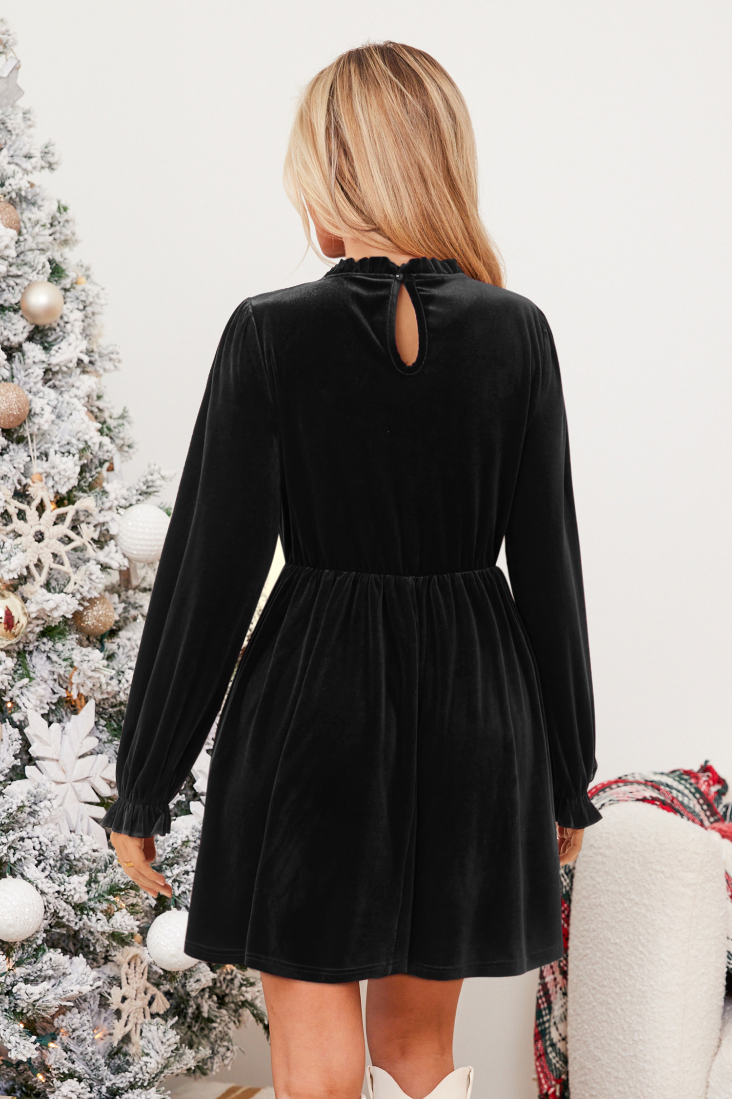 Das schwarze Samt-Minikleid mit Puffärmeln ist hier, um die Show zu stehlen. Mit seinem luxuriösen Samtstoff und den dramatischen Puffärmeln ist es wie geschaffen für Momente, in denen Sie die Blicke auf sich ziehen und sich umwerfend fühlen wollen.
