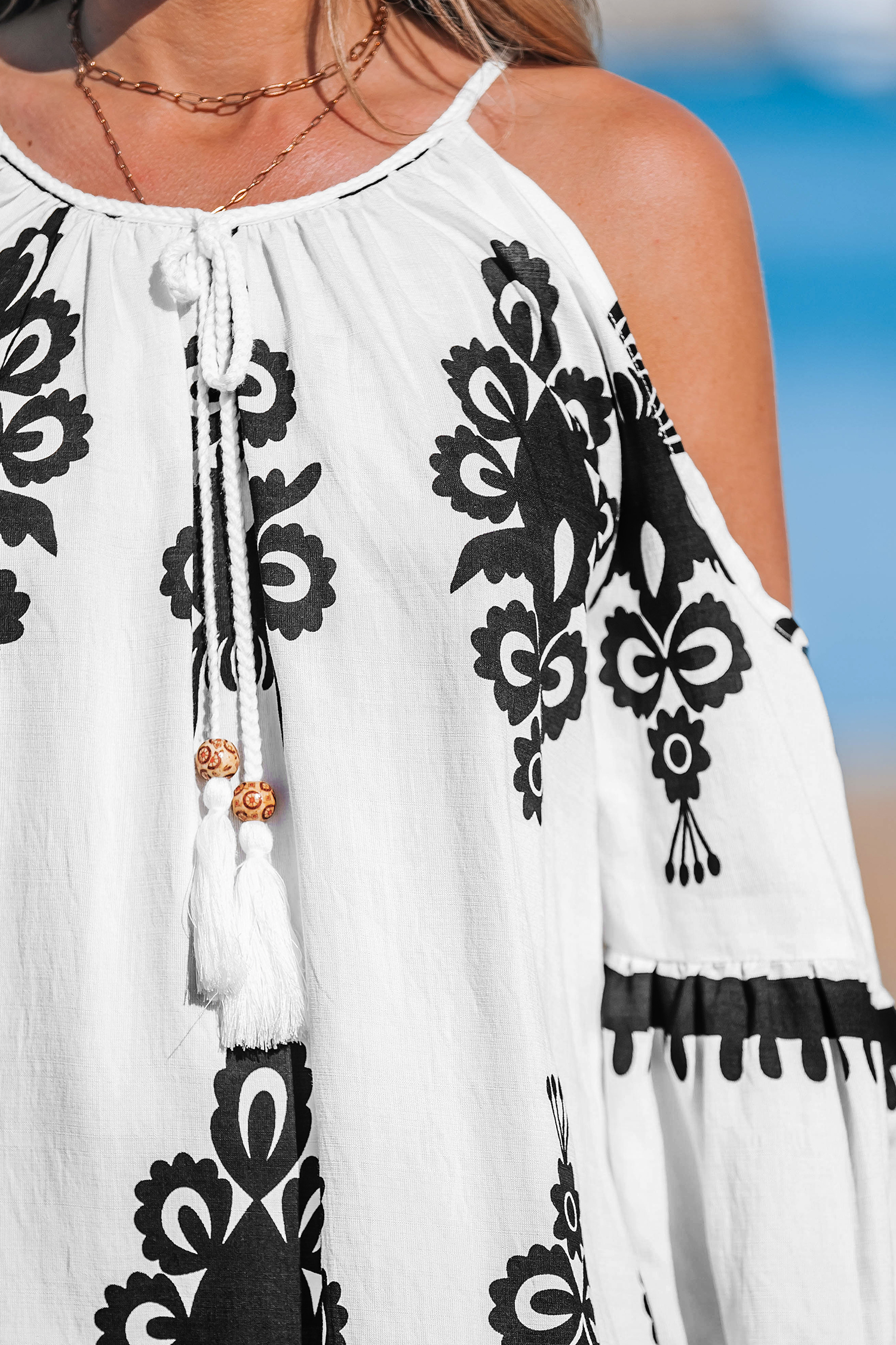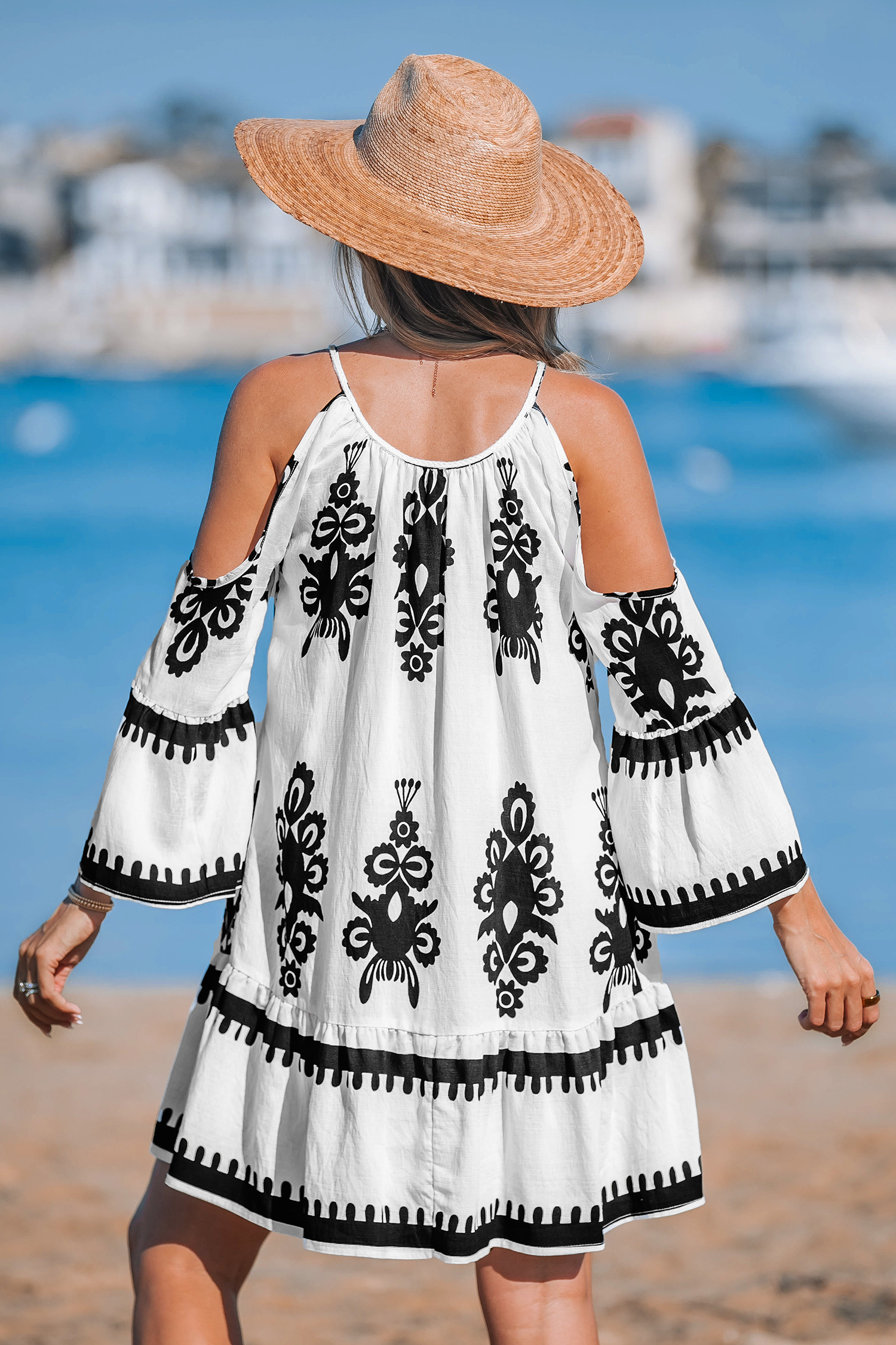 Schwarz-Weißes besticktes Cold-Shoulder-Minikleid
