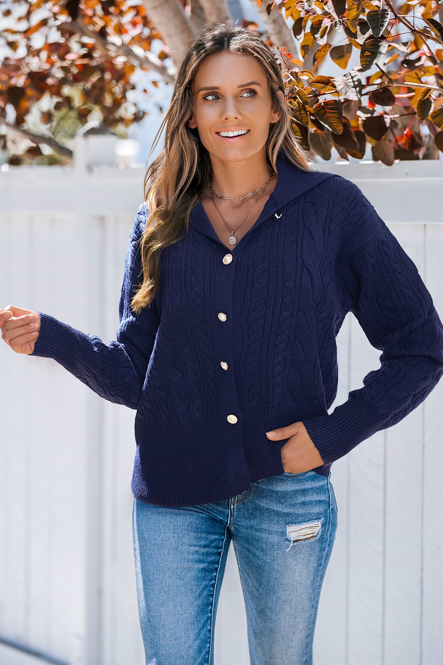 HomeBlaue Zopf-Strickjacke