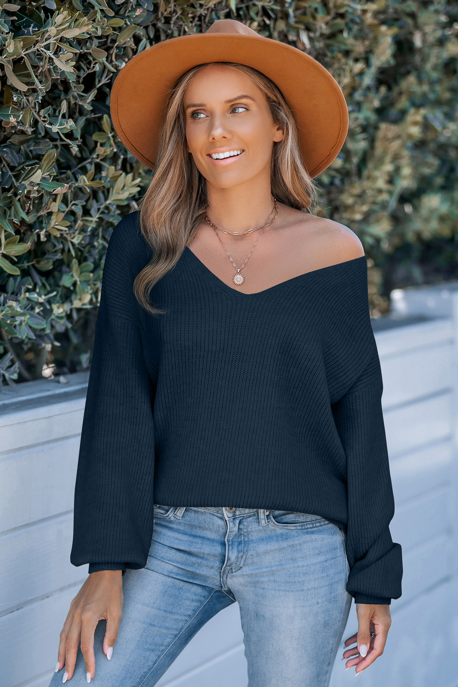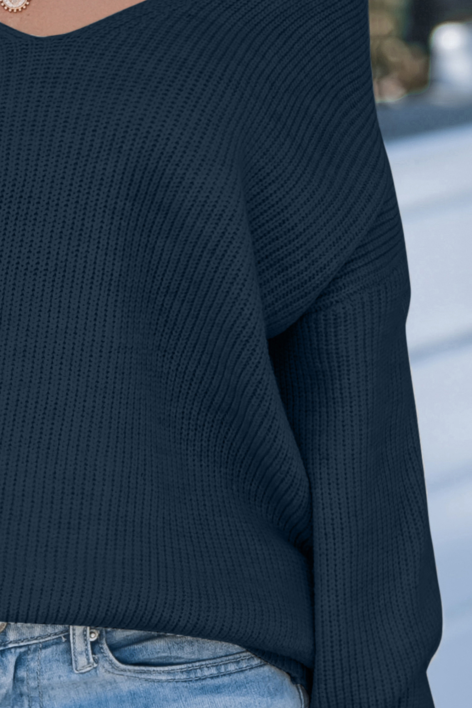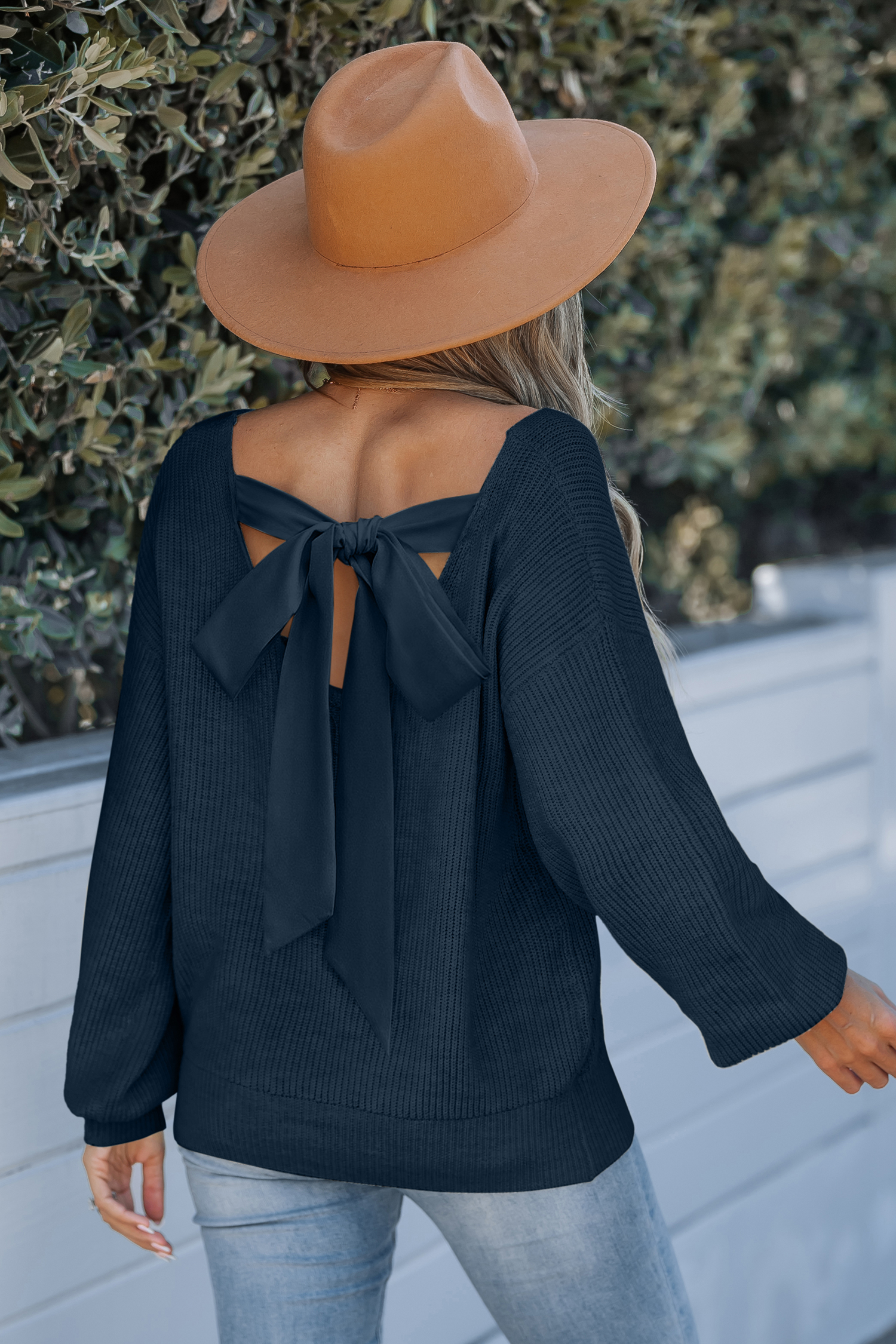 Blauer Langarmpullover mit Rückenkrawatte