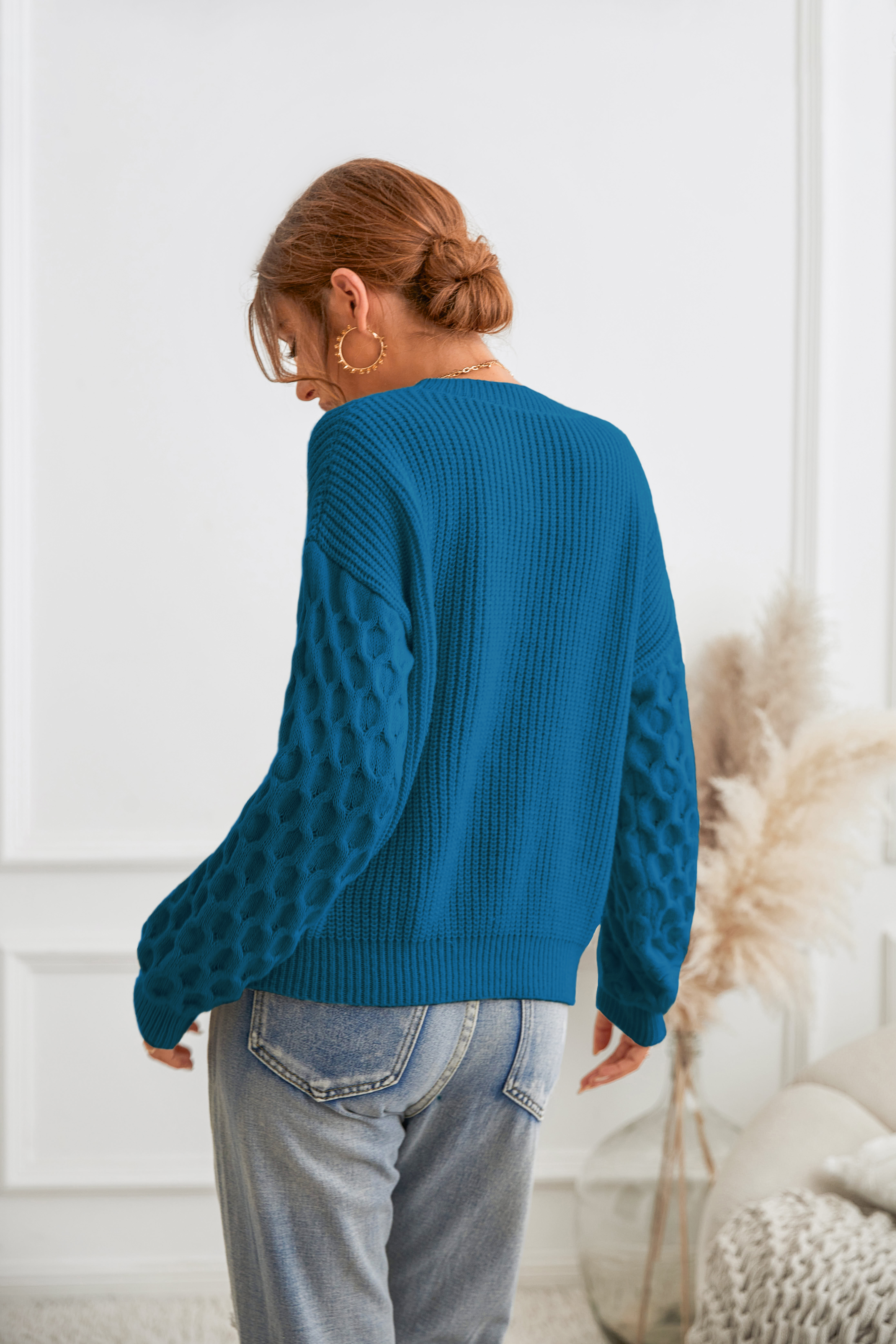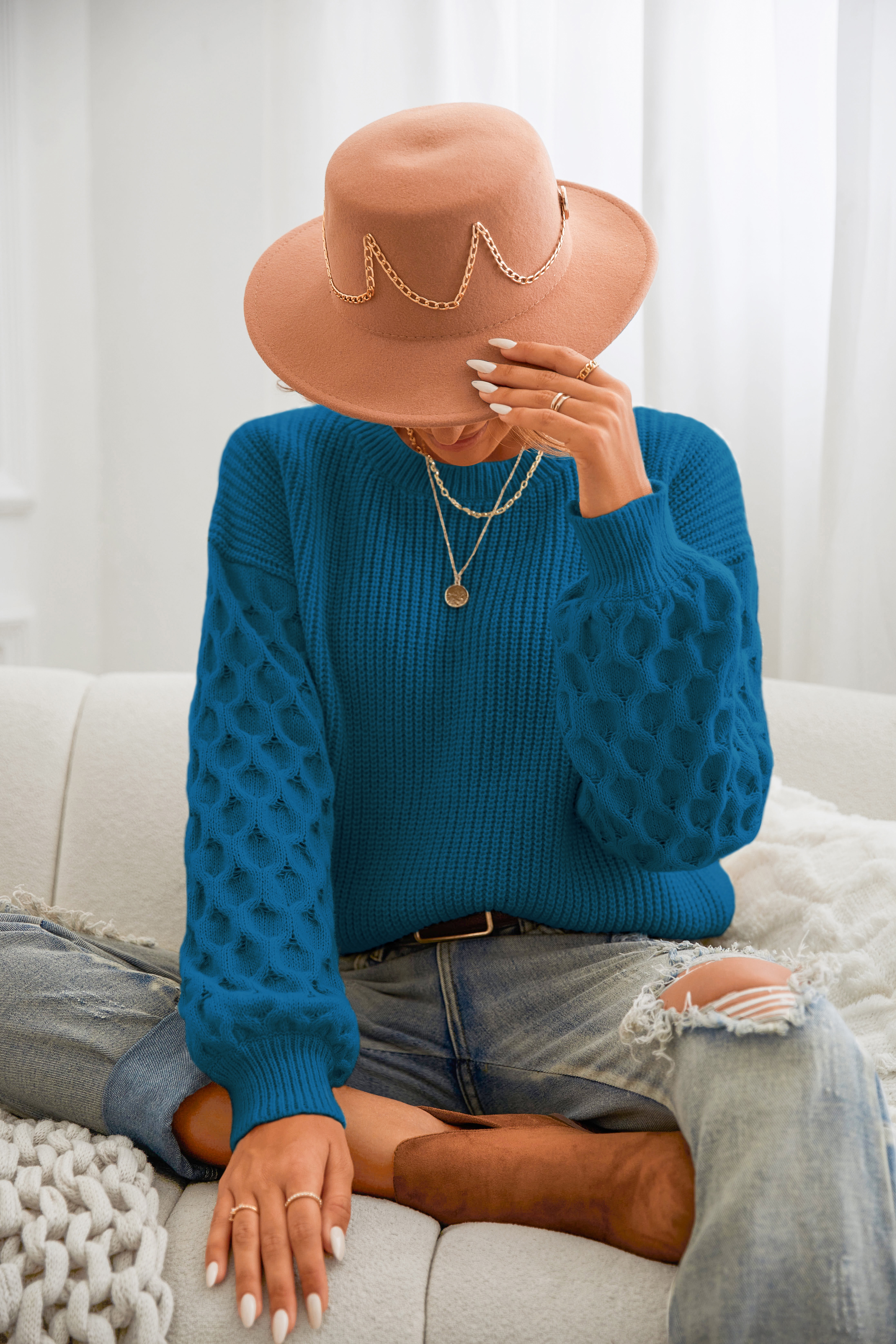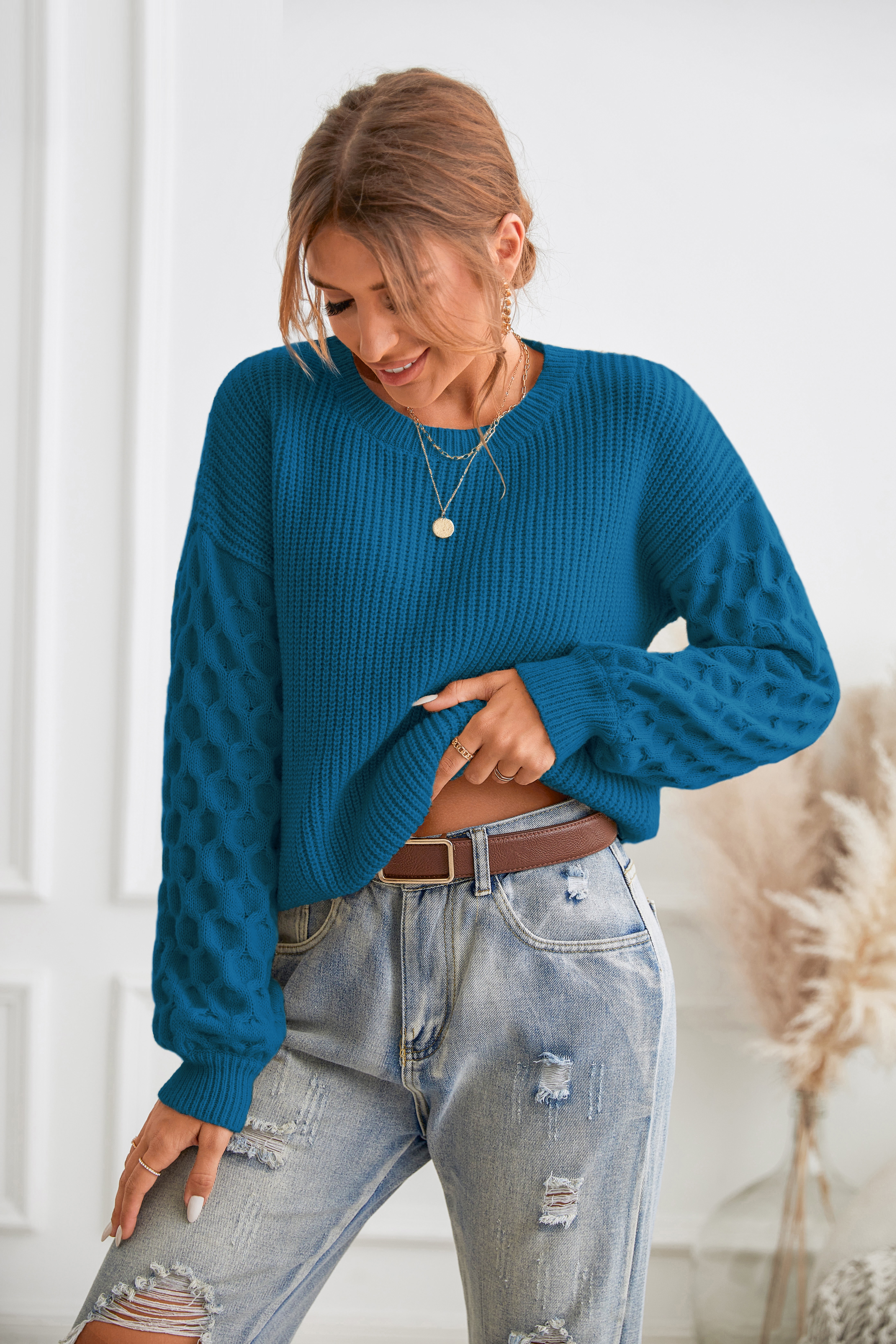 Blauer Rundhals-Pullover mit Wabenmuster und Puffärmeln