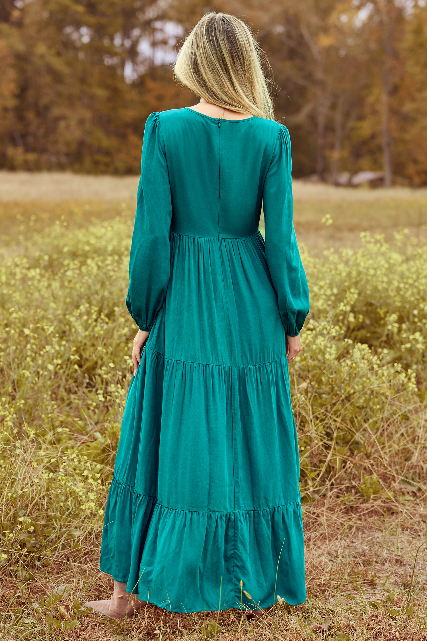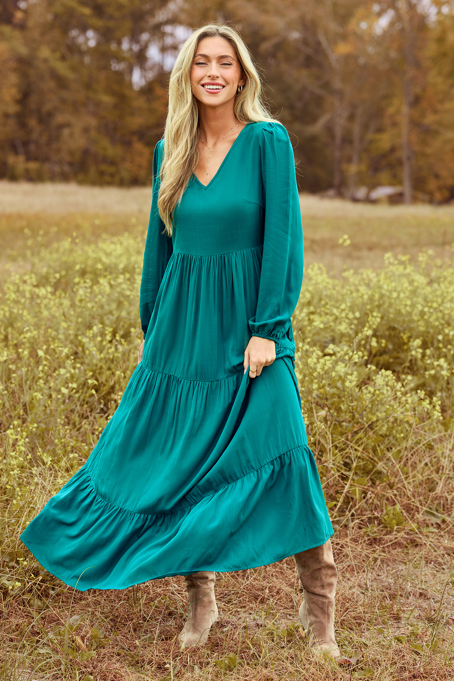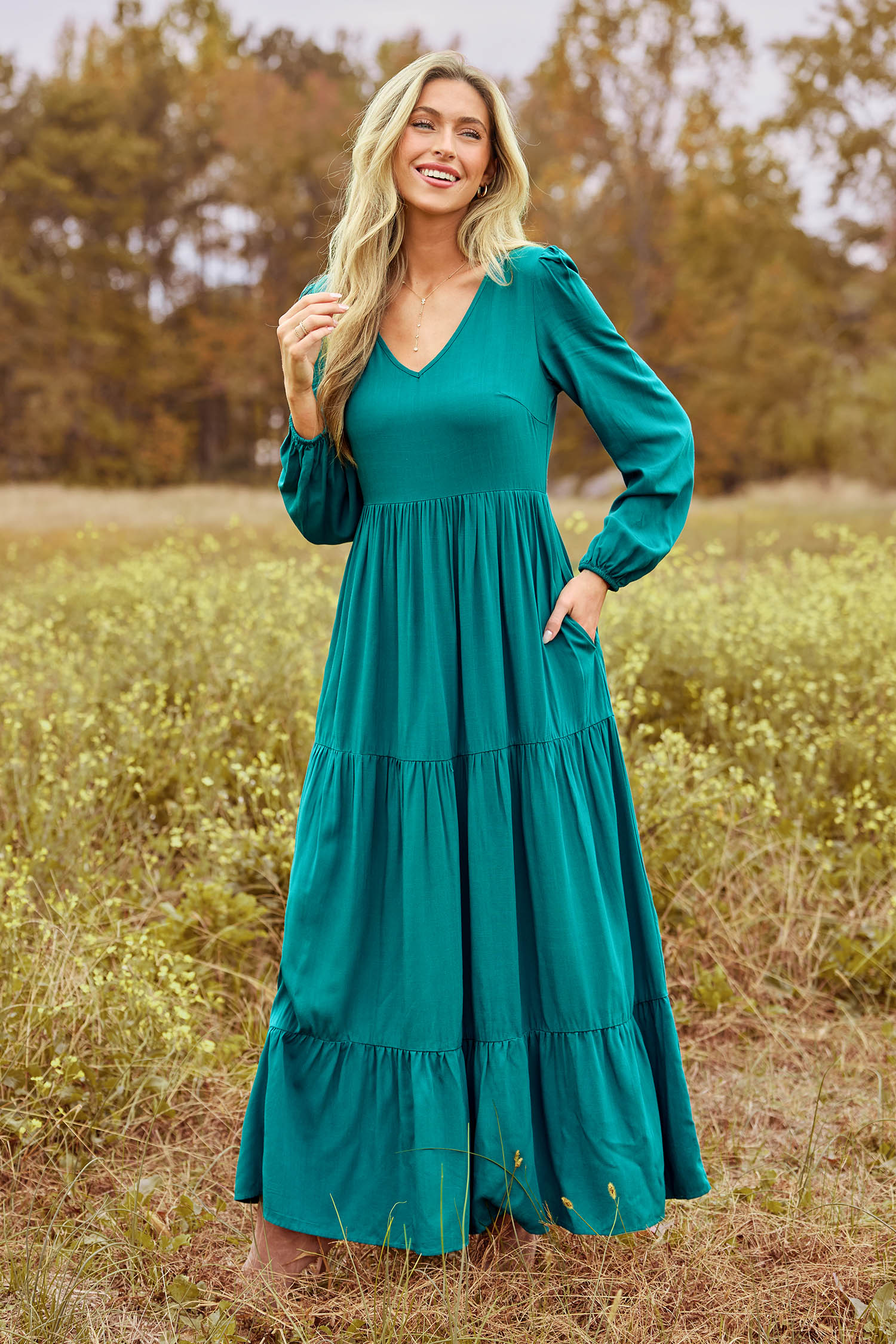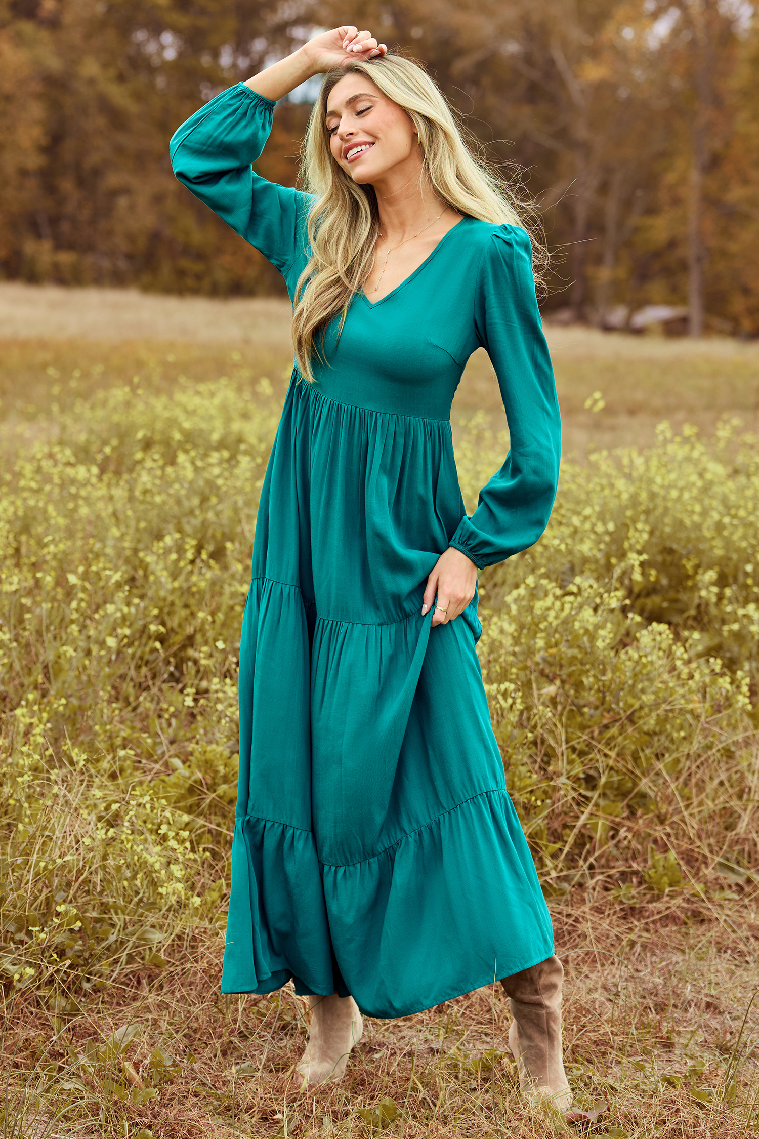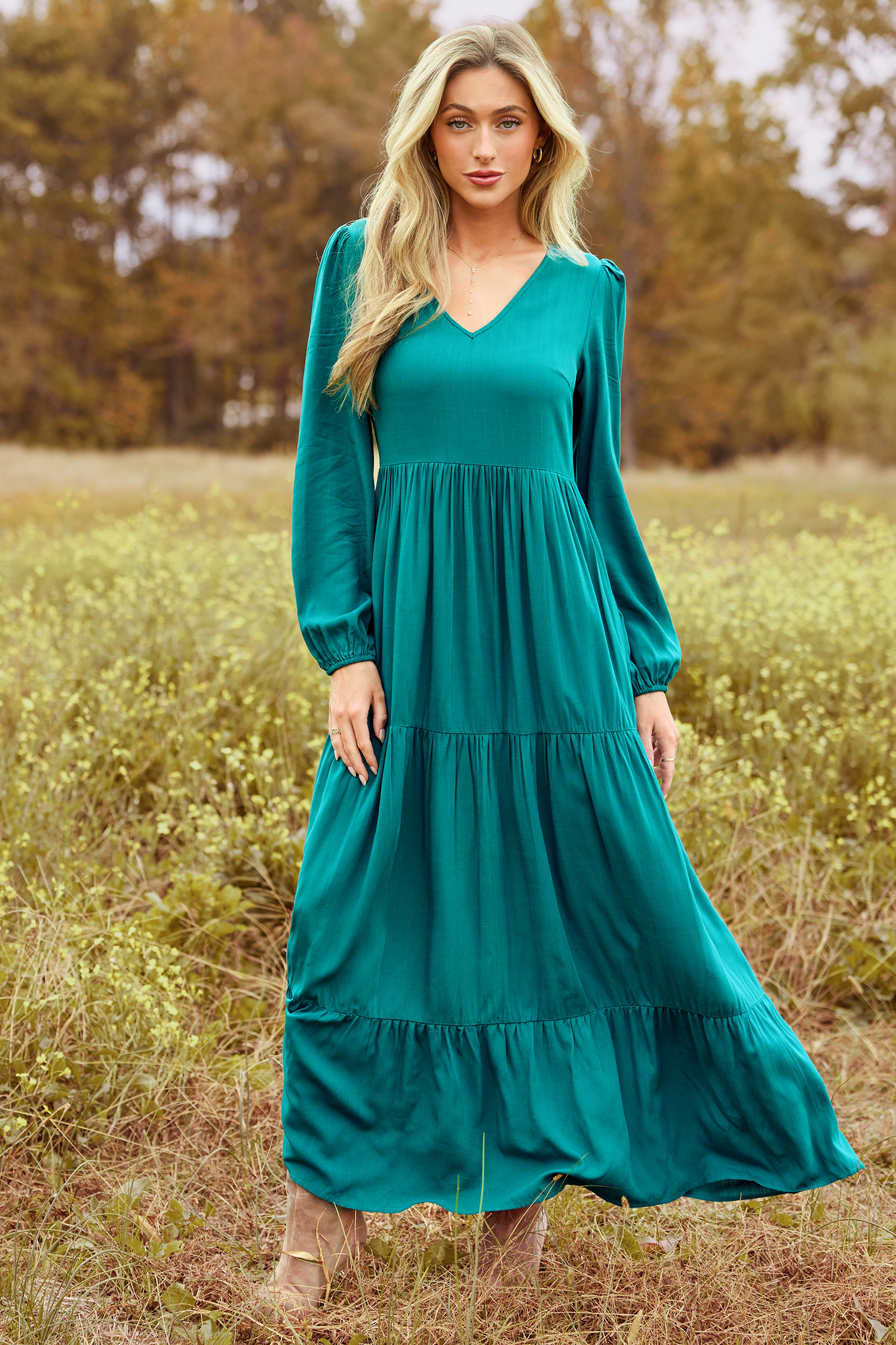Blaues Maxikleid mit V-Ausschnitt und ausgestellten Ärmeln