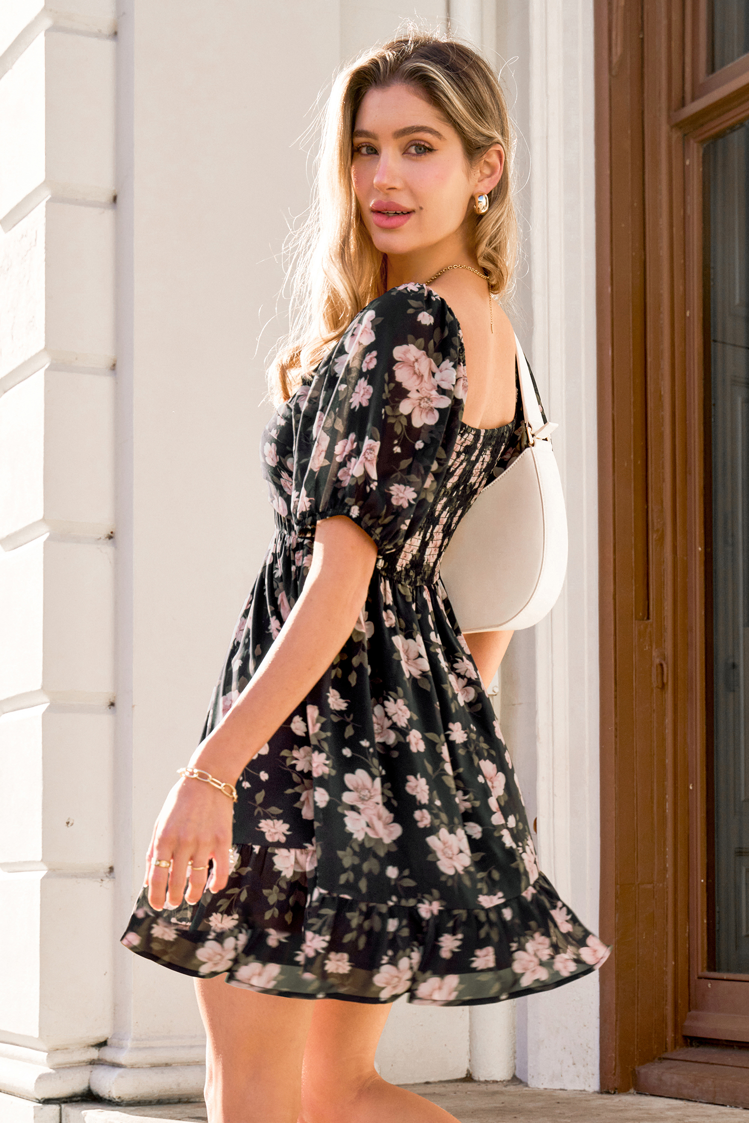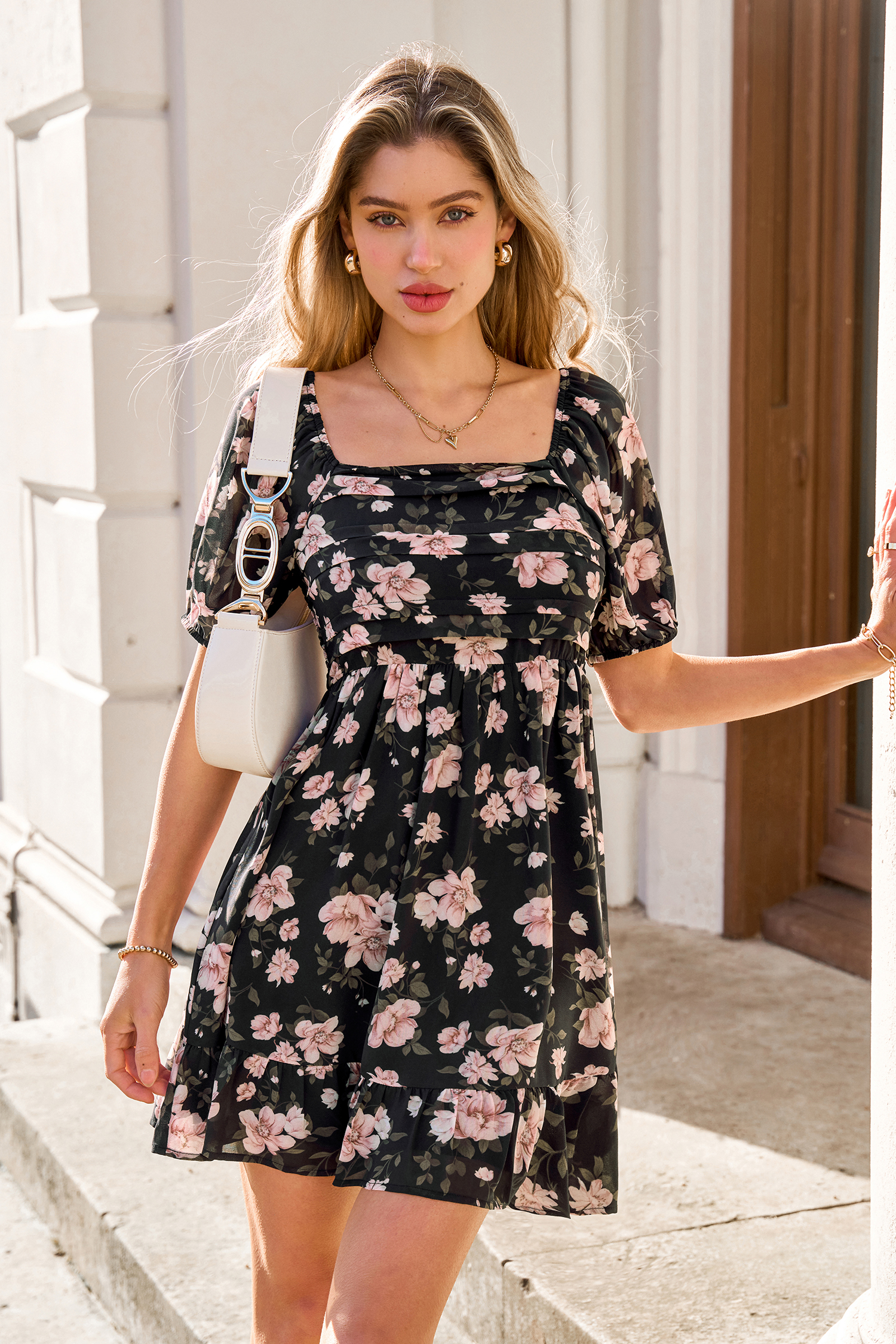 Geblümtes Minikleid mit Herzausschnitt und Rüschenbesatz