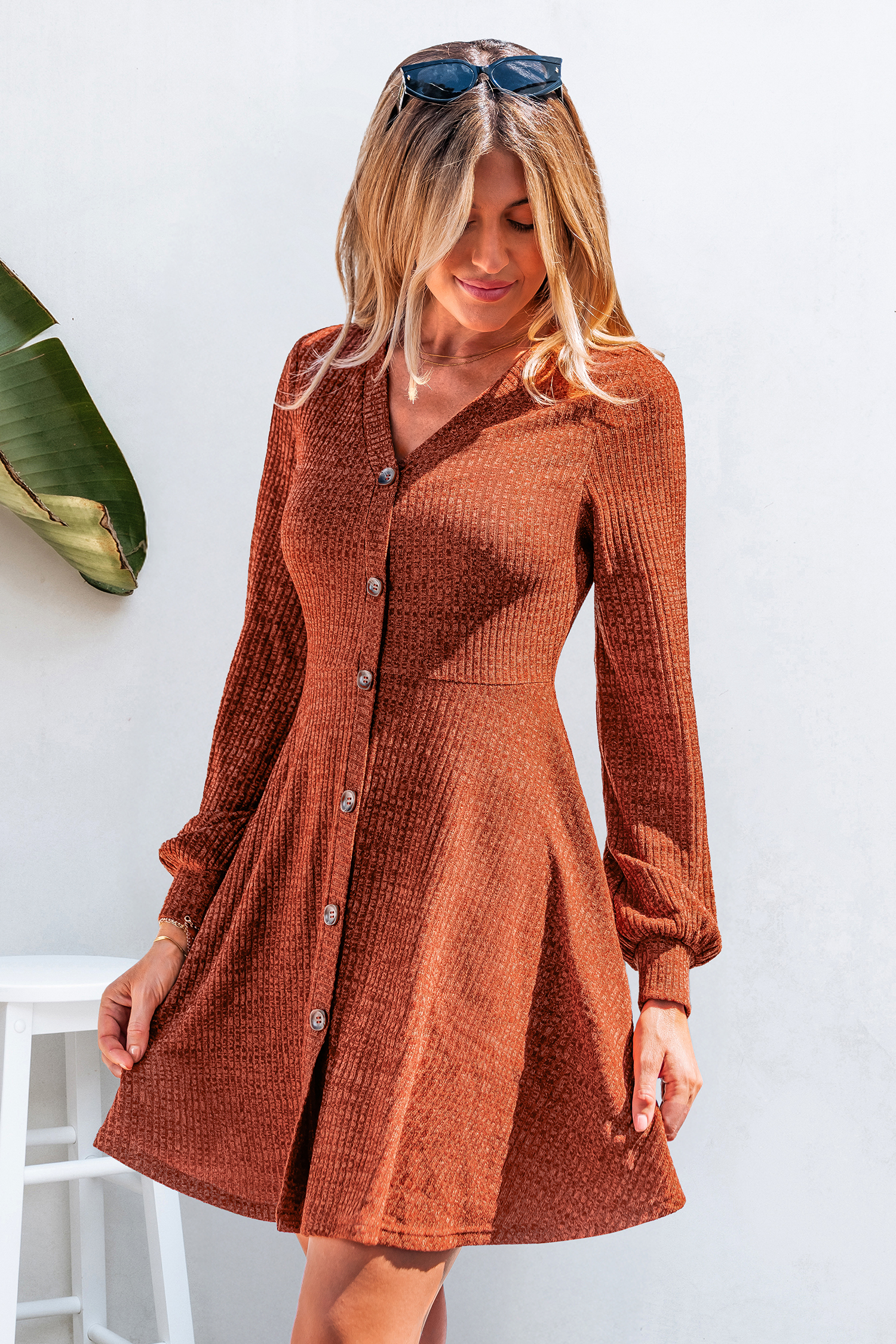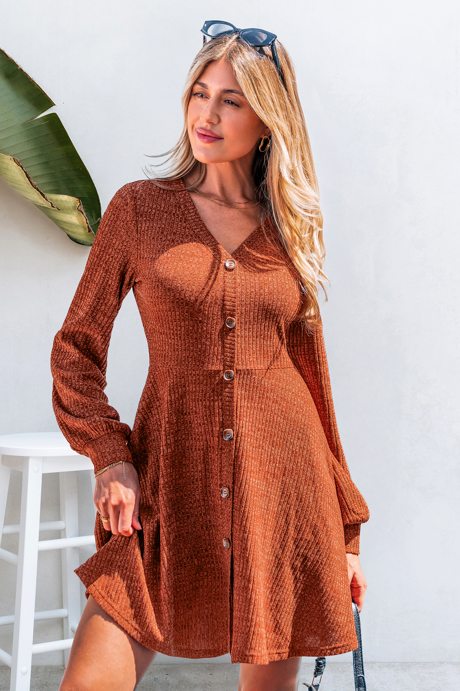 Das Minikleid ist verspielt, kokett und voller Herbststimmung! Mit seinem V-Ausschnitt, den langen Ärmeln und der Minilänge ist es perfekt für gemütliche Abende oder legere Ausflüge mit einem warmen, saisonalen Touch.
