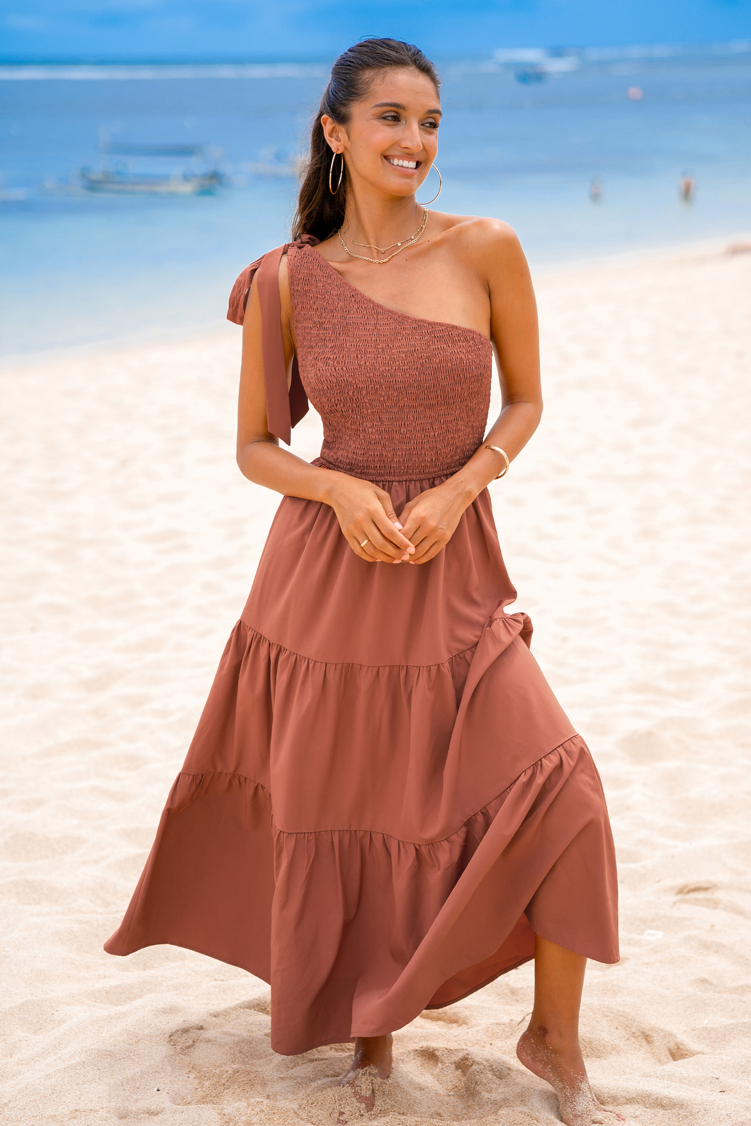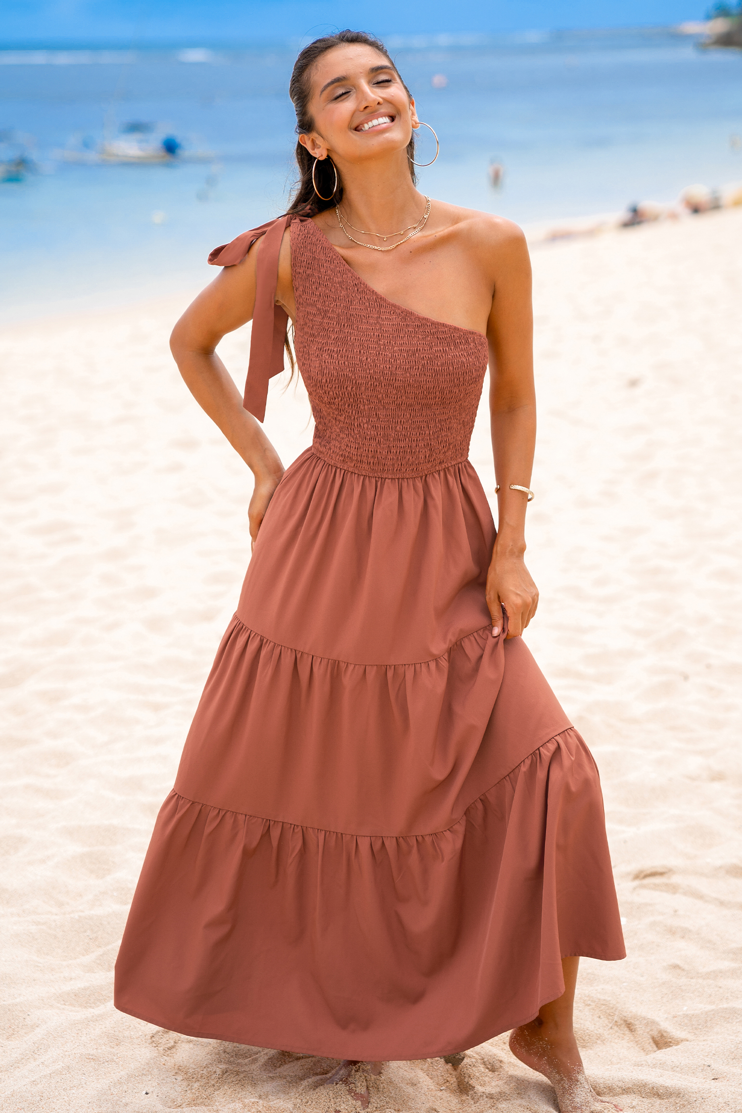 Ziegelrotes One-Shoulder-Maxikleid mit gesmoktem Oberteil