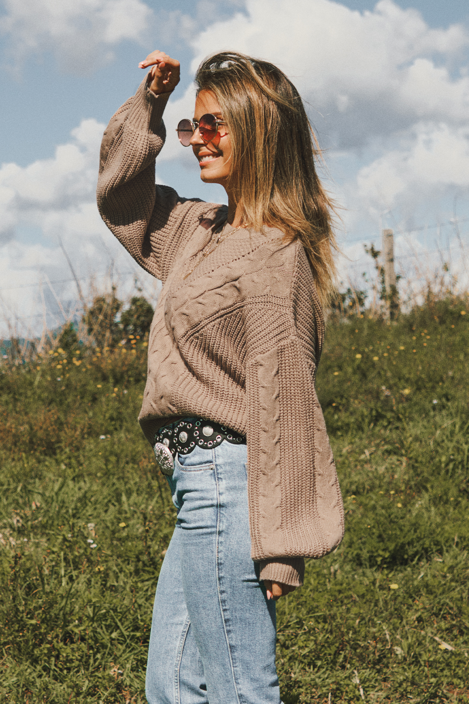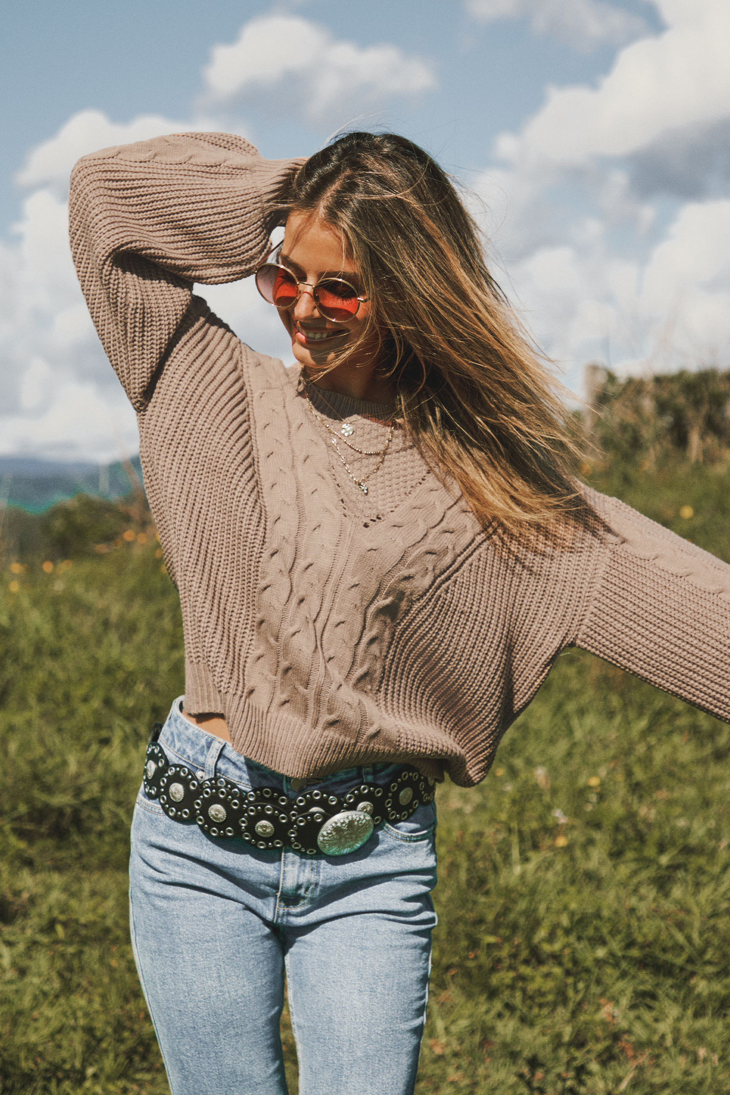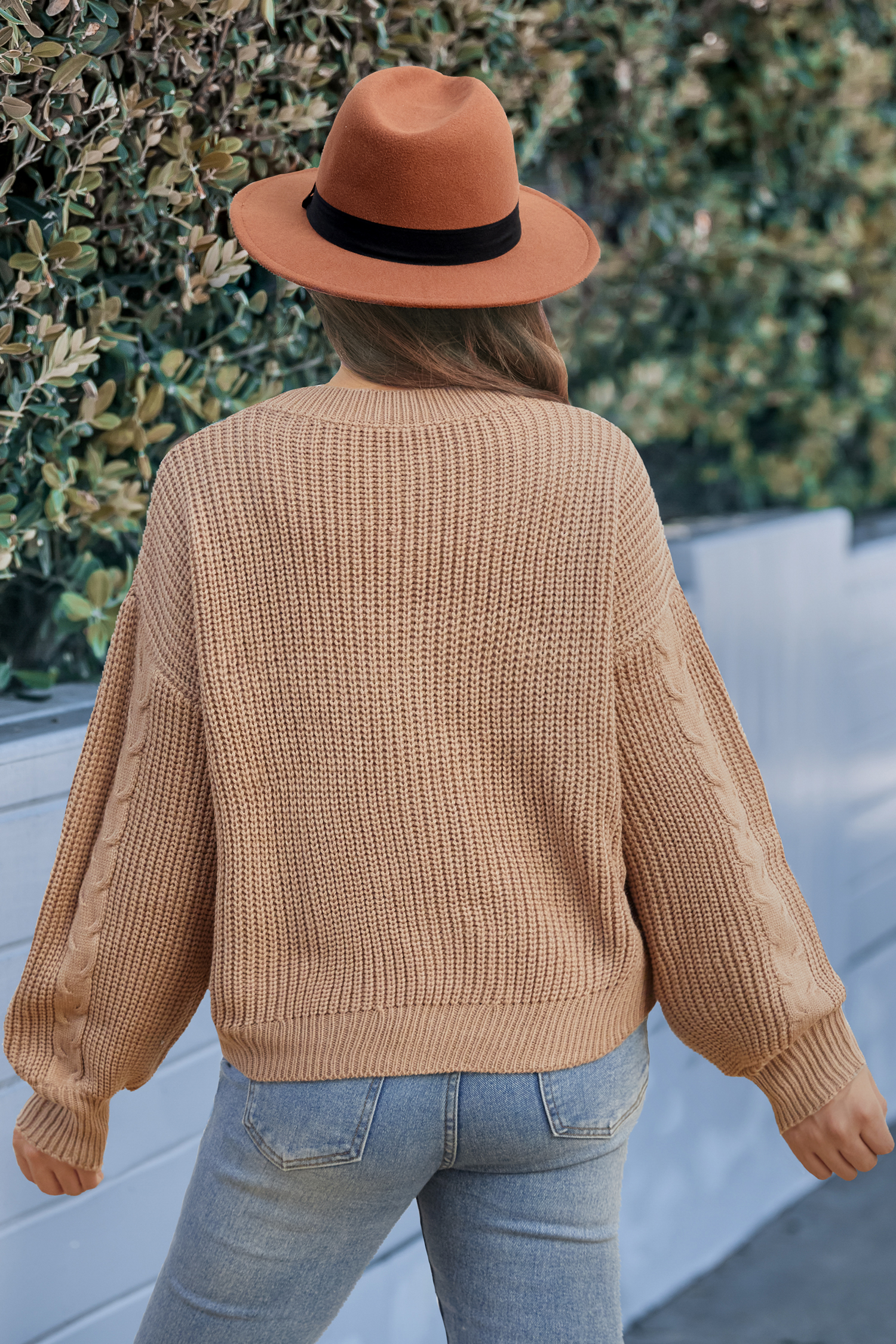 Brauner Strickpullover mit Zopfmuster und langen Ärmeln