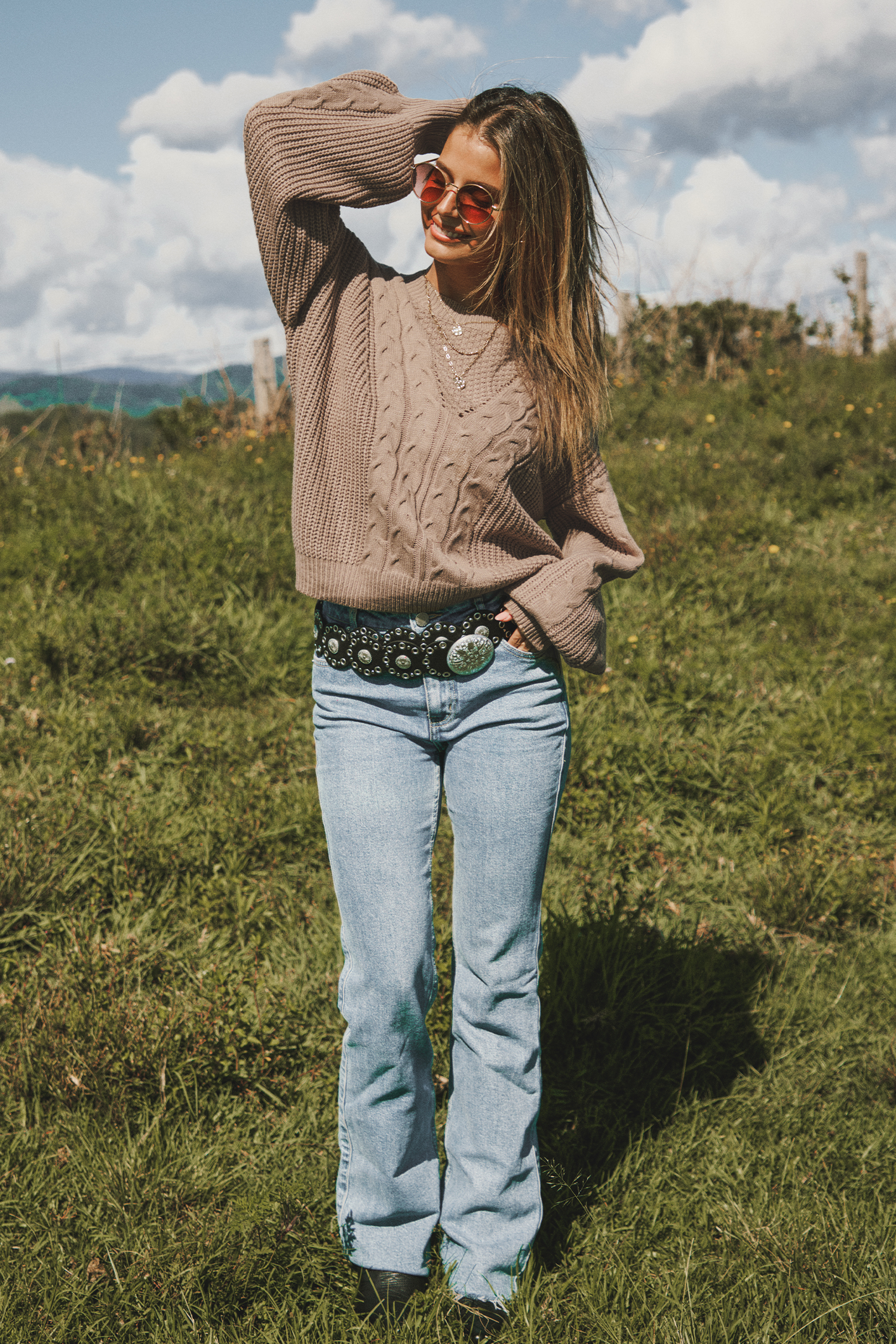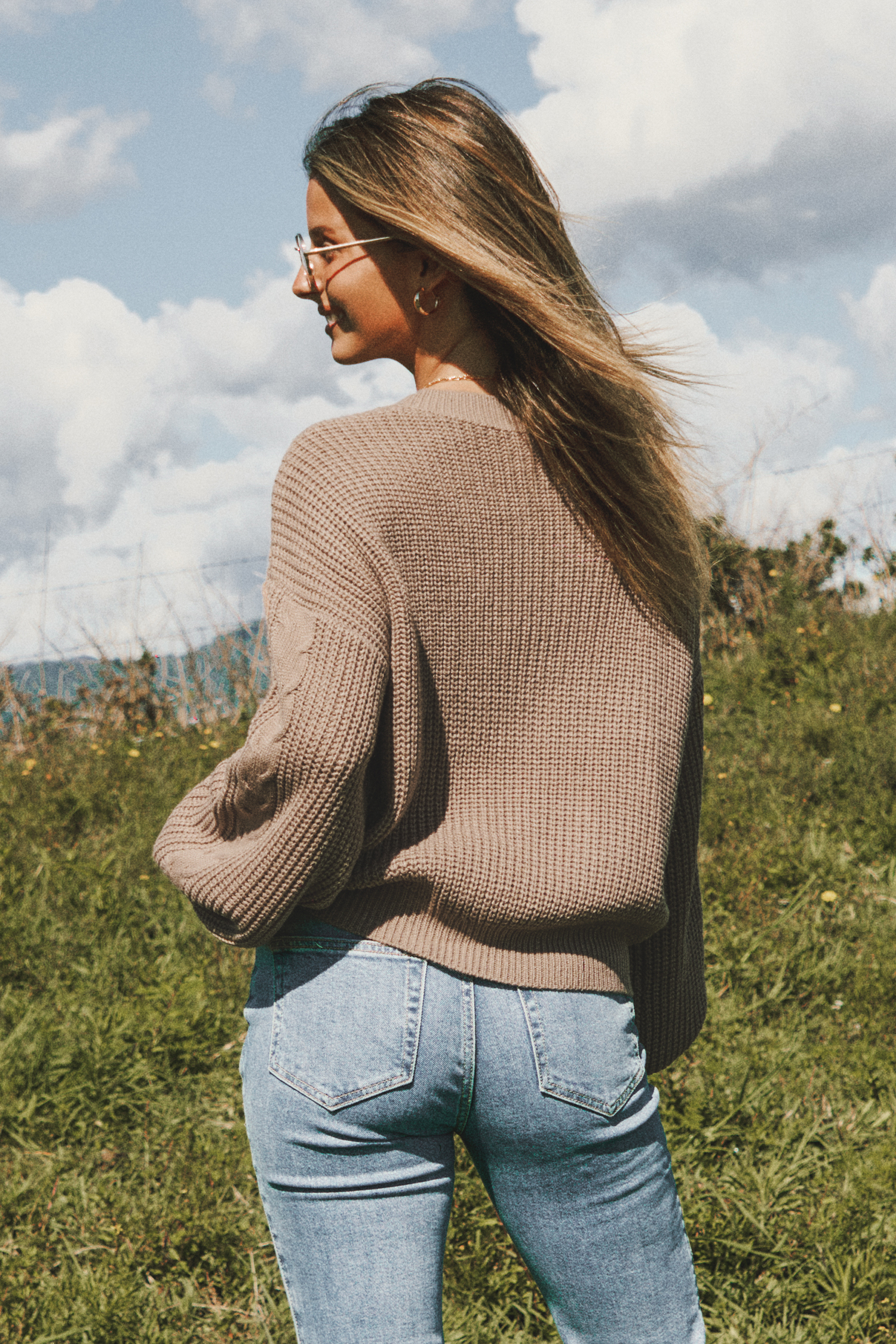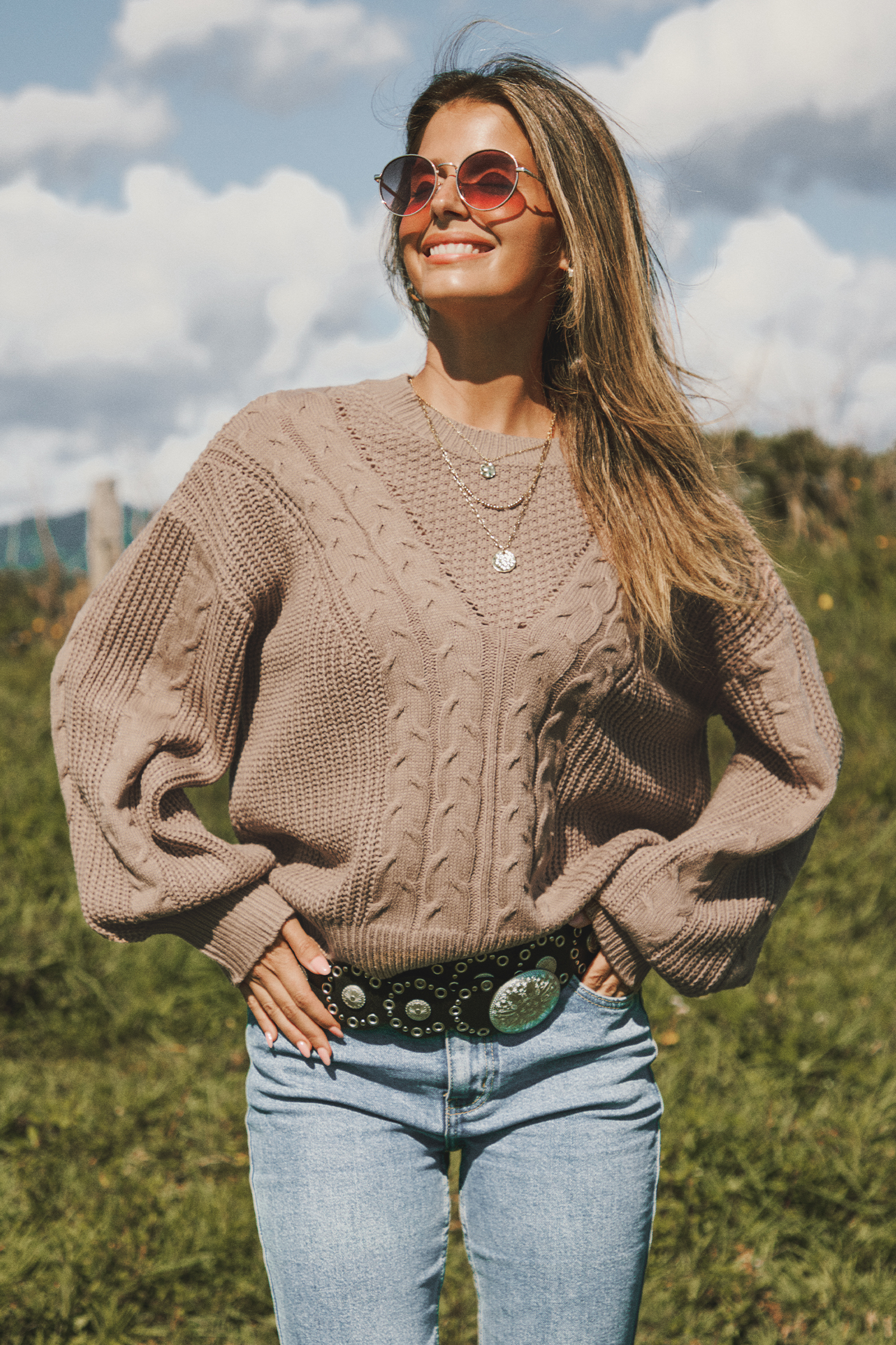 Brauner Strickpullover mit Zopfmuster und langen Ärmeln