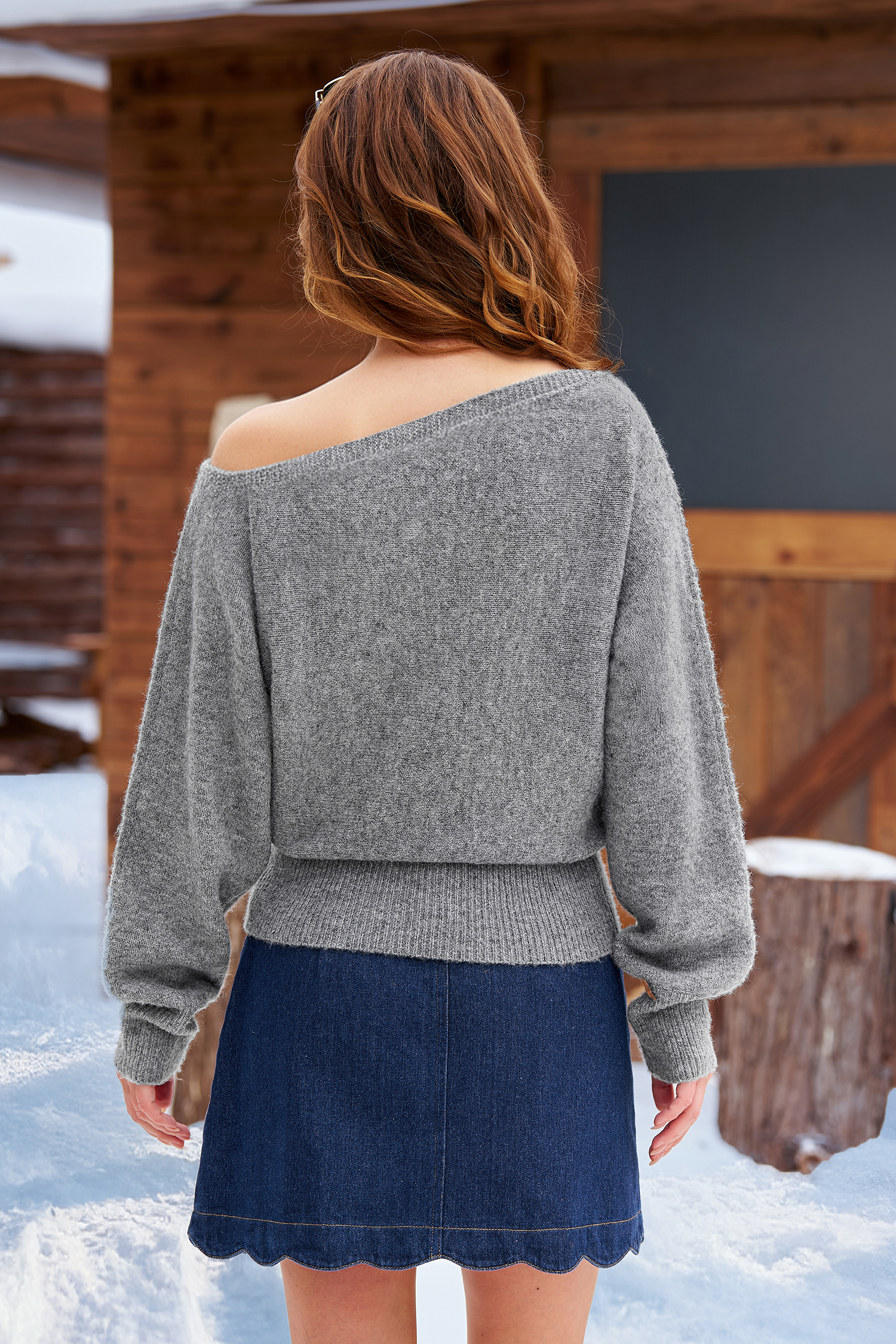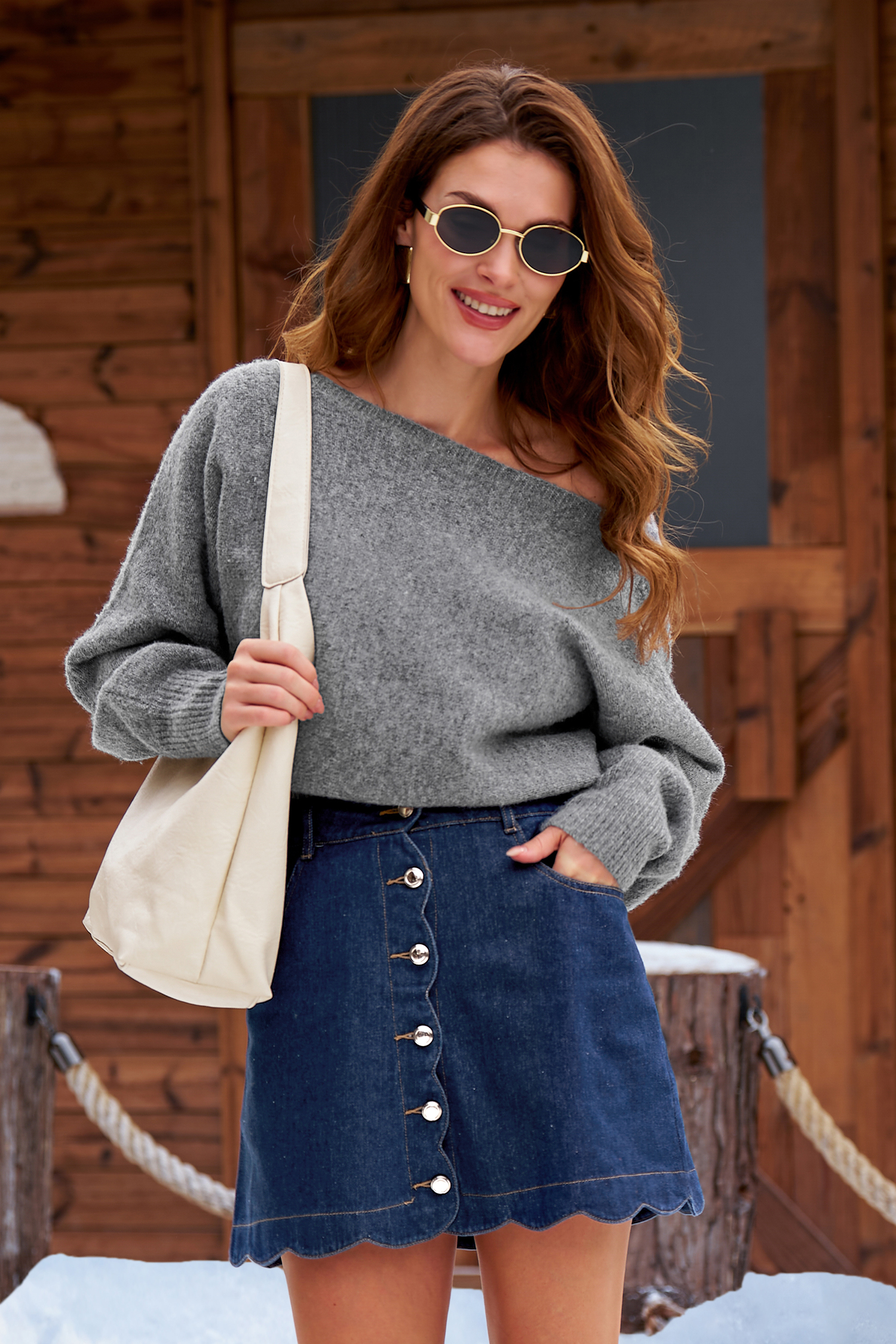 Der graue Pullover ist perfekt für unbeschwerte, fröhliche Momente! Mit U-Boot-Ausschnitt, langen Ärmeln und betonter Taille ist er ein kuscheliger Pullover mit verspieltem Touch.