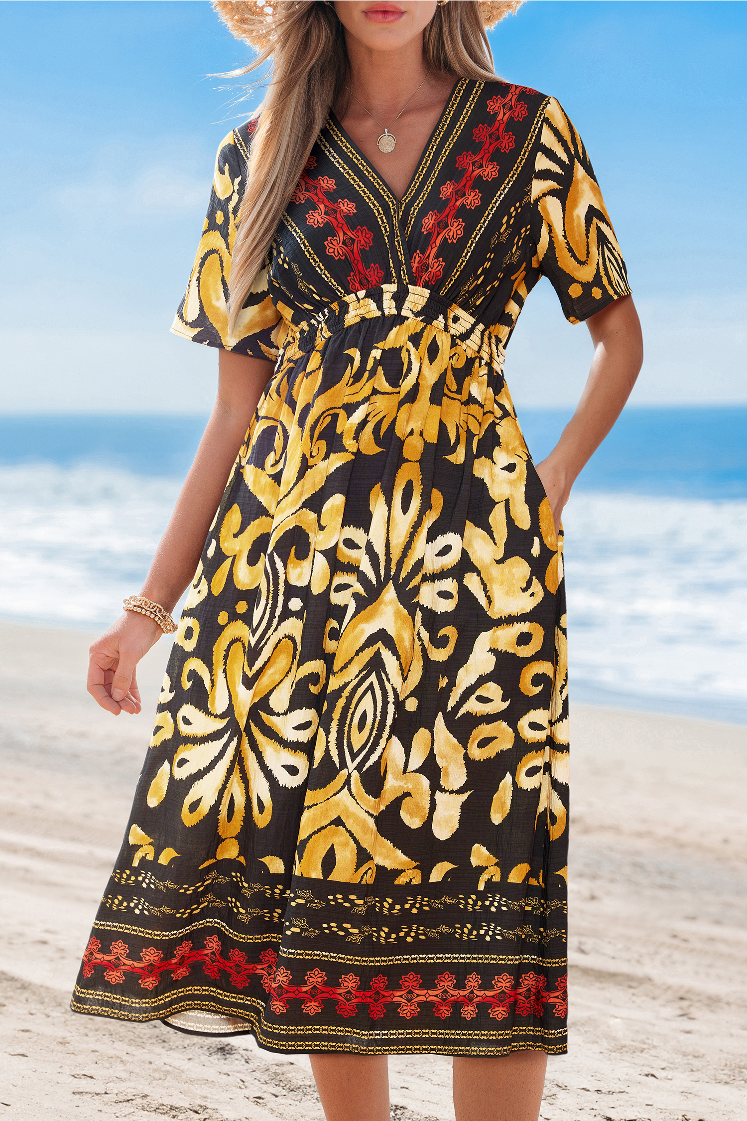 Das Midikleid verleiht Ihrer Garderobe einen warmen, zeitlosen Touch! Mit seinem überkreuzten Ausschnitt und den kurzen Ärmeln schafft die Midi-Länge die perfekte Balance zwischen Eleganz und Lässigkeit.
