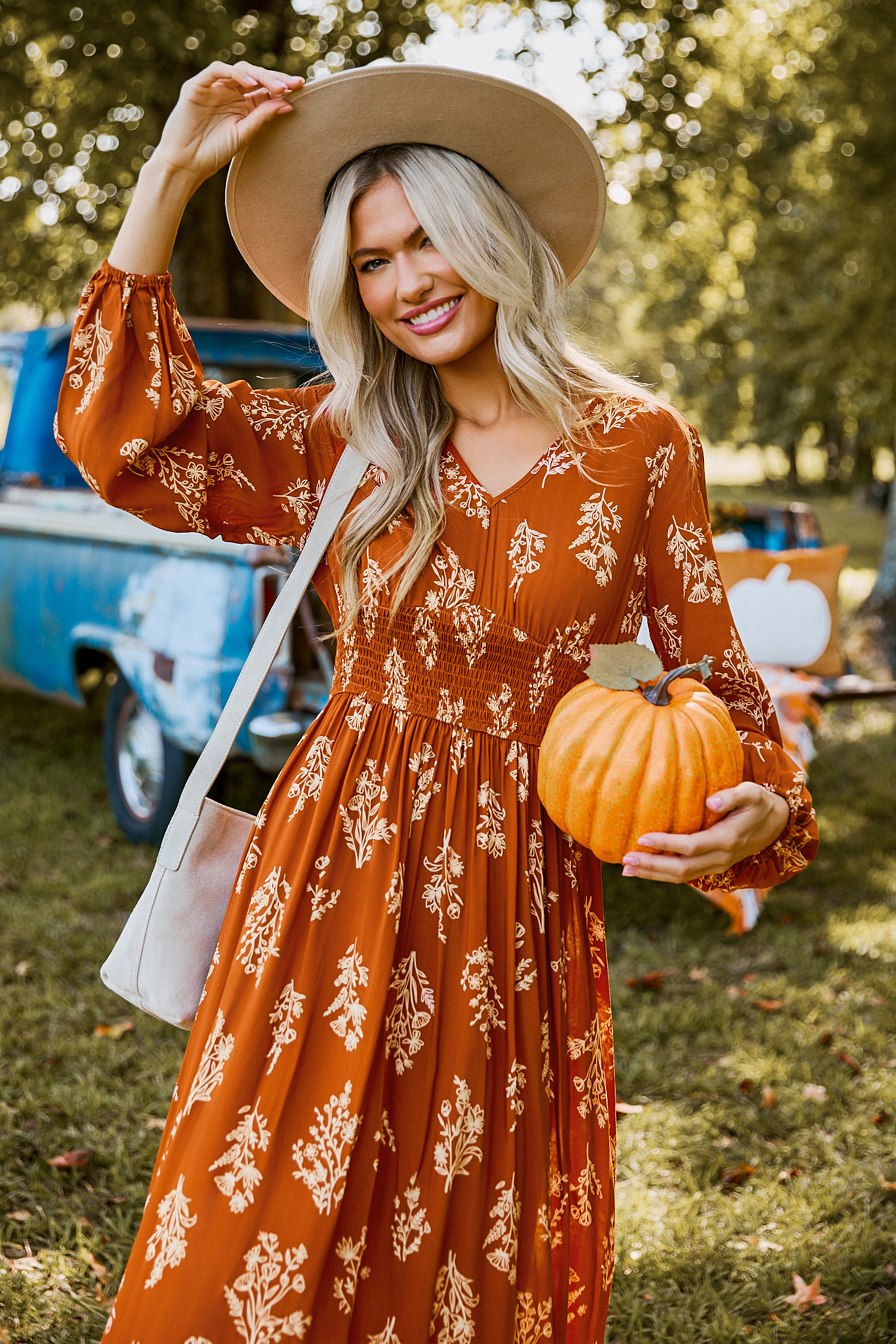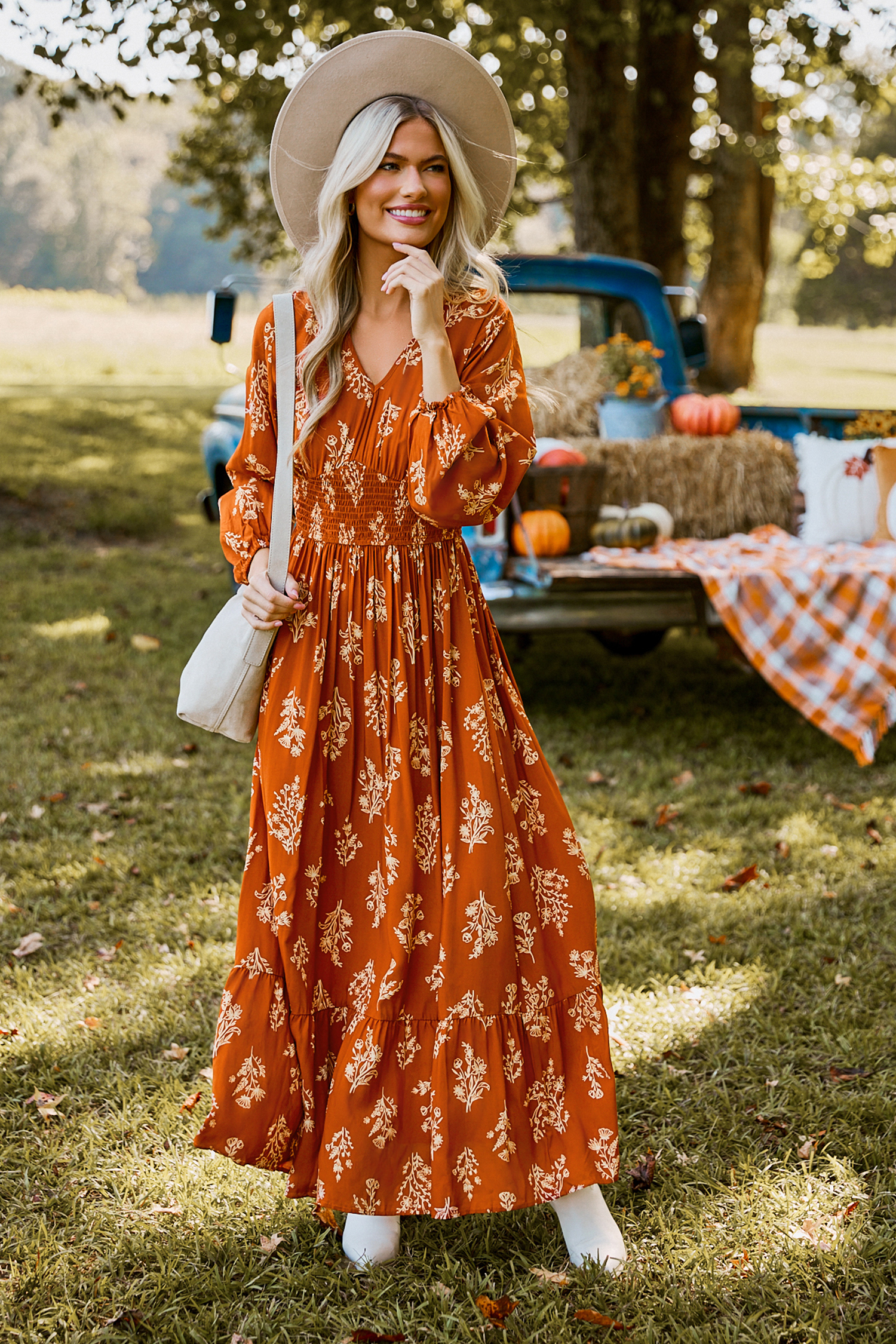 Das Orange Maxikleid kombiniert atemberaubende Blumen mit einer schmeichelhaften gesmokten Taille für einen Look, der sowohl bequem als auch fesselnd ist.