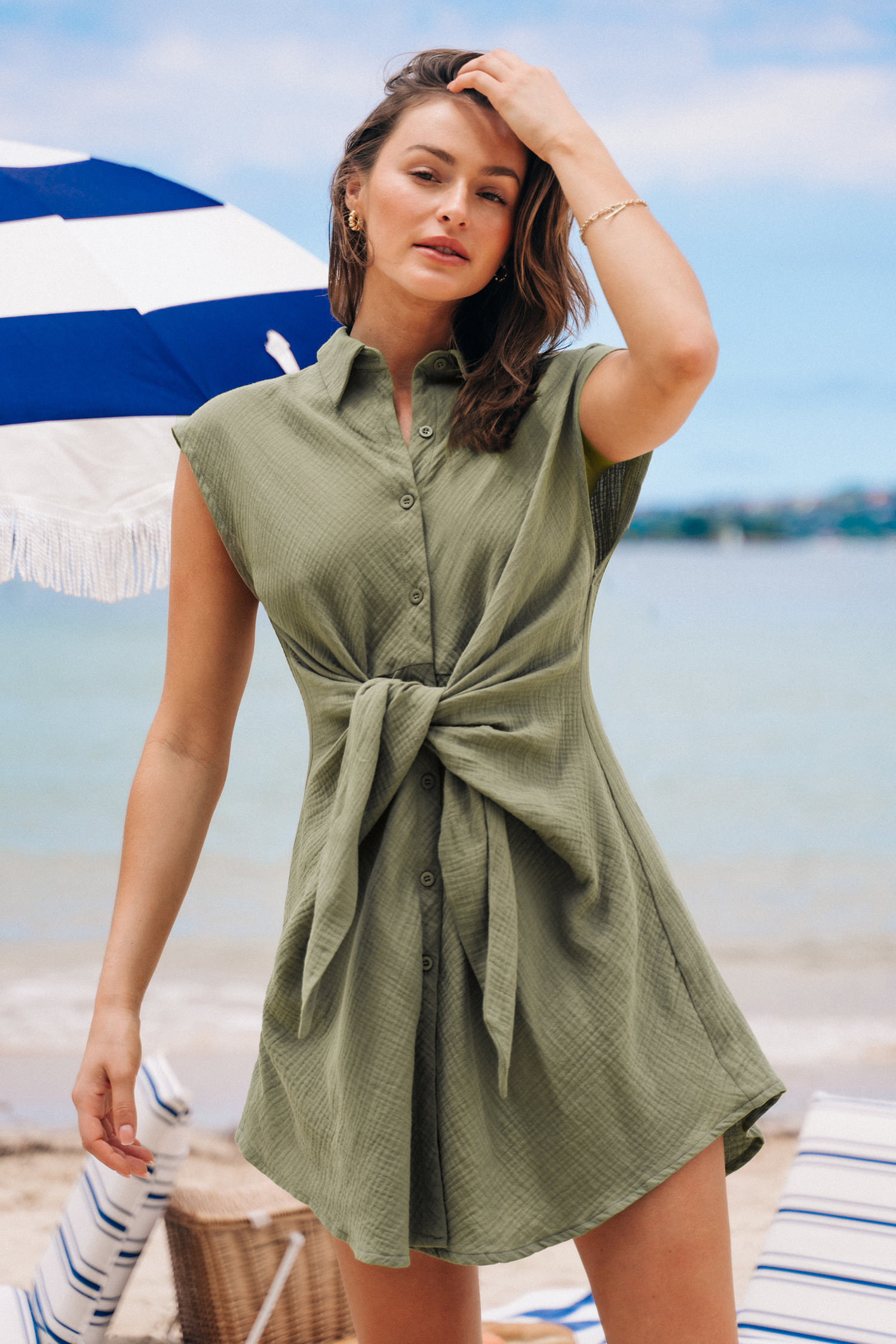 Reine Baumwolle Button-Up & Taillenbinde Cover-Up-Kleid