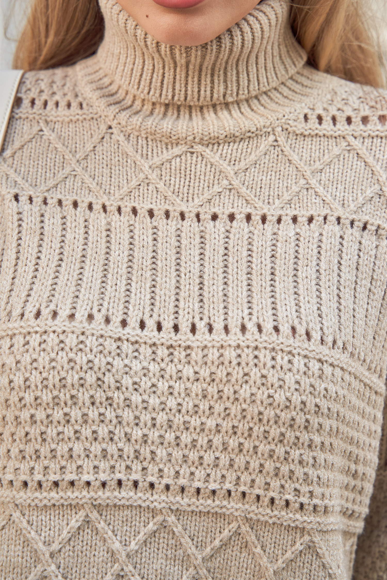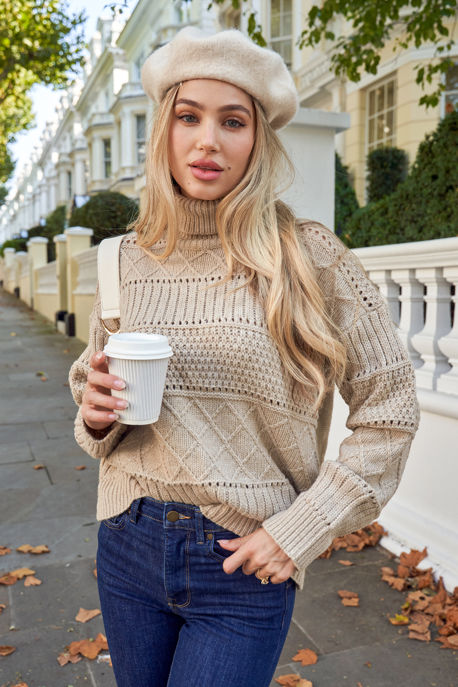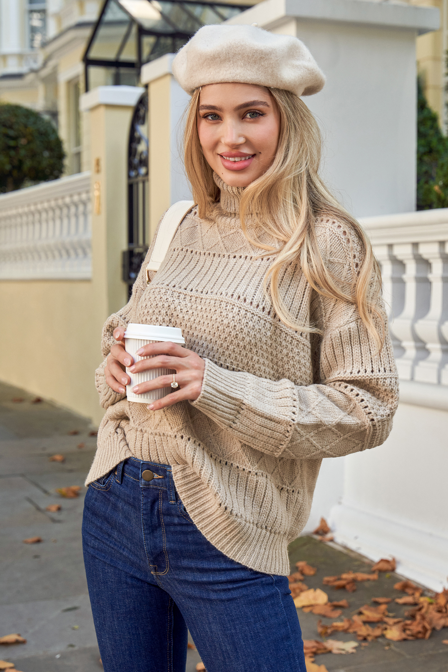 Kamelfarbener Langarm-Rollkragenpullover mit Zopfmuster