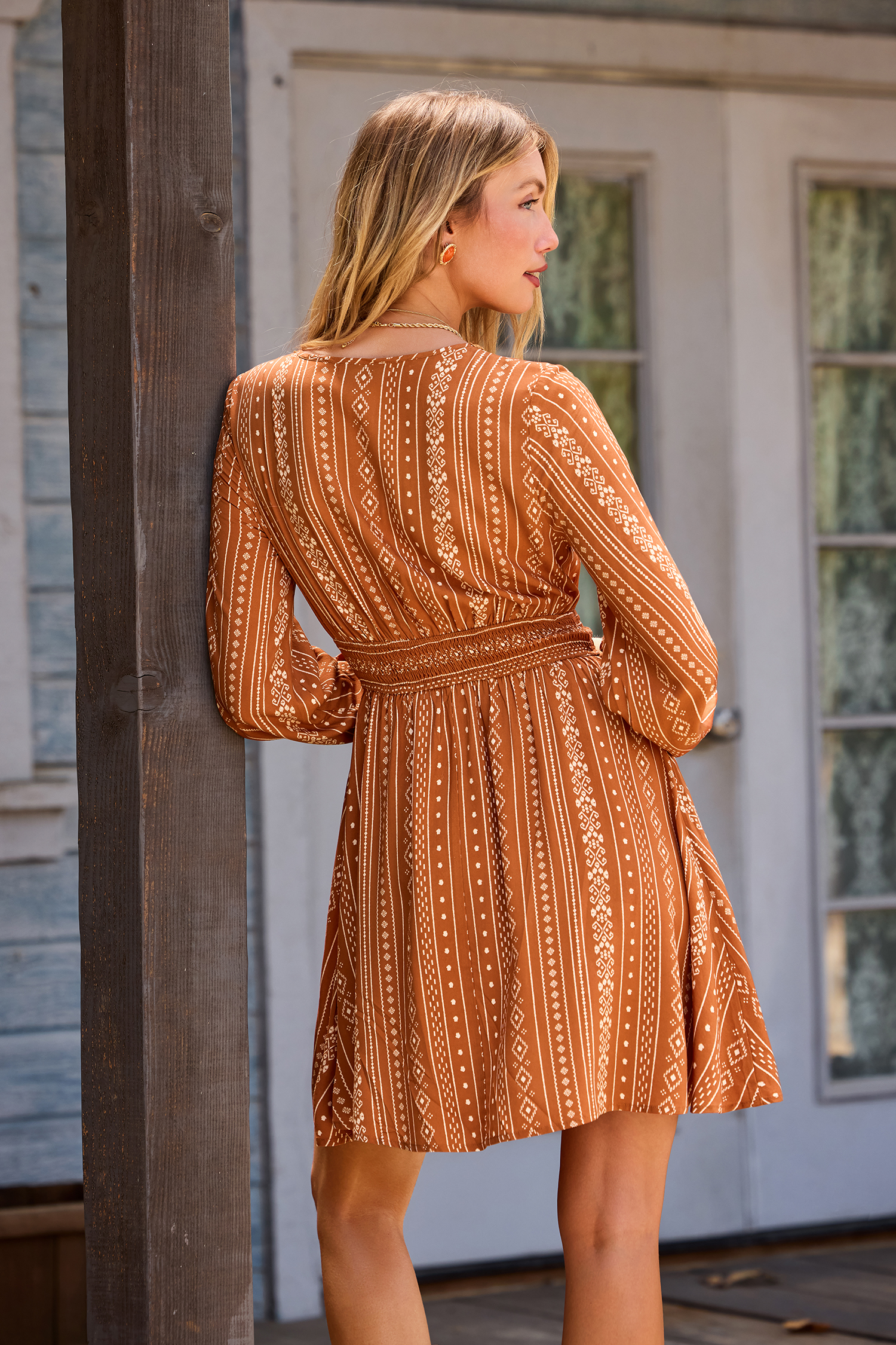 Boho Braunes Tiefer Ausschnitt Lange Ärmel Minikleid
