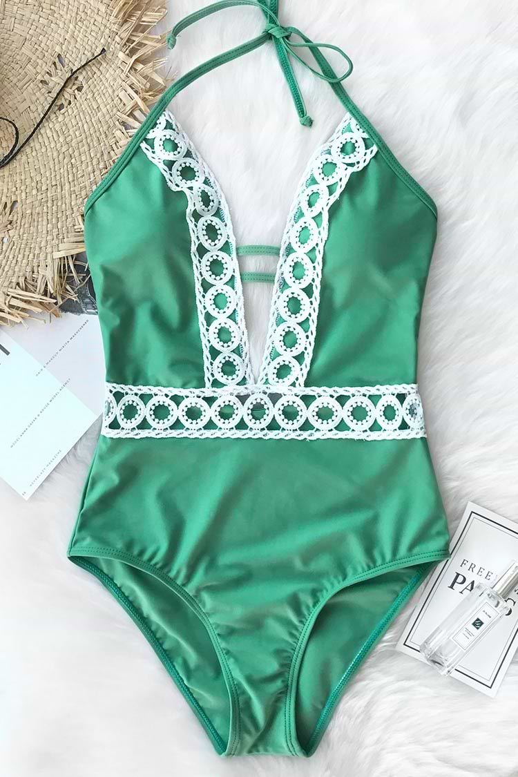 Schwarz-Weißer Neckholder-Monokini-Badeanzug mit Kettendetail