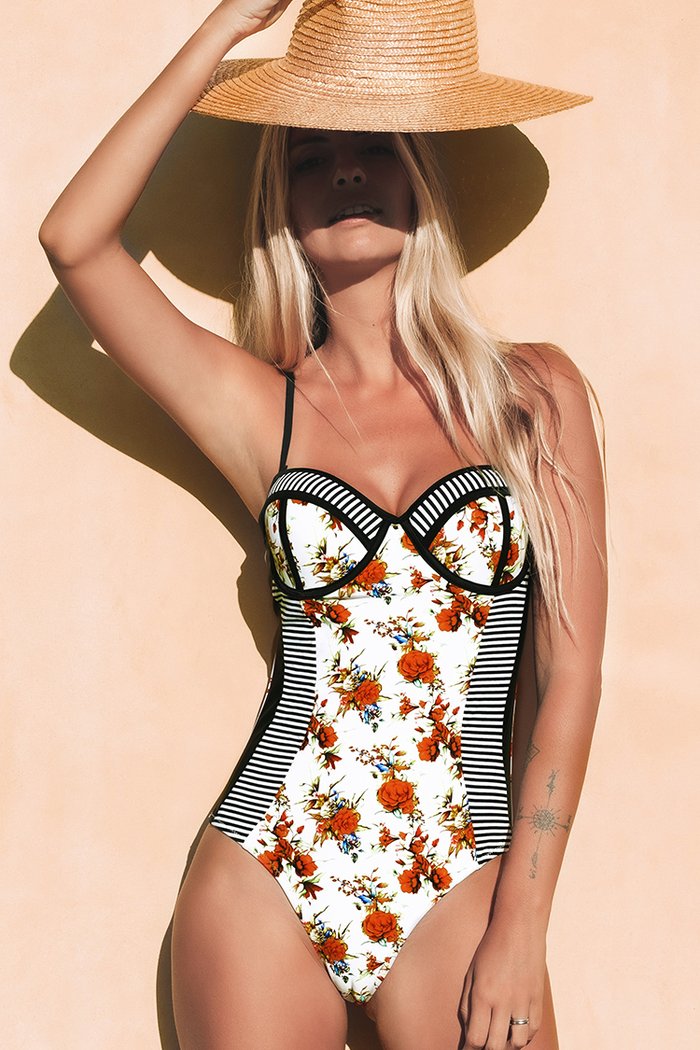 Einteiliger Badeanzug mit Blumendruck und Streifen