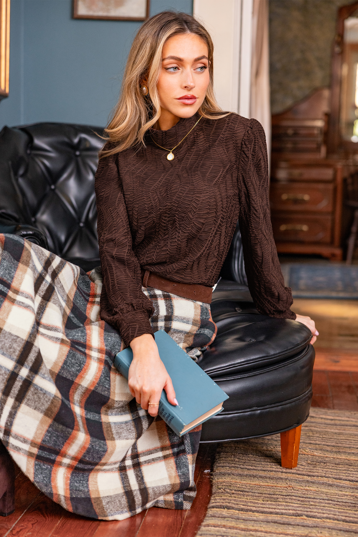 Mit dem braunen Top bleiben Sie mühelos und gemütlich unterwegs! Der hohe Ausschnitt und die langen Ärmel verleihen diesem zeitlosen, vielseitigen Look das gewisse Etwas – perfekt zum Kombinieren oder solo tragen.