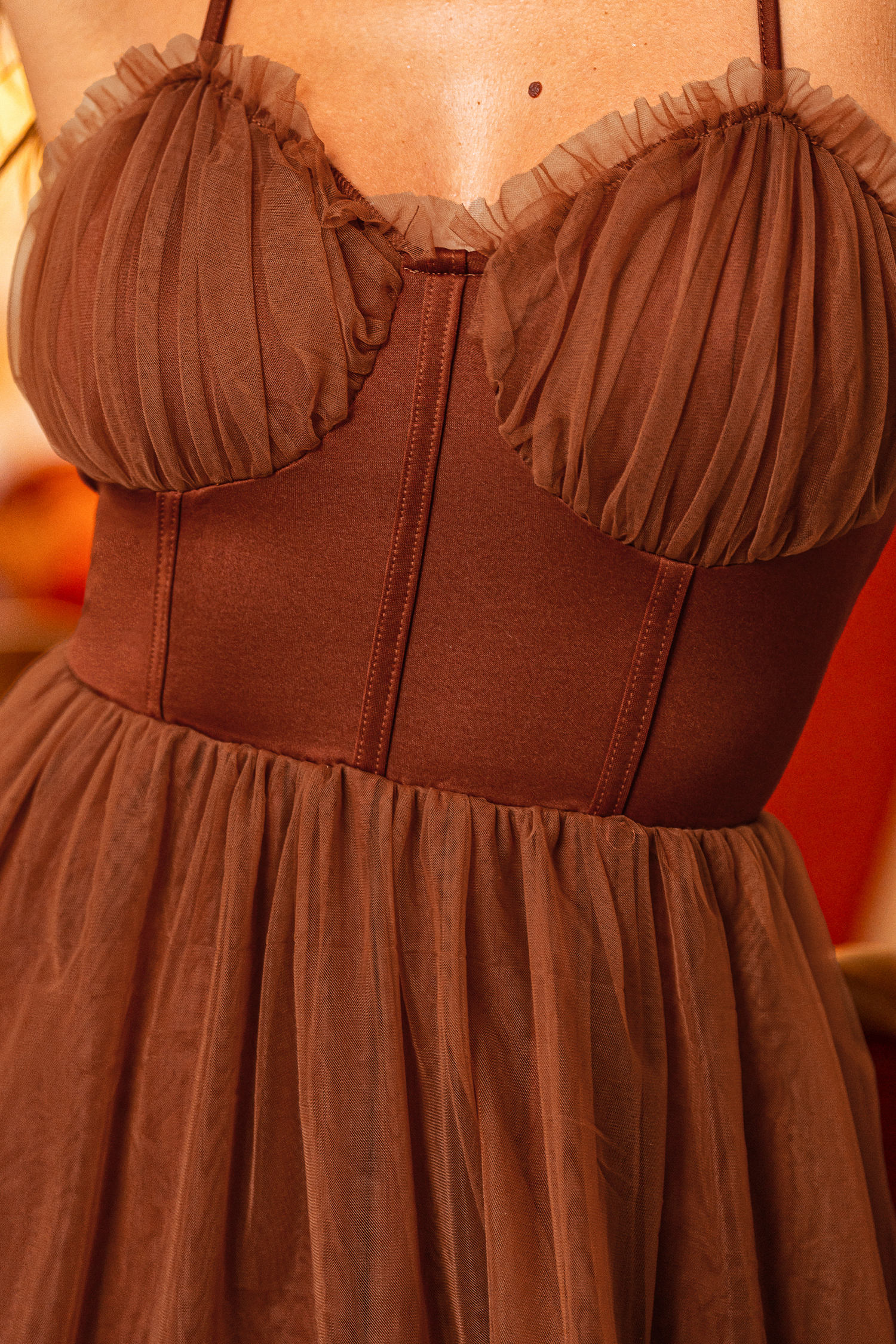 Das Midikleid ist eine kokette, feminine Wahl für Abendveranstaltungen. Mit seinem herzförmigen Ausschnitt, dem ärmellosen Design, dem Rüschenbesatz und der Midi-Länge verbindet es verspielte Details mit einem raffinierten, gehobenen Stil.