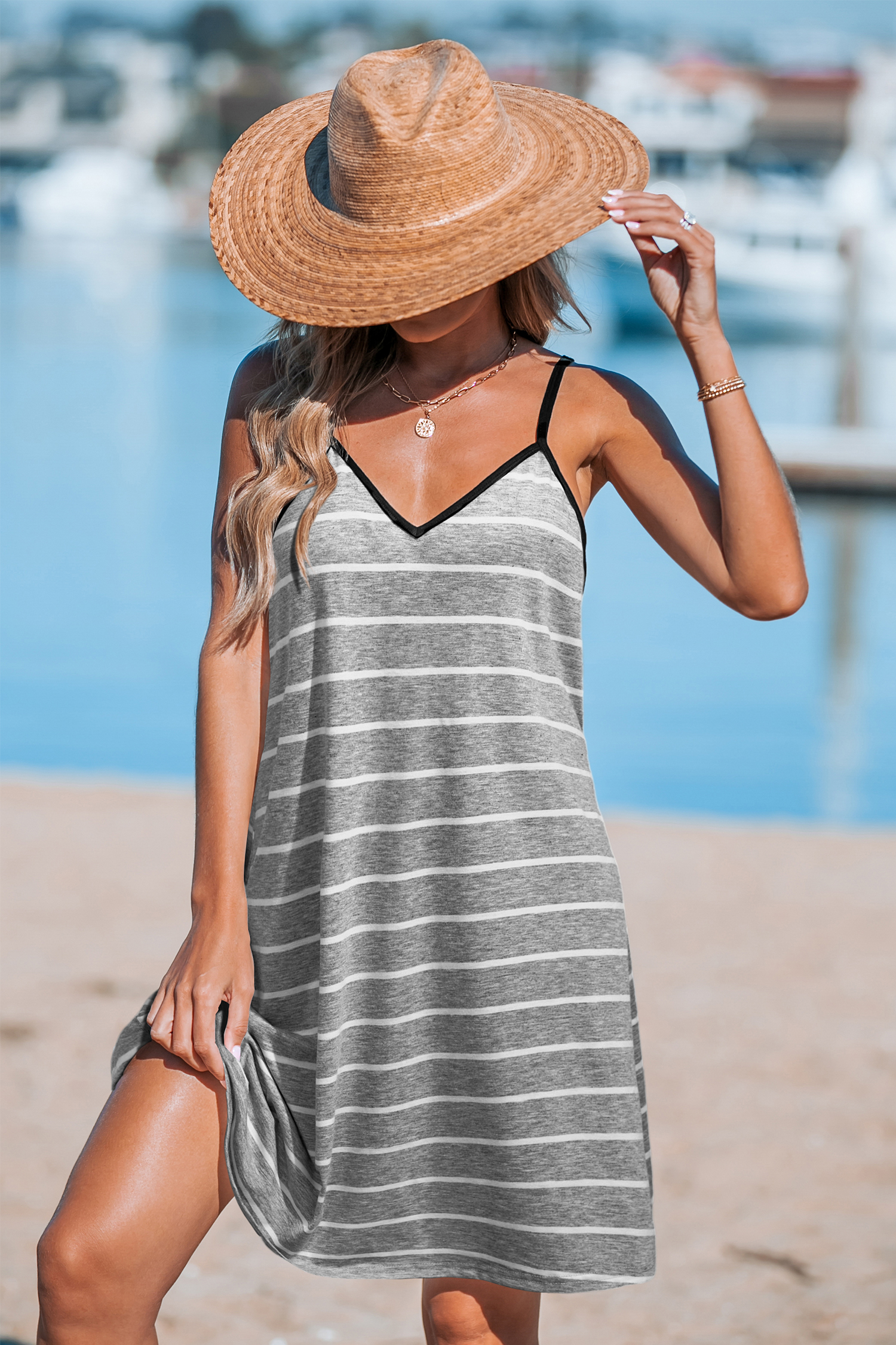 HomeGestreiftes Ärmelloses V-Ausschnitt Mini-Strandkleid