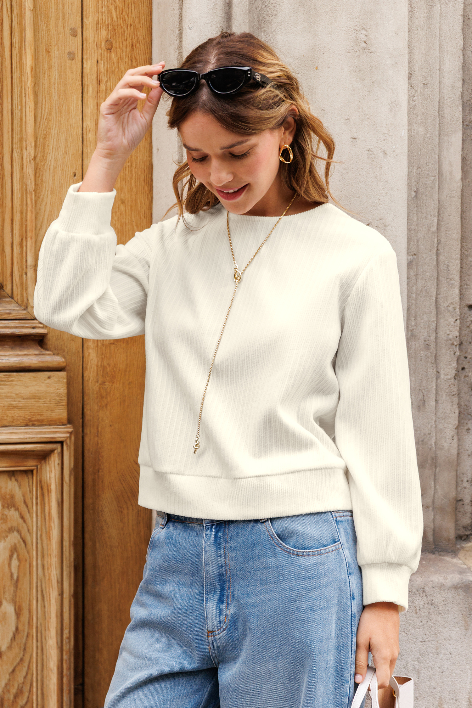 Das weiße Top ist zart, feminin und charmant! Der Rundhalsausschnitt, die langen Ärmel und die Spitzenborte verleihen ihm eine zarte, kokette Note – perfekt für jeden Tag.