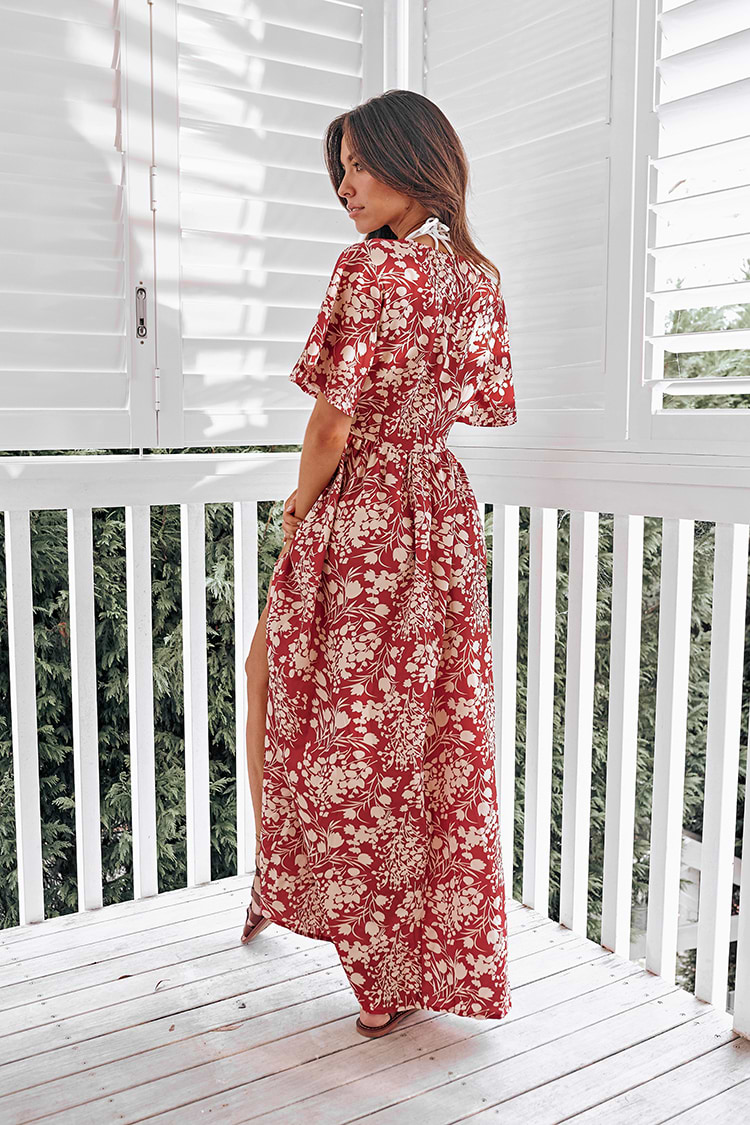 Geblümtes Maxikleid mit V-Ausschnitt und ausgestellten Ärmeln