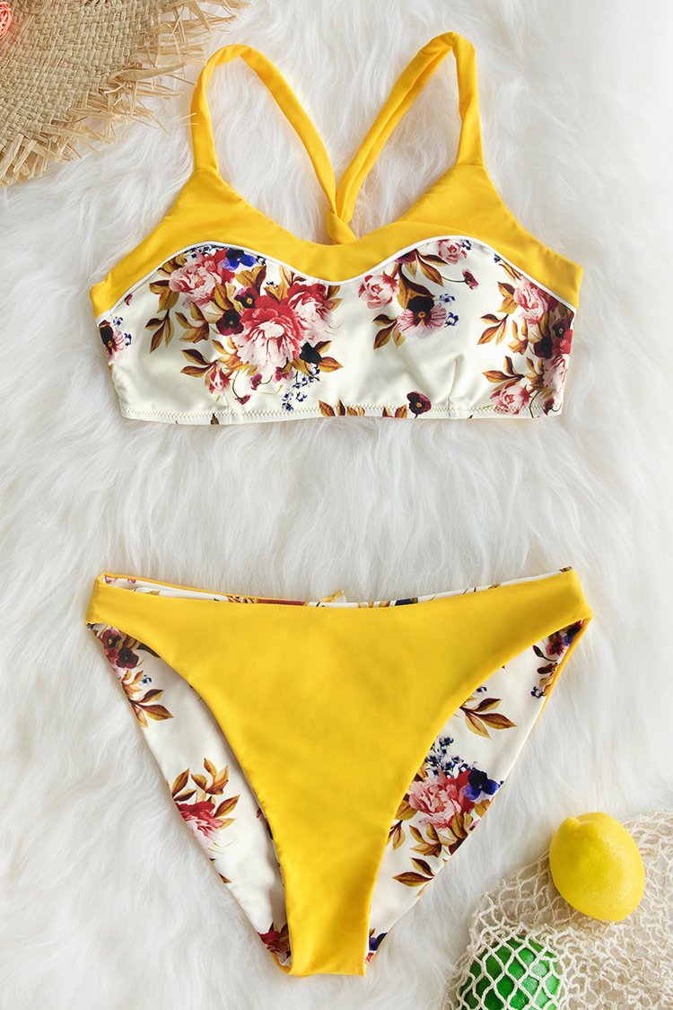 Gelber Bikini mit Blumendruck und reversibele Hose