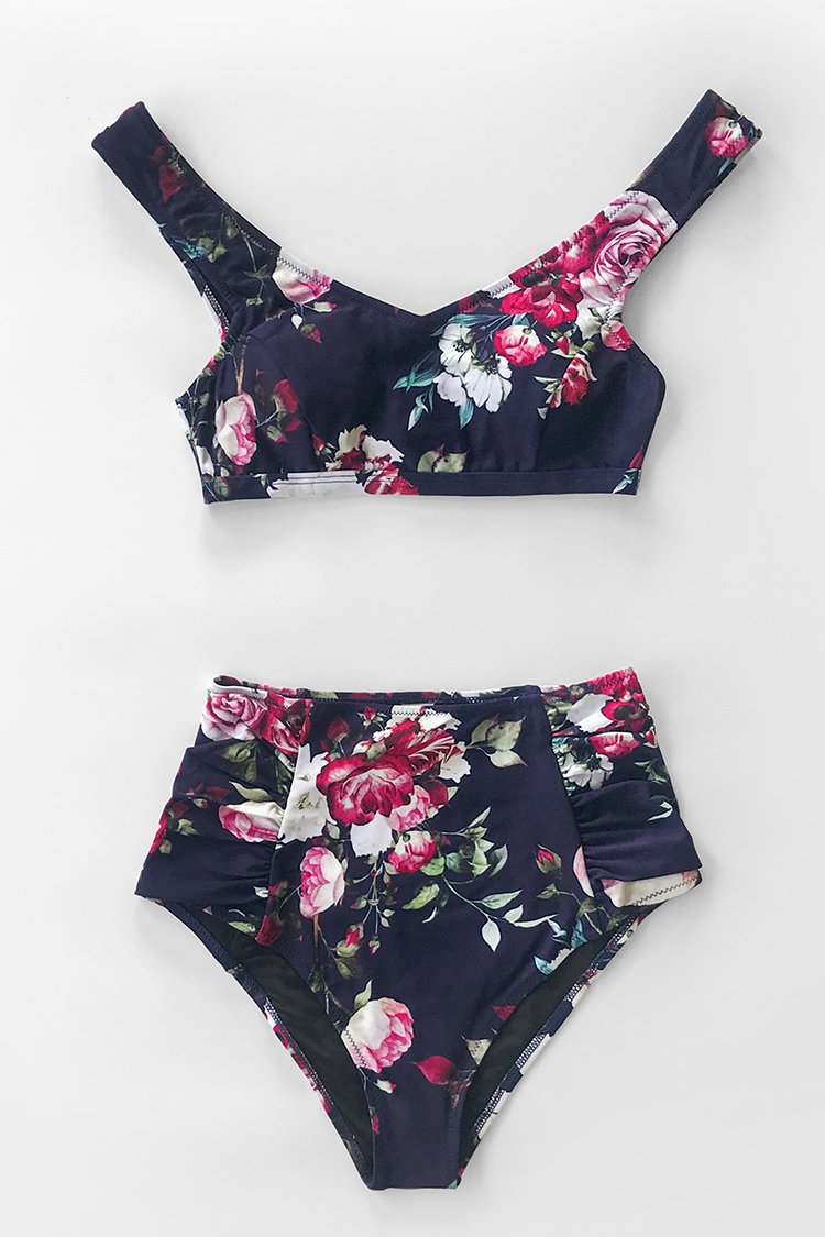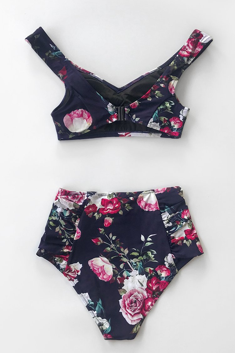 Geraffter Bikini mit High-Waisted und Blumenmuster