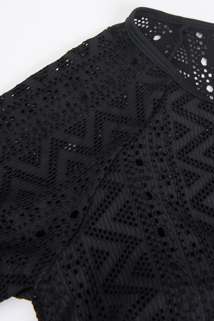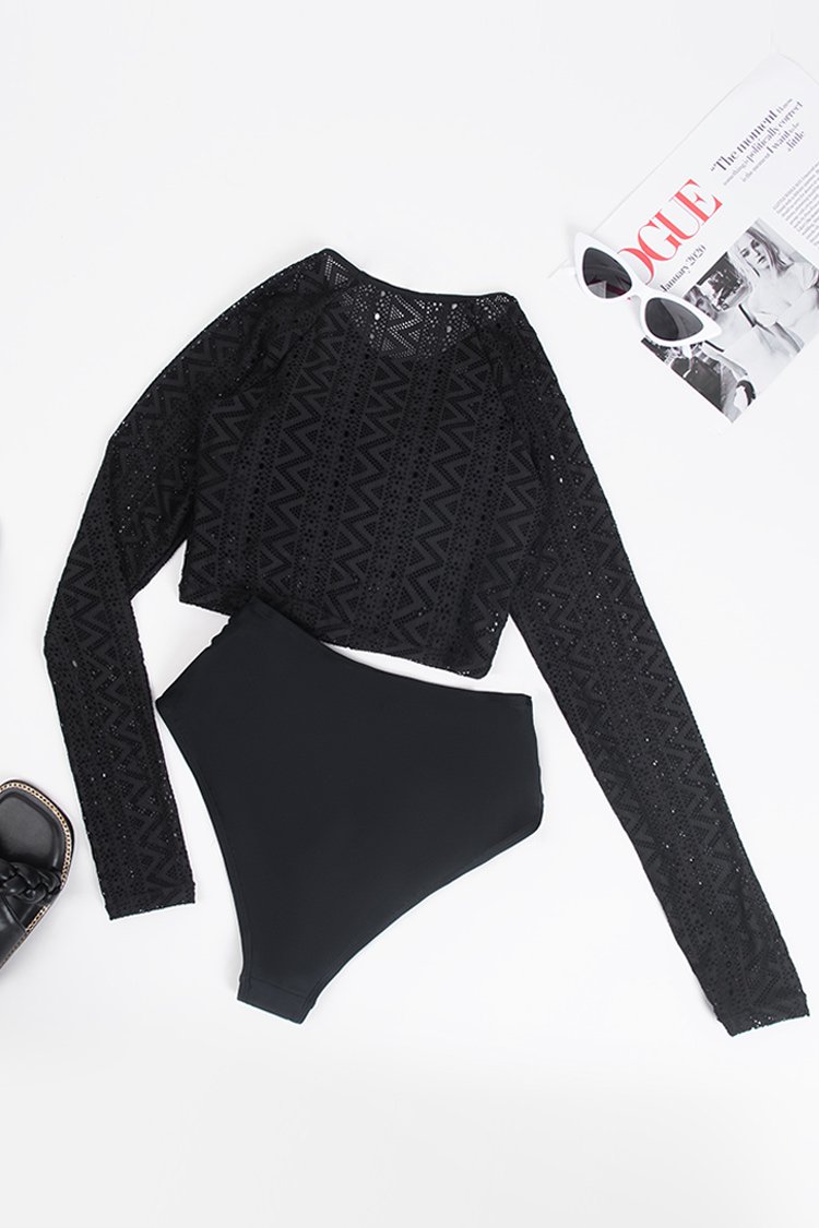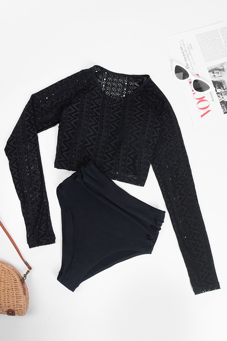 Geraffter High waist Tankini mit langen Ärmeln in Schwarz