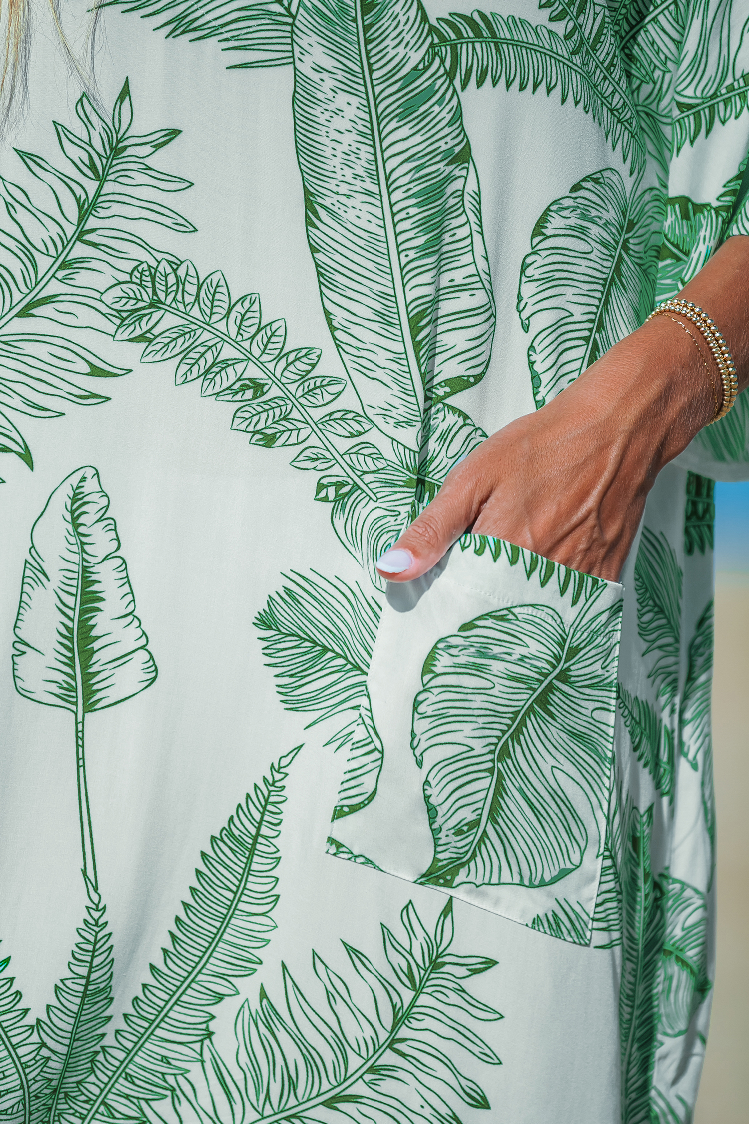 Grün-weißes Cover-Up-Kleid mit V-Ausschnitt und Palmblatt