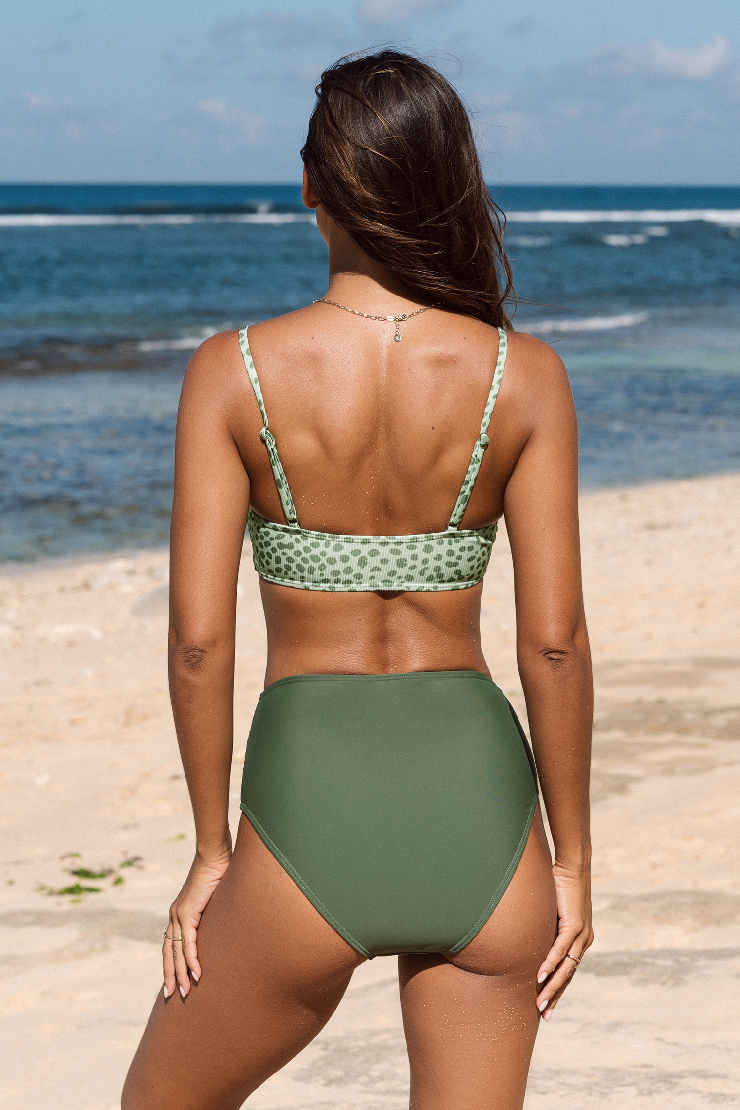 Grünes Leoparden-Bikini-Oberteil und gerüschte Bikinihose