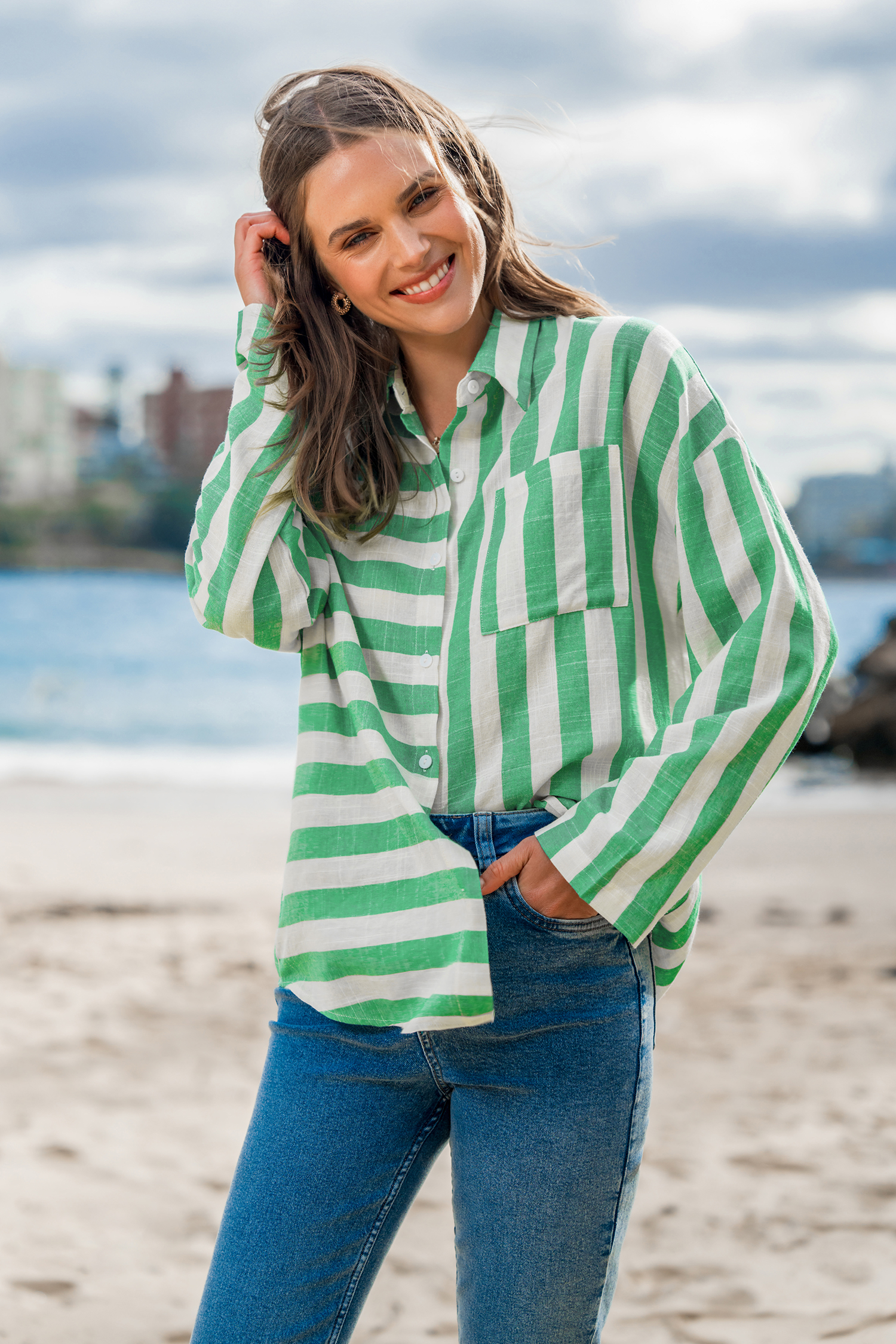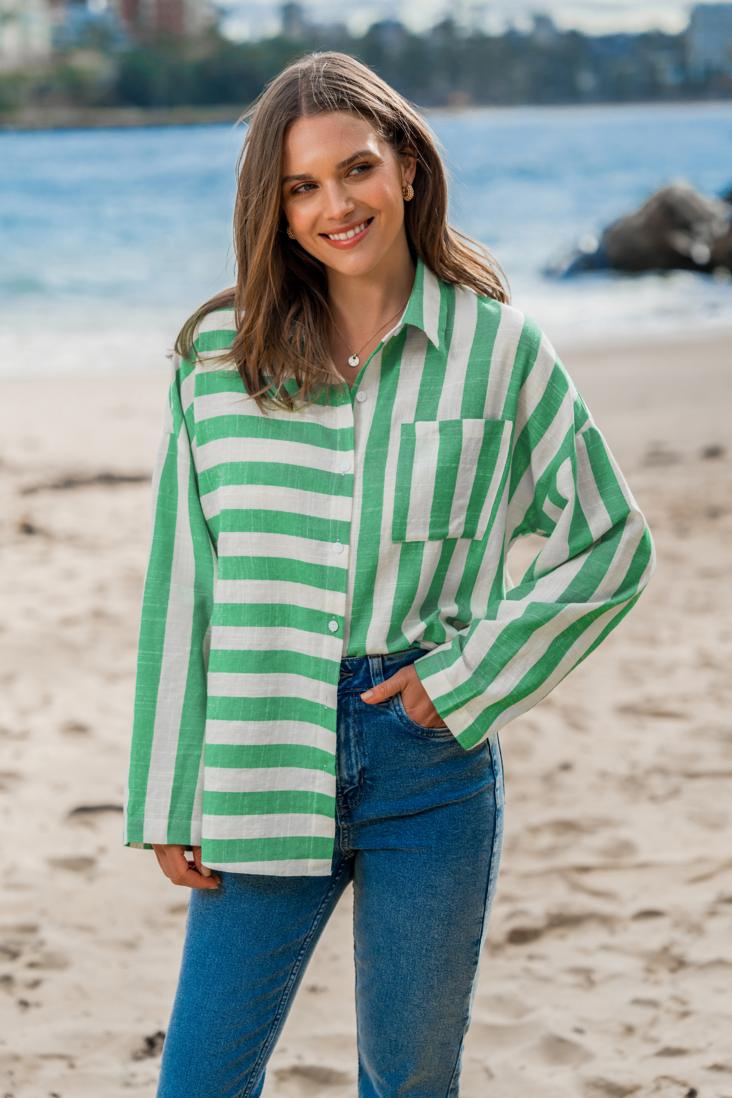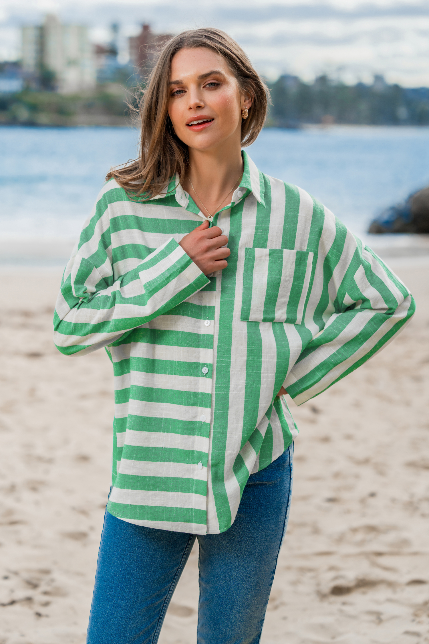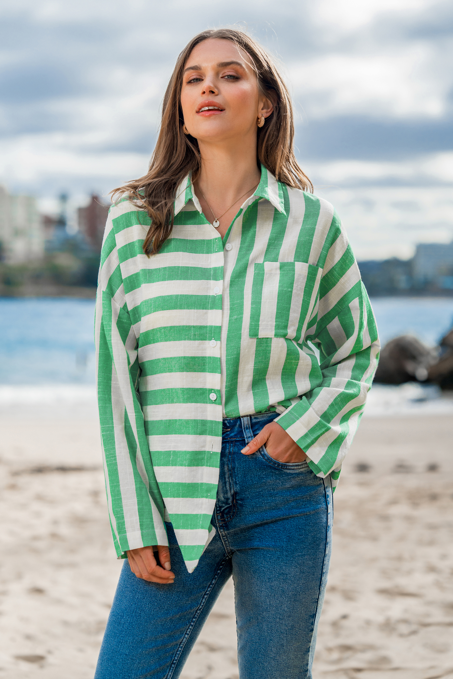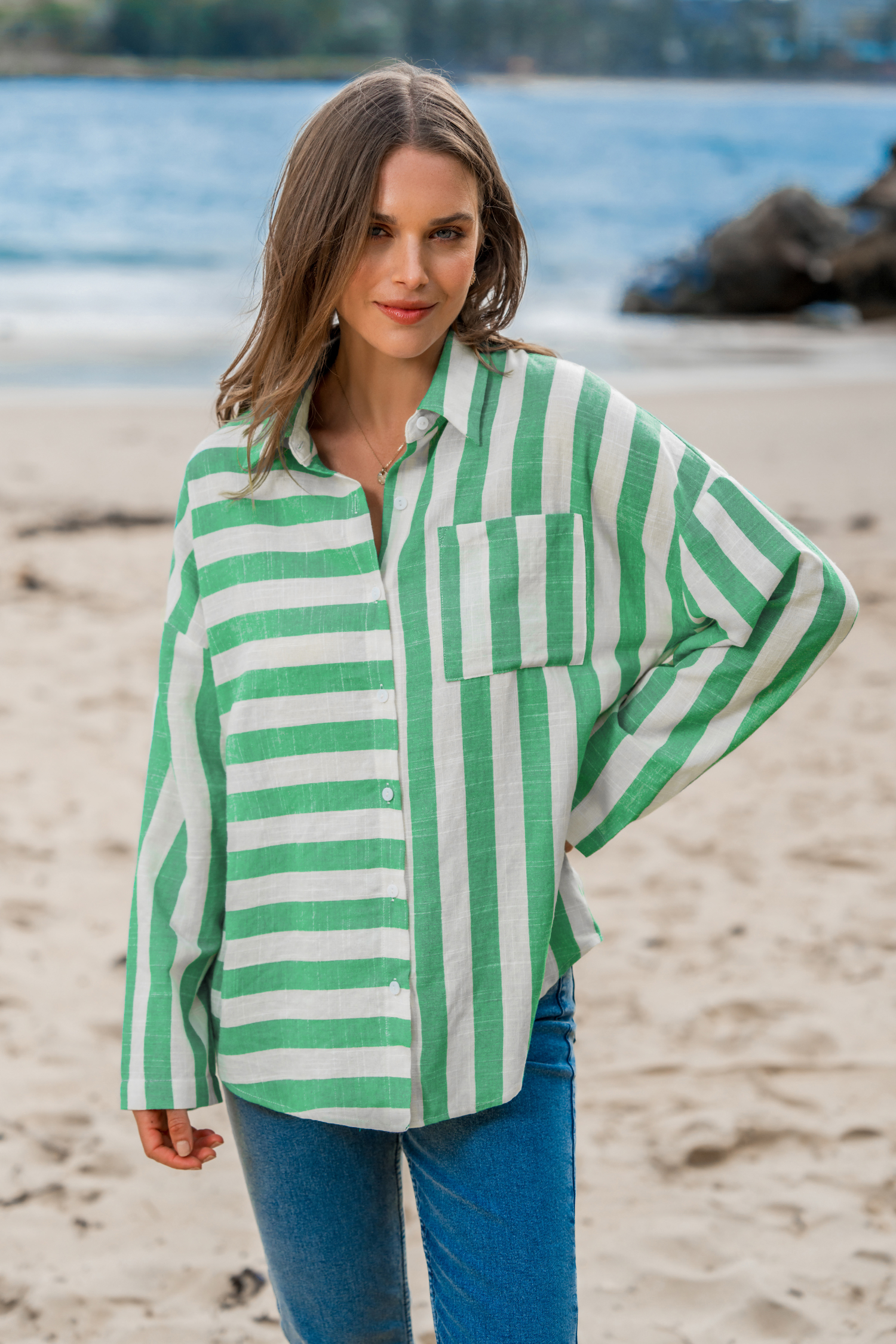 Grünes Hemd mit gemischten Streifen und Knopfleiste