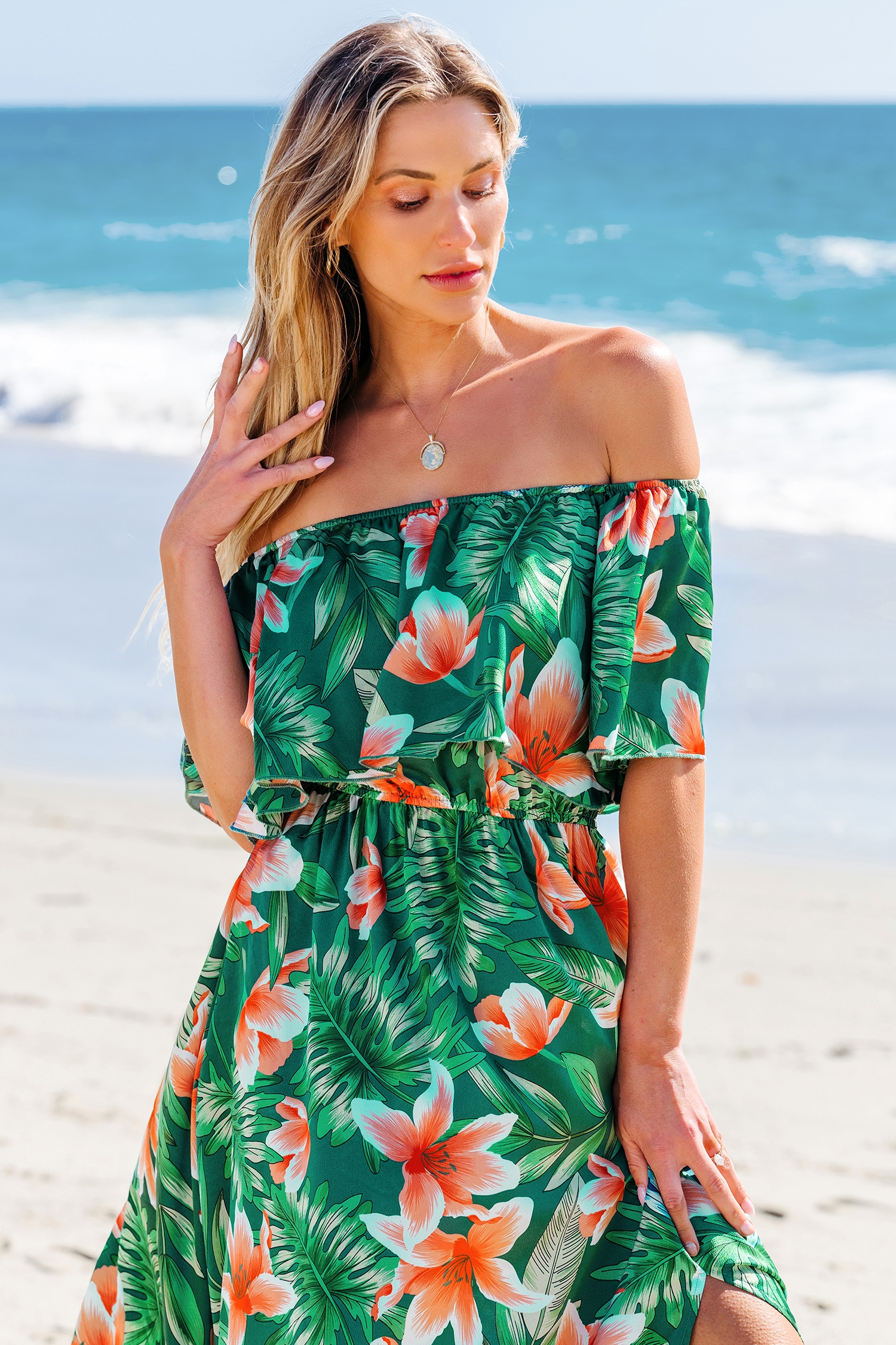 Grünes & orange tropisches schulterfreies Maxikleid mit Volant