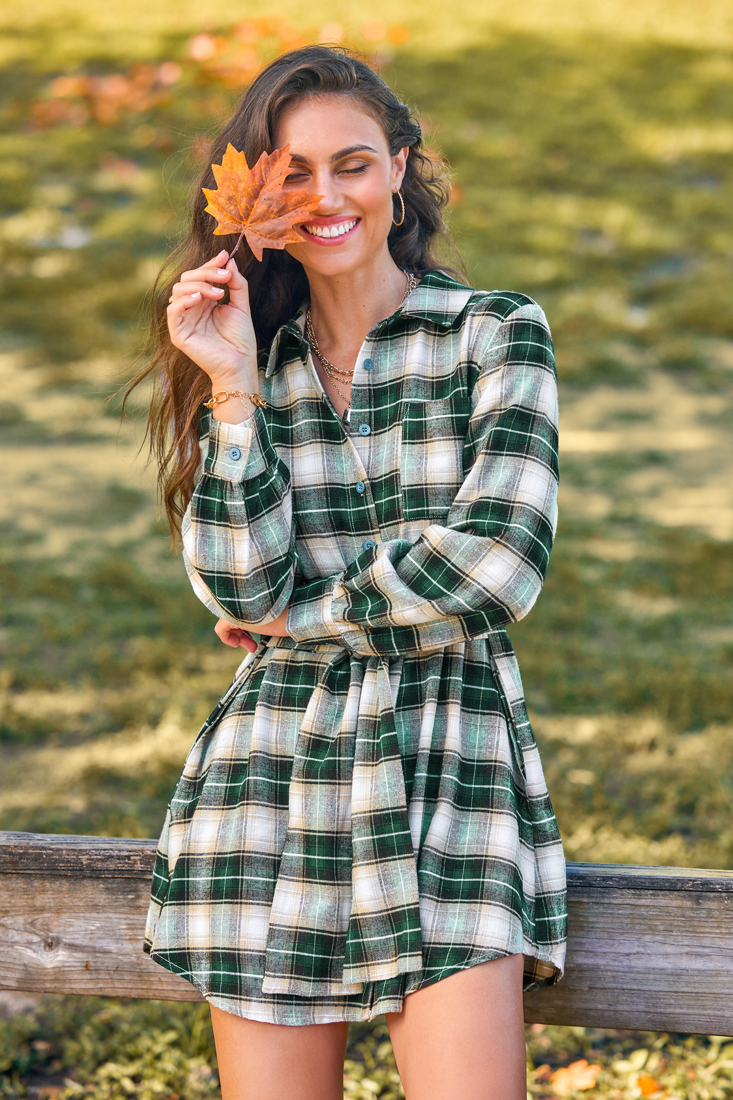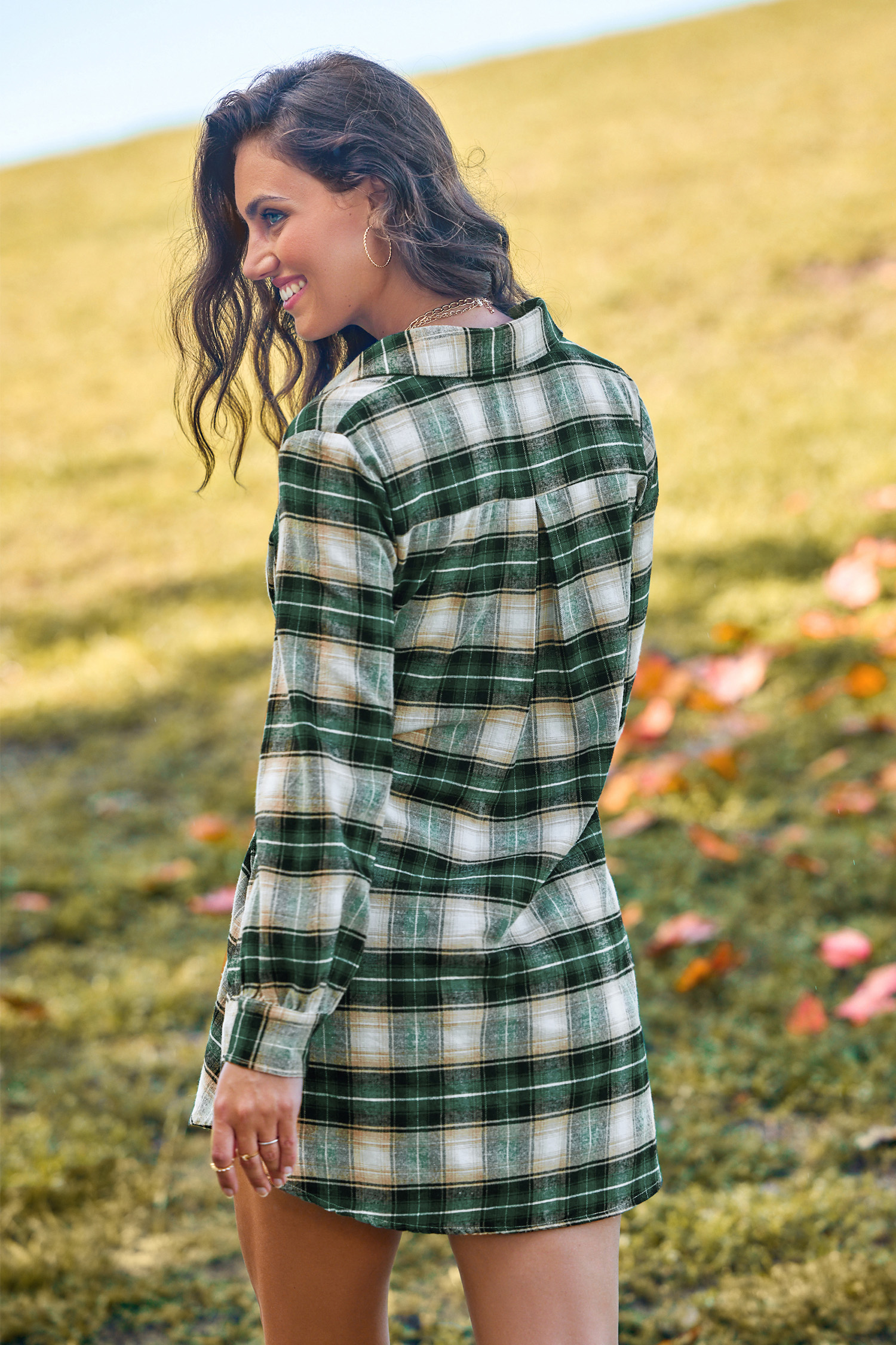 Grün kariertes Mini-Hemdkleid mit Knopfleiste und Kragen