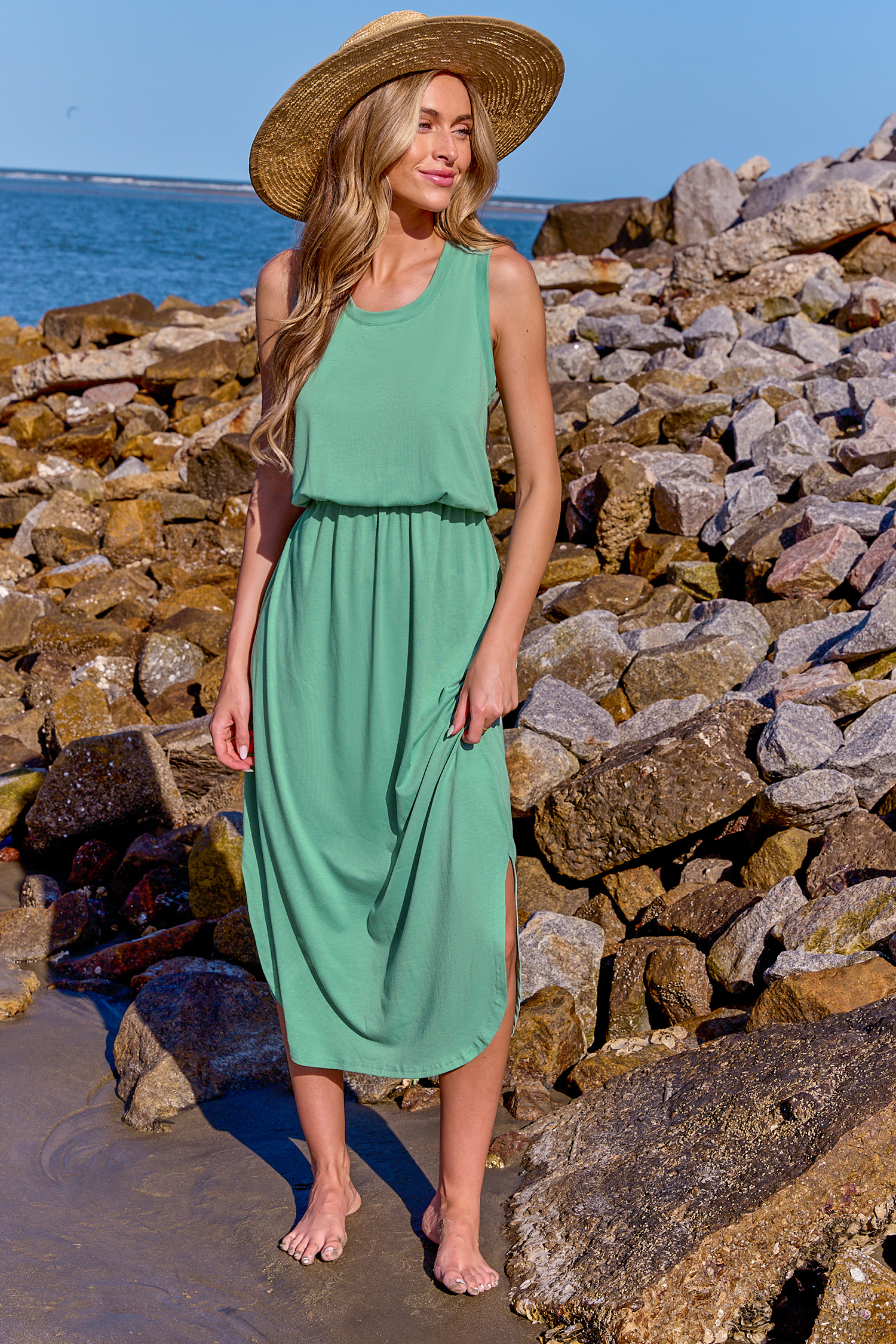 Grünes ärmelloses Midikleid mit Rundhalsausschnitt